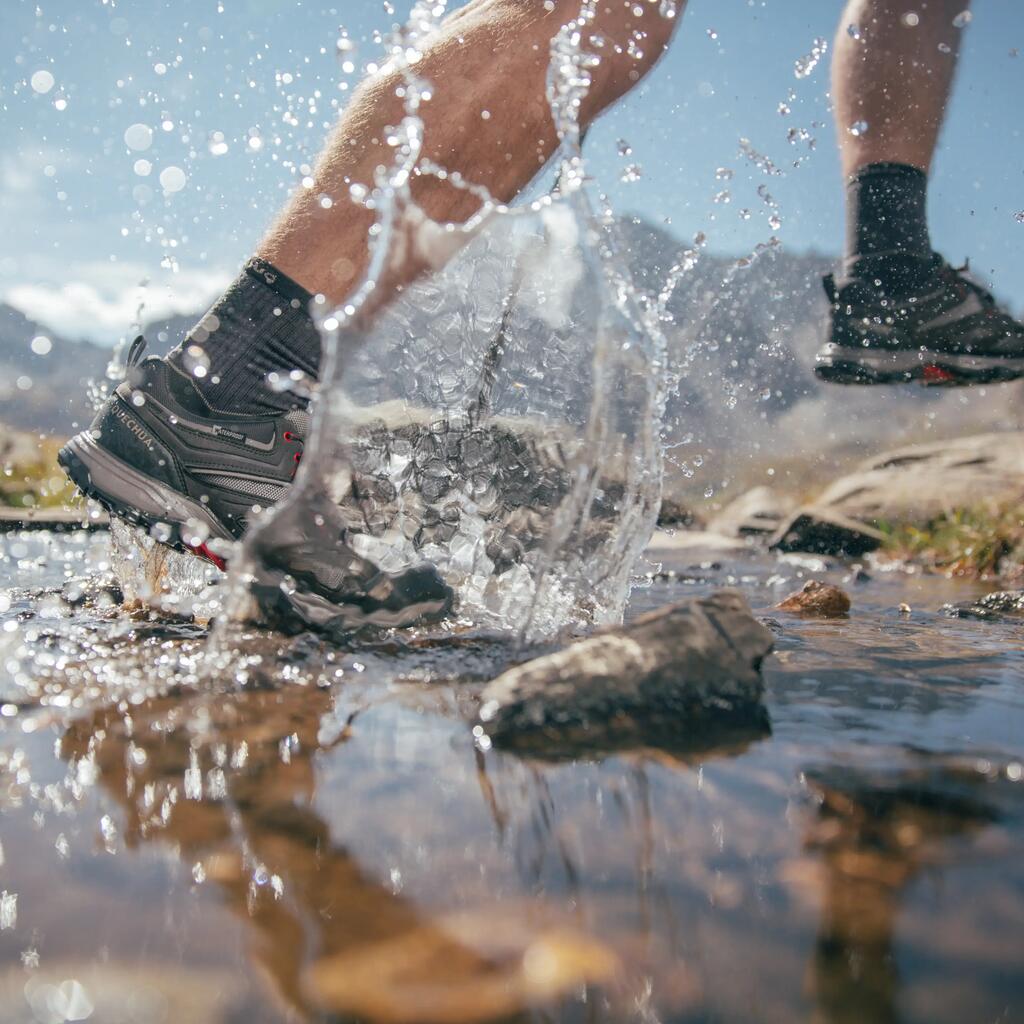 Da bi stopala ohranili suha, obujte vodoodporne ali kratke gamaše, ki prekrijejo zgornji del čevlja in preprečijo vdor vode, kamenčkov in peska. Priporočamo, da vodoodpornost dvakrat letno obnovite s pomočjo spreja za zagotavljanje vodoodpornosti (najdete ga na Decathlonovi spletni strani), s katerim boste obnovili vodoodbojnost in preprečili pojav madežev.