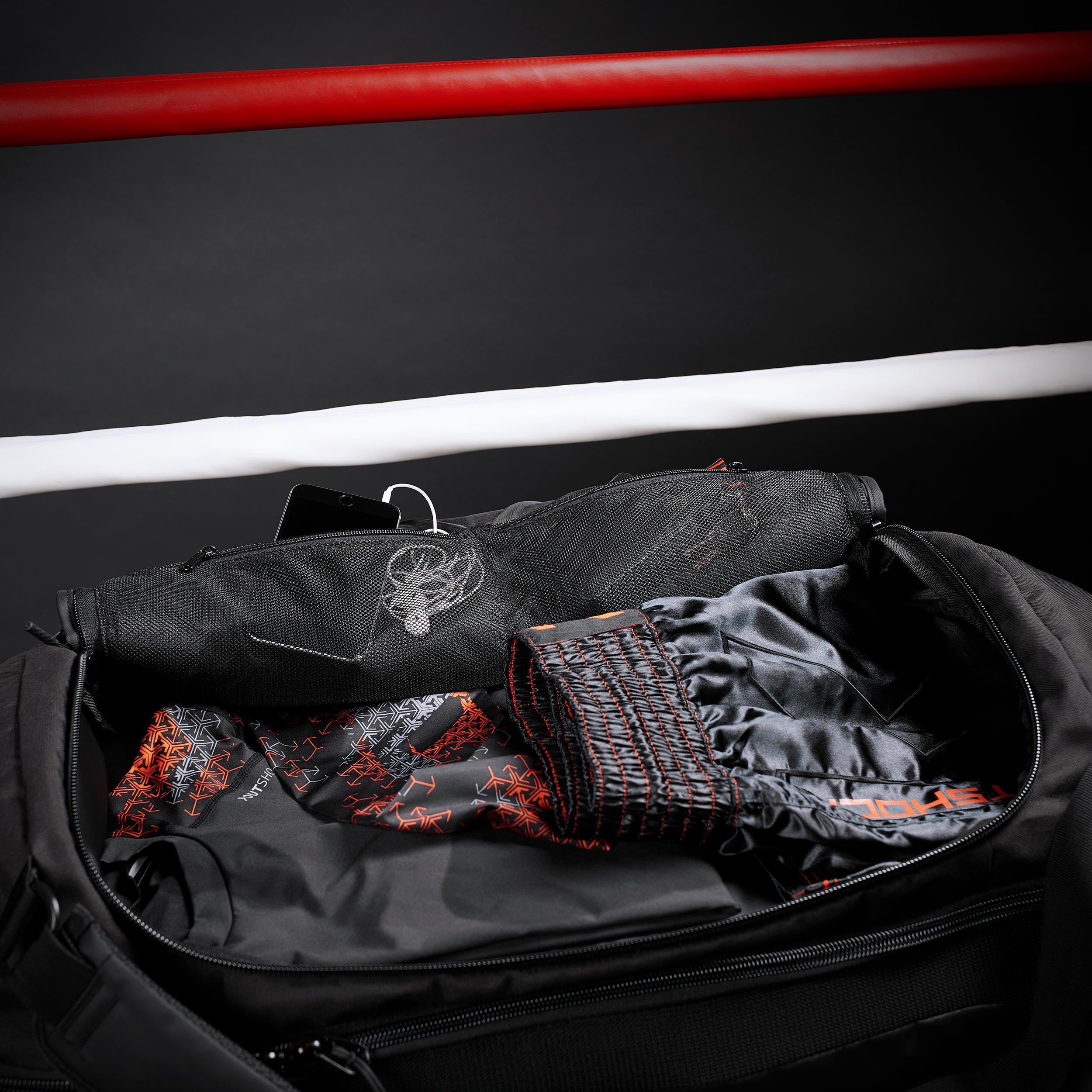 Julien, produktni vodja OUTSHOCK, predstavlja športno torbo 900: Idejo smo dobili v boksarskih dvoranah, kjer so vsi imeli svojo opremo razmetano po tleh. Za boks potrebujete veliko opreme. Hoteli smo izdelati praktičen in tehničen izdelek. Pogosto začnete s kolebnico, nato zgrabite svoje trakove in ščitnik za zobe. Zato smo želeli žep za majhne predmete.«