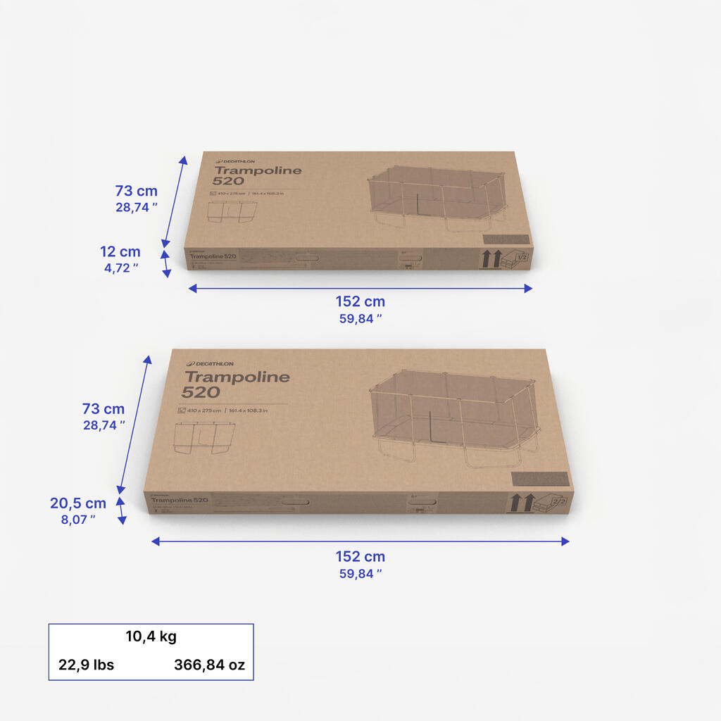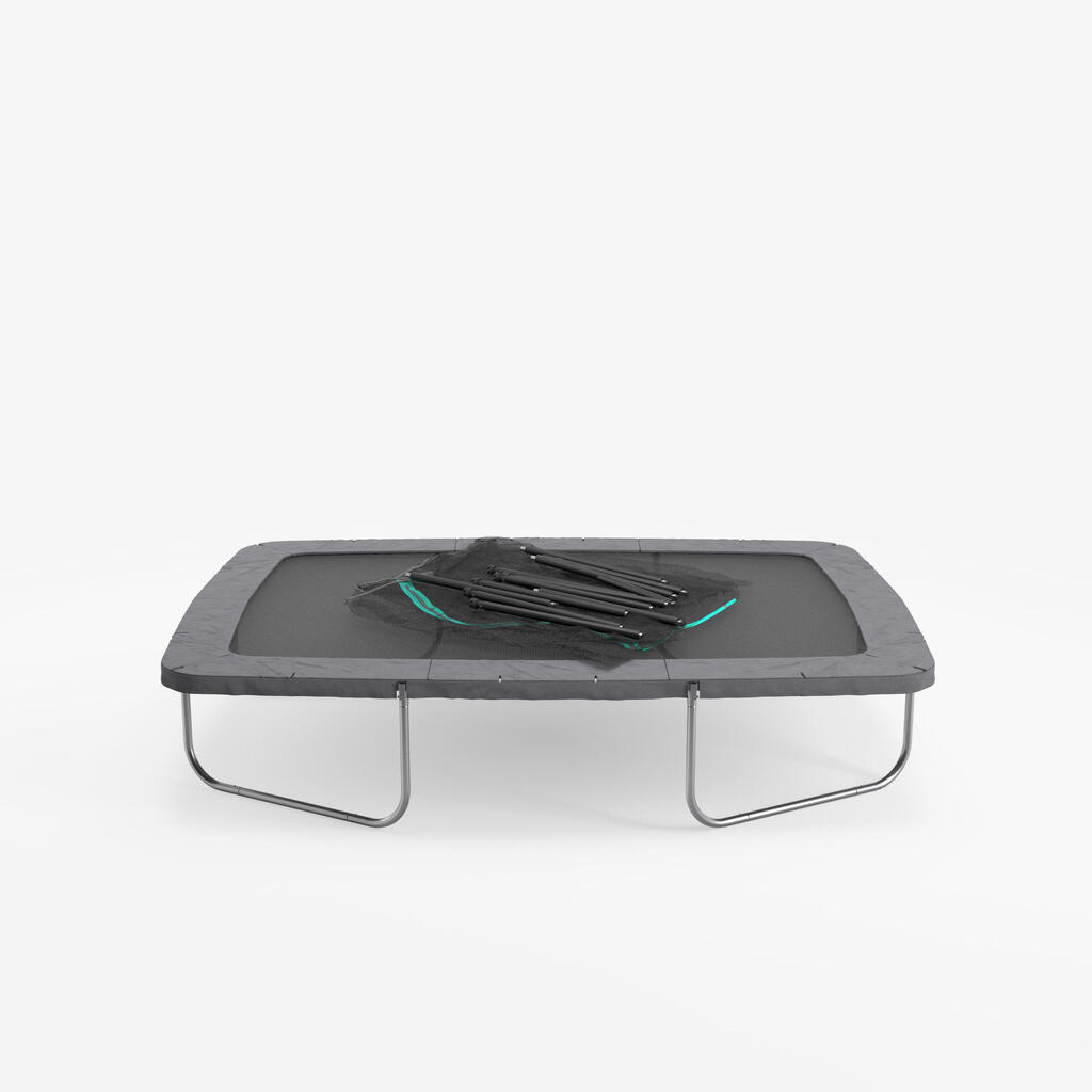 Dimenzije trampolina: 4,07 x 2,95 m. Velikost skakalne ponjave: 8,1 m² (3,54 x 2,28m).