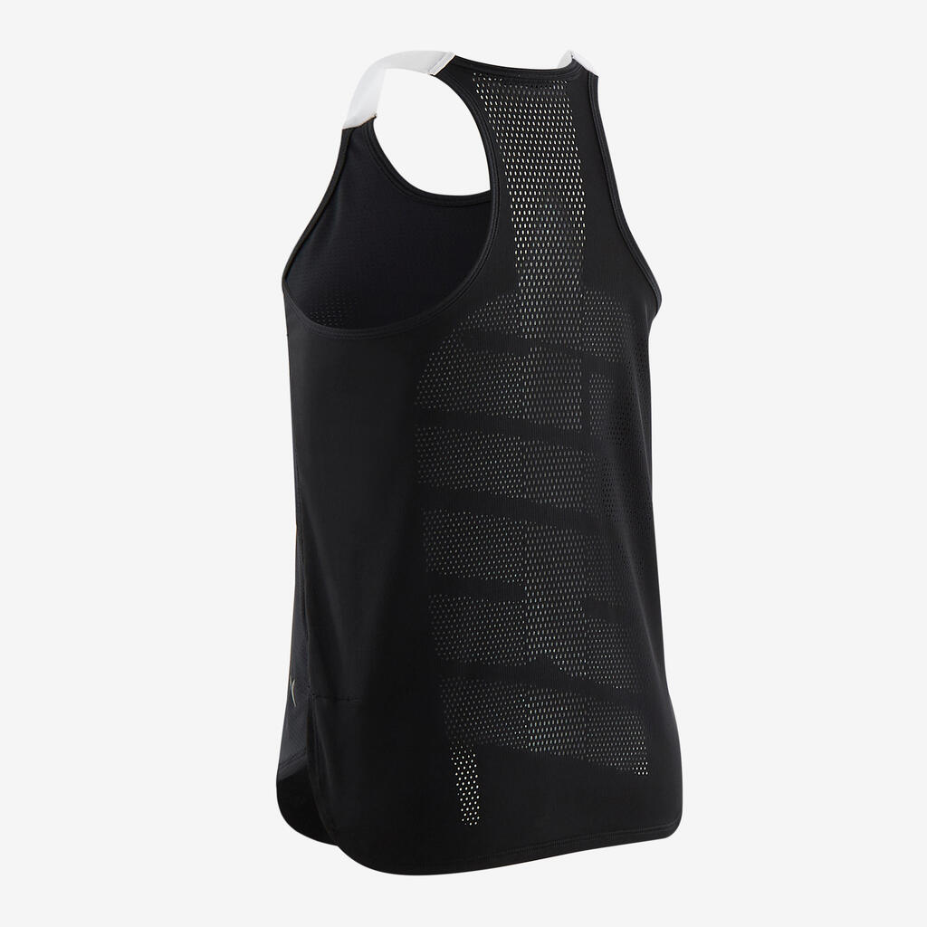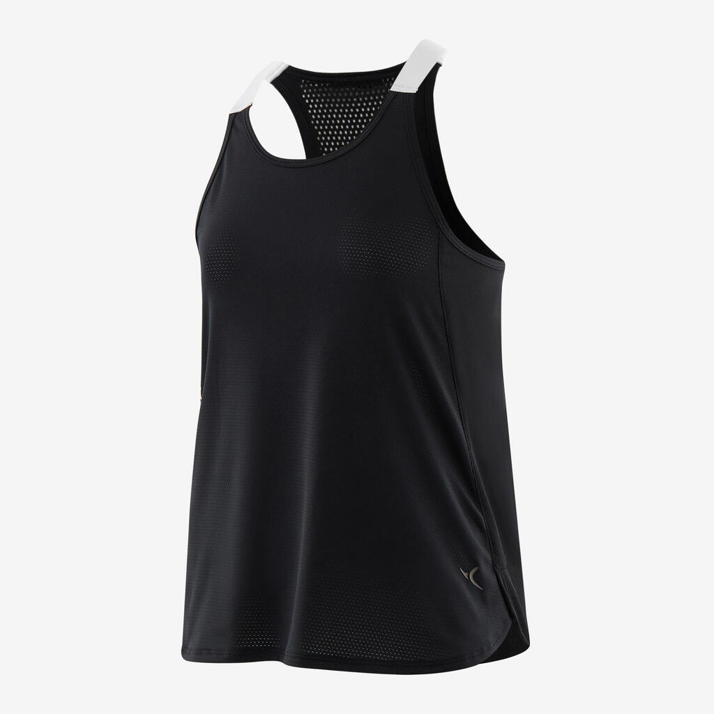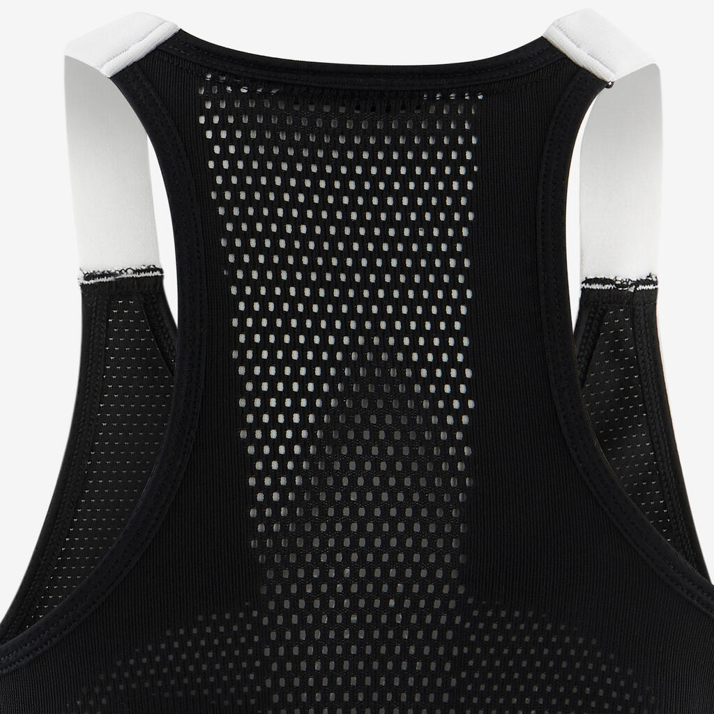 Kaj je tehnika načrtovanja telesa, ki se uporablja pri tej majici? Material je tkan tako, da so ustvarjeni zračni deli v predelih, kjer se več potimo. Načrtovanje se izogiba delom s šivi med različnimi materiali, saj lahko stkemo različne oblike "odprtin" na eni površini materiala. Na hrbtu je oblikovan napis "girl". Tehnični zaključki z elastičnimi naramnicami.