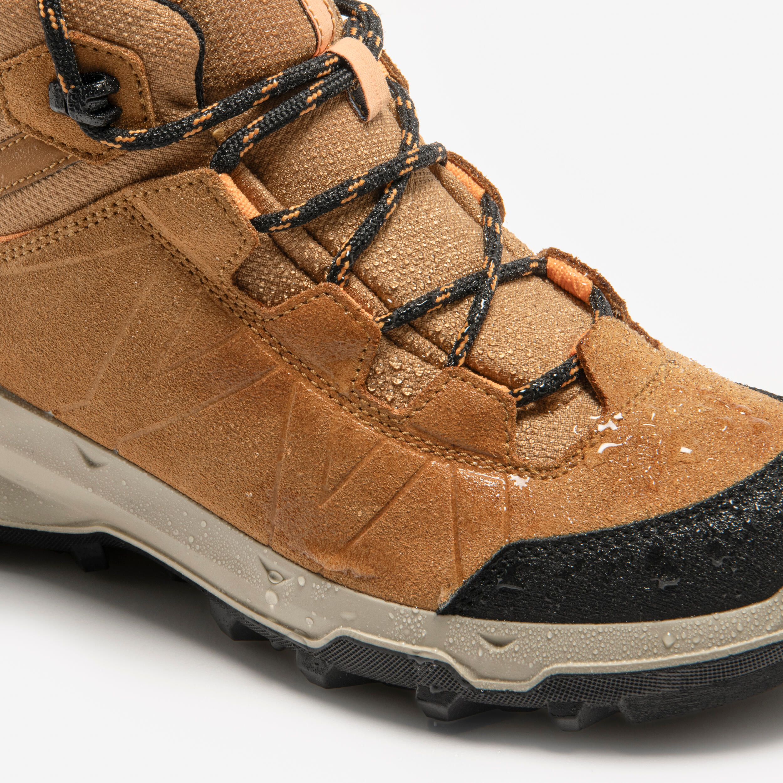 Čeprav so čevlji vodoodporni, voda vanje pogosto prodre z vrha. Da boste stopala dlje časa ohranili suha, obujte vodoodporne gamaše ali nizke gamaše, ki preprečijo vdor vode, kamenčkov, peska itd. Priporočamo, da čevlje večkrat letno popršite s sprejem za zagotavljanje vodoodpornosti, s katerim boste obnovili vodoodpornost in preprečili pojav madežev.