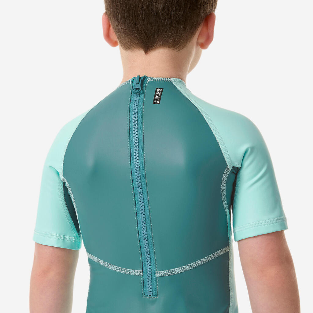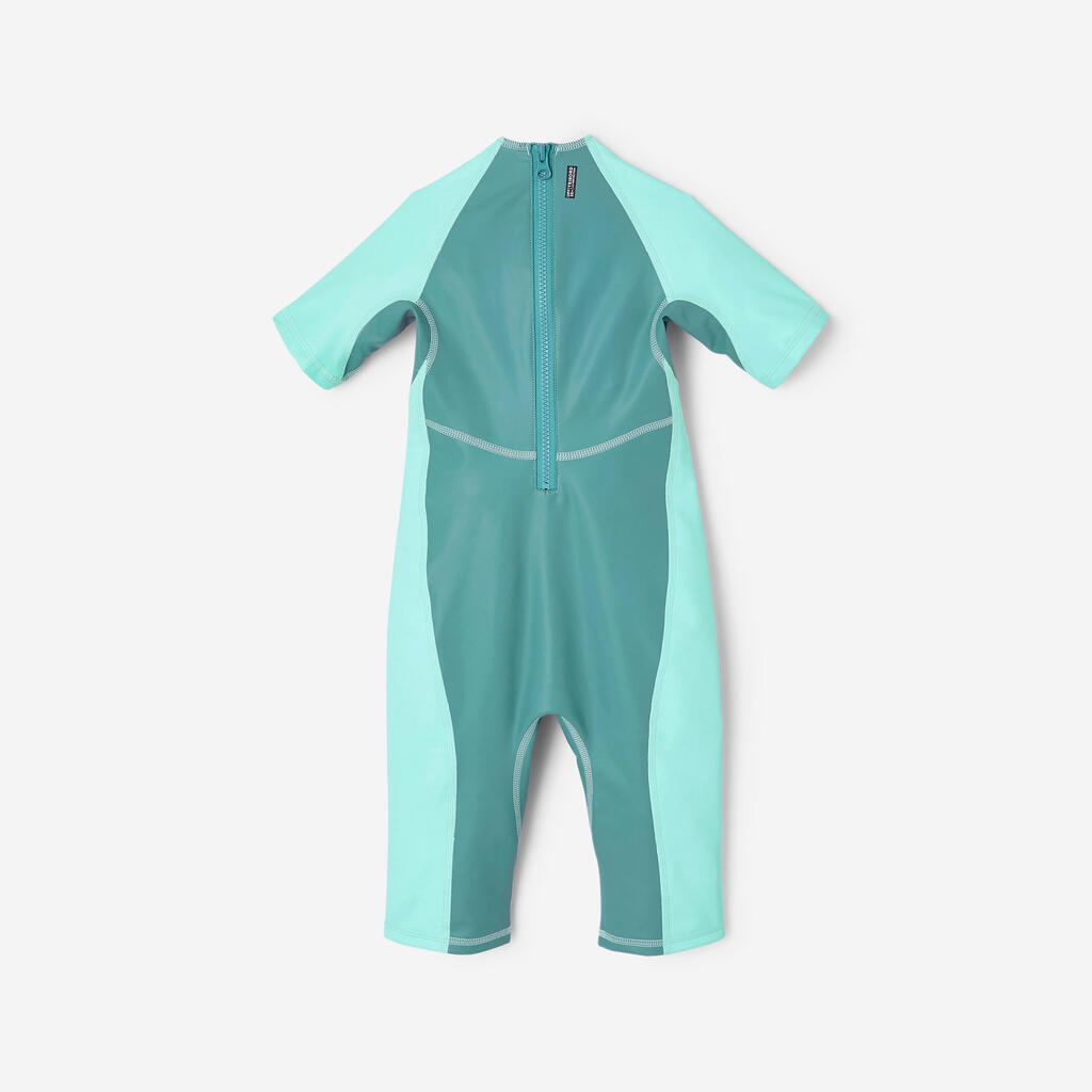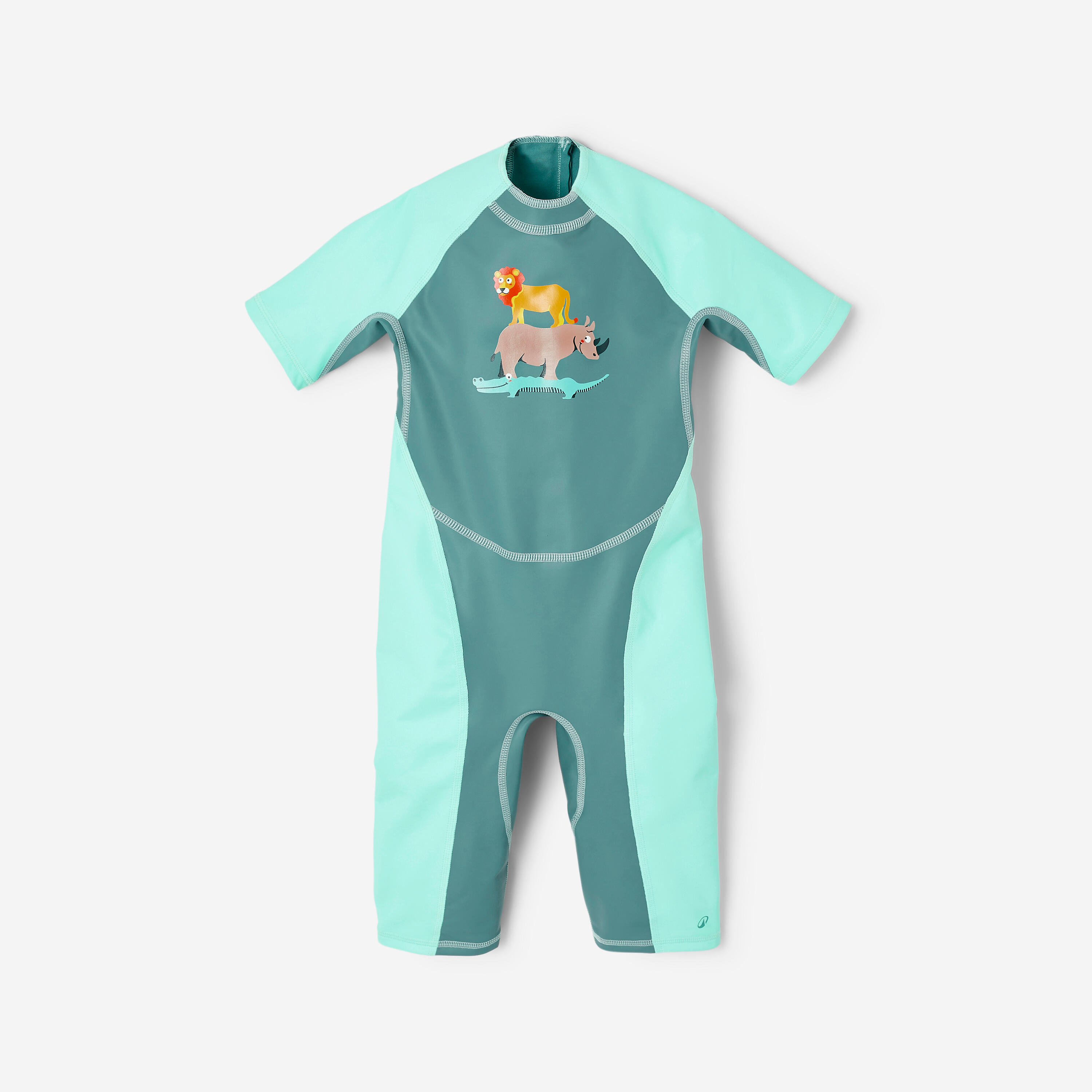 Čeprav ta otroška neoprenska plavalna obleka z UV-zaščito zagotavlja zaščito pred soncem, je treba upoštevati druge dejavnike, kot so odsevi (od vode, peska itd.), vročina, čas v dnevu itd. Vseeno upoštevajte ustrezne nasvete: nosite sončna očala, redno nanašajte primerno kremo za sončenje, nosite pokrivalo, redno pijte ipd.