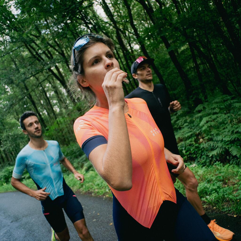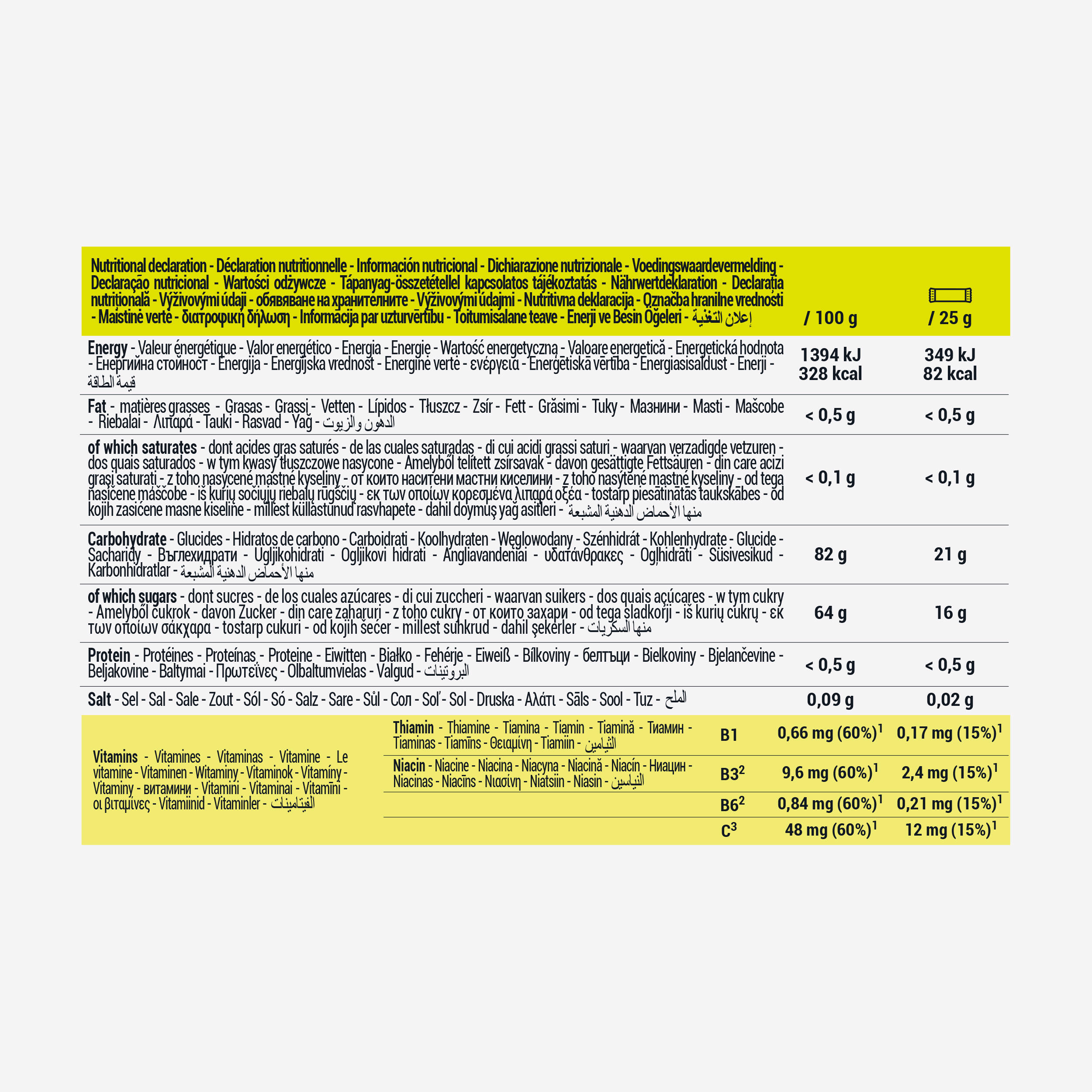60 g ogljikovih hidratov (=sladkorja) na uro športa: to priporočajo nutricionisti za vadbo, ki traja več kot 3 ure. Ta 25 g sadni gel vsebuje 21 g ogljikovih hidratov, vključno s 16 g enostavnih sladkorjev. Zato priporočamo, da poleg izotonične pijače zaužijete prvo ploščico po 30 minutah aktivnosti, torej dve na uro (ali eno + gel/ploščico).