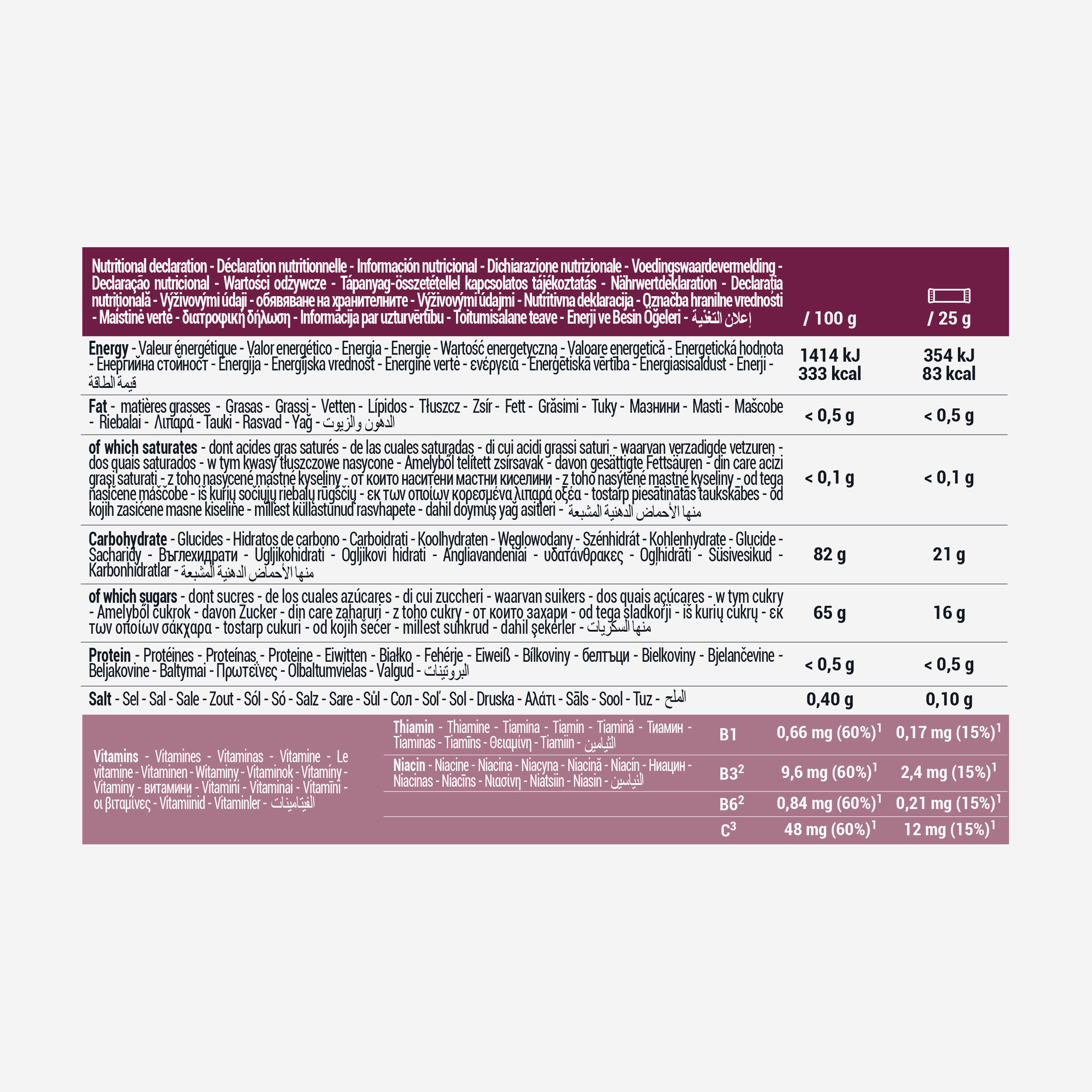 60 g ogljikovih hidratov (=sladkorja) na uro športa: to priporočajo nutricionisti za vadbo, ki traja več kot 3 ure. Ta 25 g sadni gel vsebuje 21 g ogljikovih hidratov, vključno s 16 g enostavnih sladkorjev. Zato priporočamo, da poleg izotonične pijače zaužijete prvo ploščico po 30 minutah aktivnosti, torej dve na uro (ali eno + gel/ploščico).