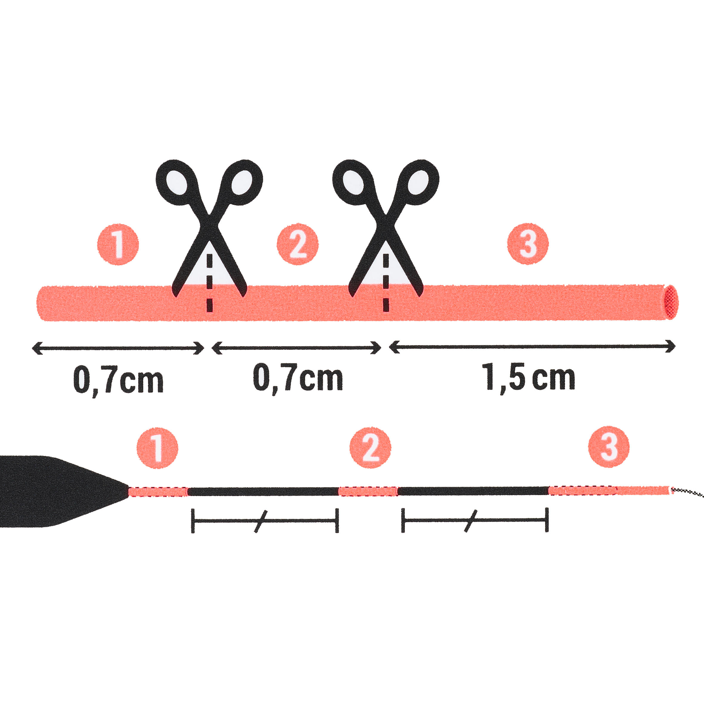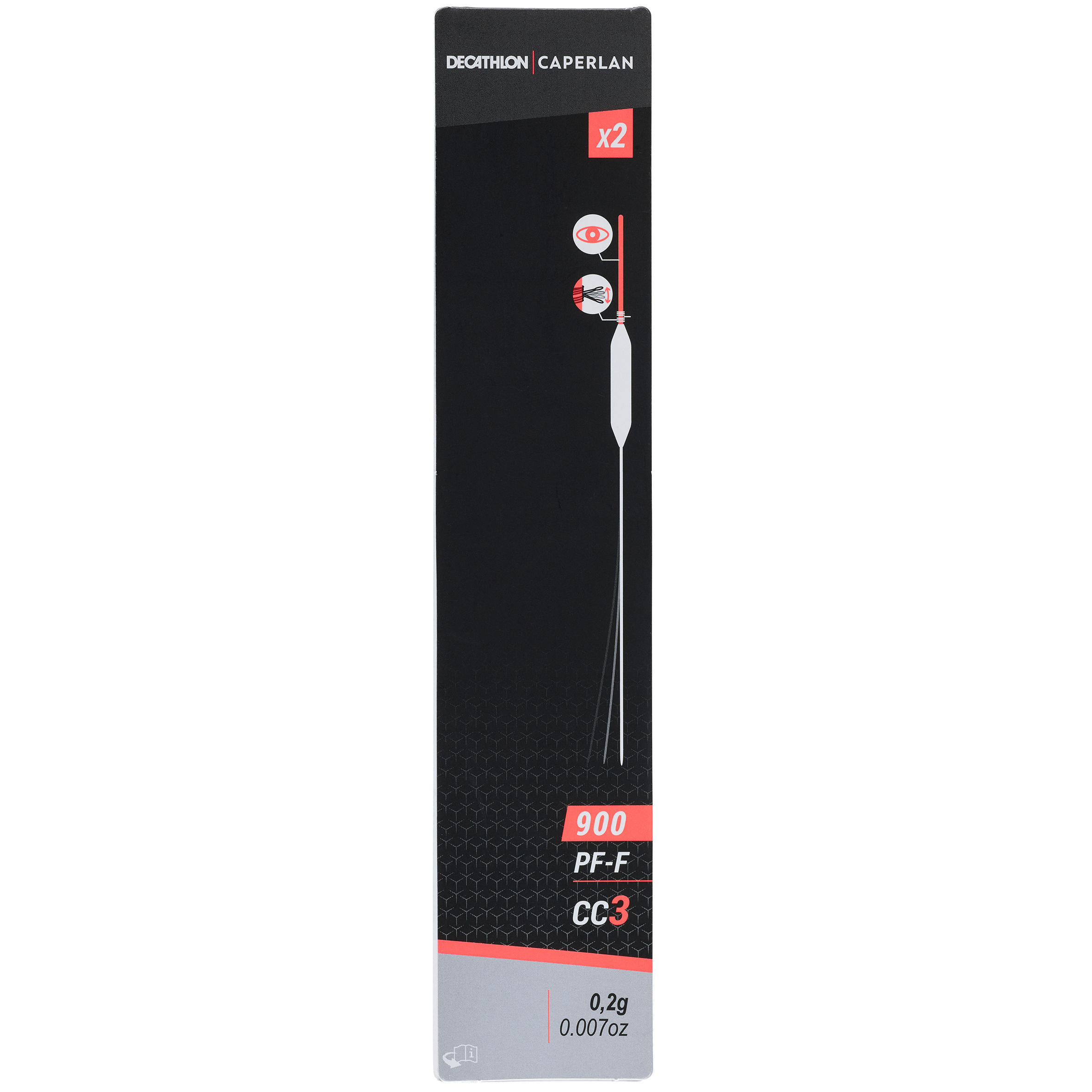 Telo: Pena Rohacell®. Oranžna antena iz vlaken. Gred iz steklenih vlaken s premerom 1 mm. Dva 3-cm prozorna silikonska ovoja. Osnovna barva telesa plovca: Bela.