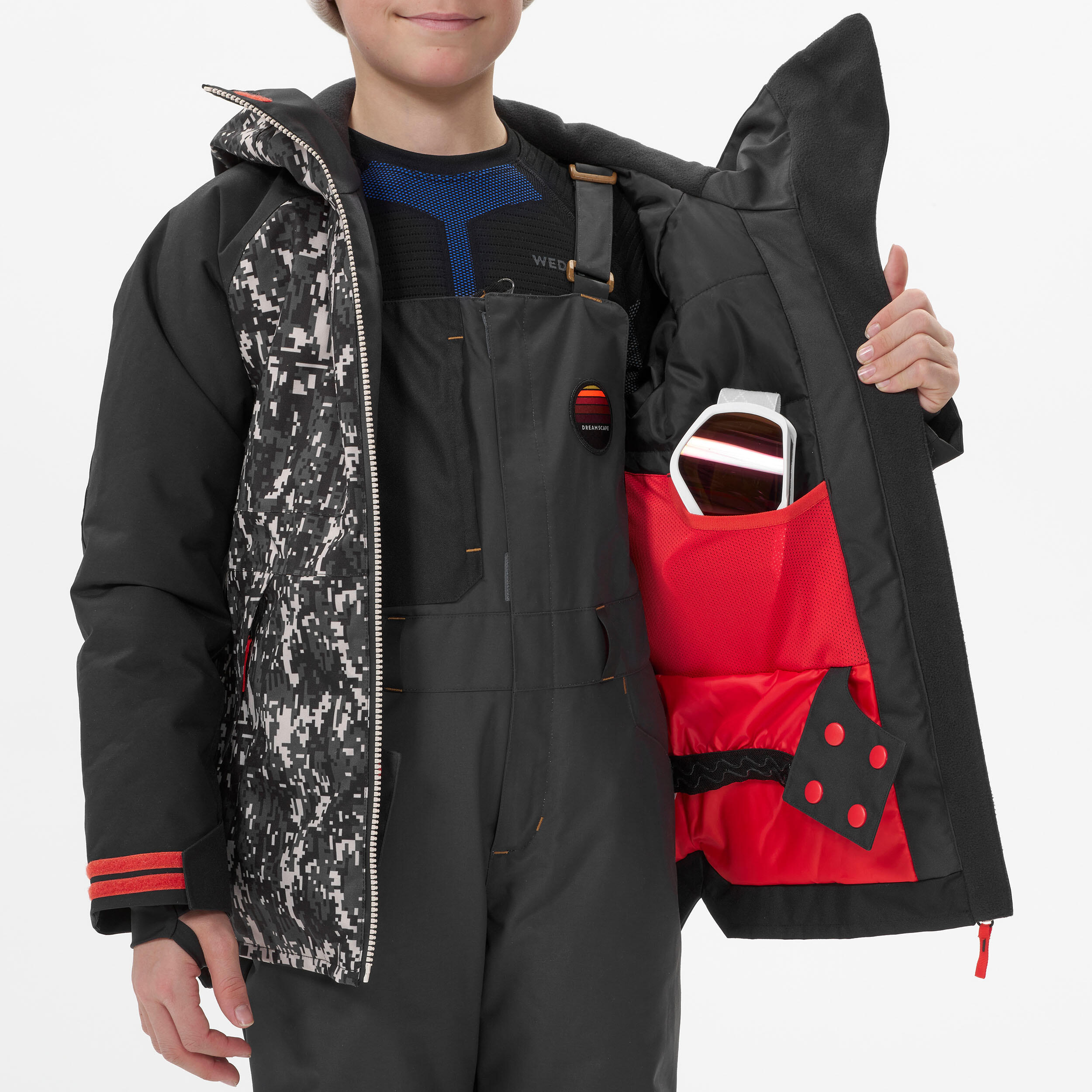 Jakna je zasnovana za redno deskanje. Na voljo ima naslednje žepe: