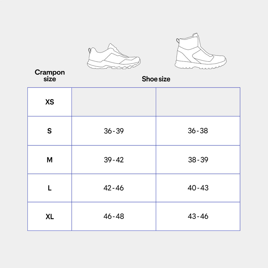 Izbira velikosti je odvisna od vrste obutve. Velikost se namreč razlikuje glede na to, ali nosite običajne čevlje, škornje ali zimske čevlje.