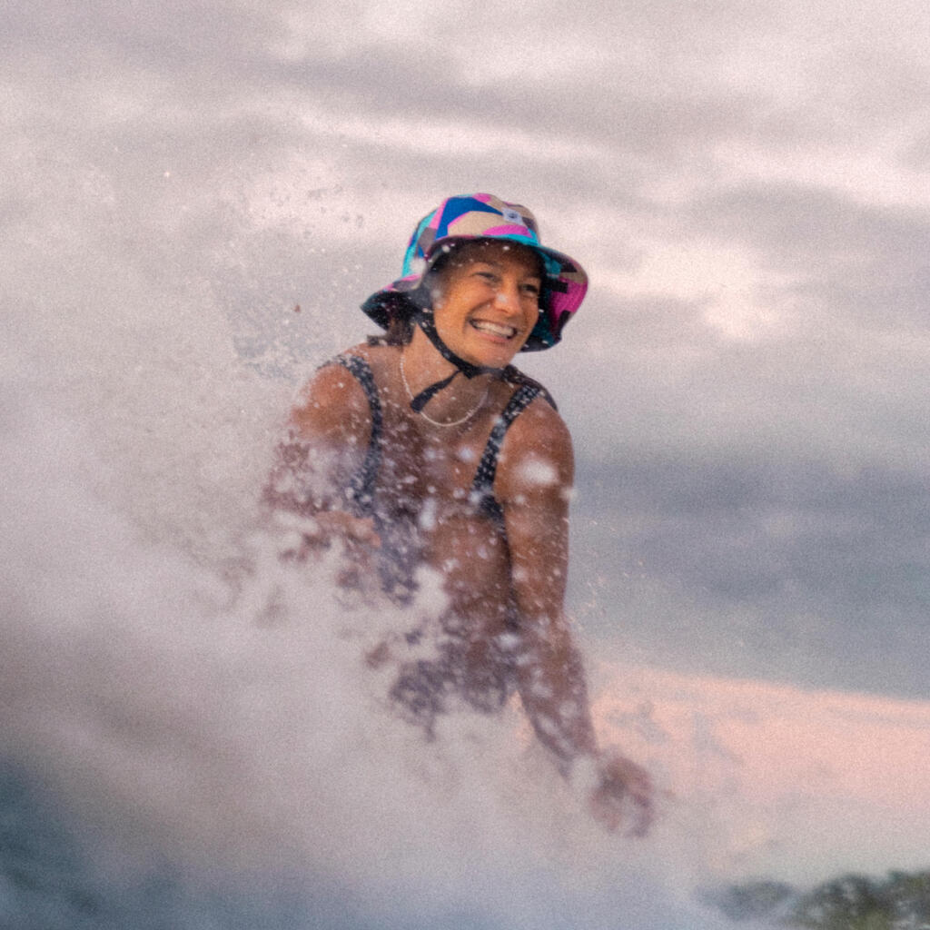 Odlična zaščita pred soncem. Mrežast material na zadnjem delu zagotavlja hitro odtekanje vode in sušenje.