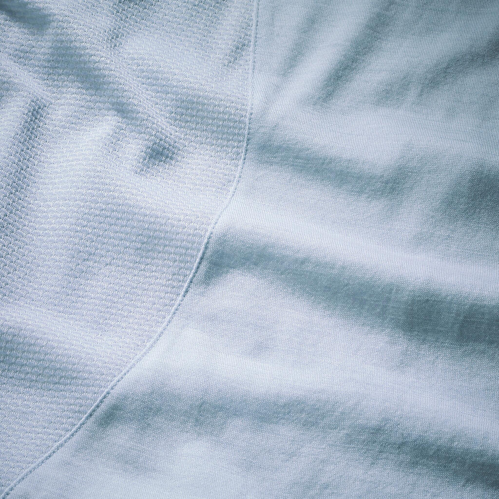 Mrežasti material iz merino volne pod pazduhami in na hrbtu zagotavlja dodatno zračnost na ključnih predelih. Za dodatno trpežnost smo volnene niti ovili s poliamidom.