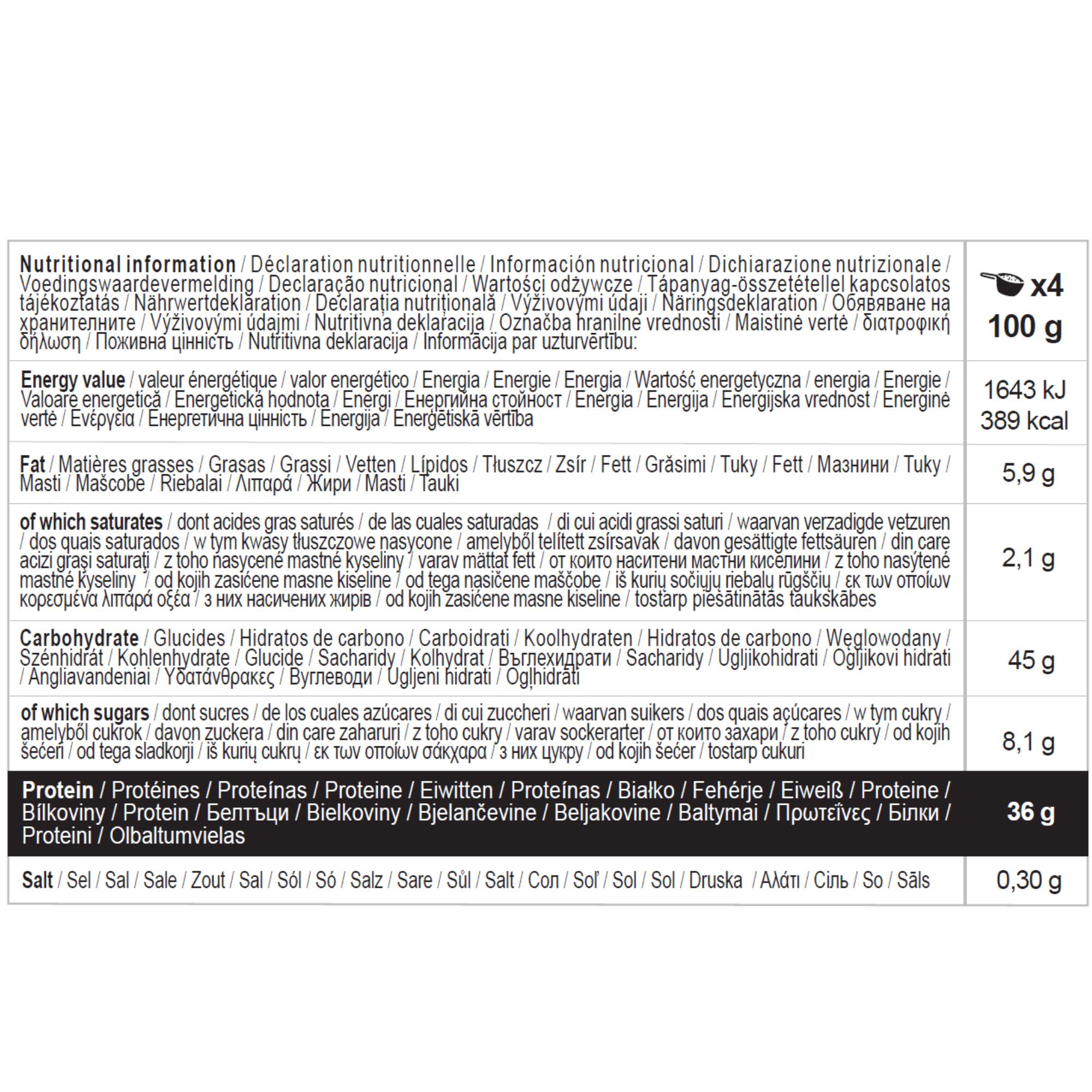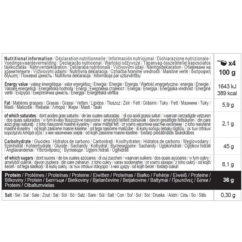 Napitek iz sirotke, ovsene moke, pšeničnega sirupa, kakava v prahu, naravne arome in pustega kakava v prahu.
