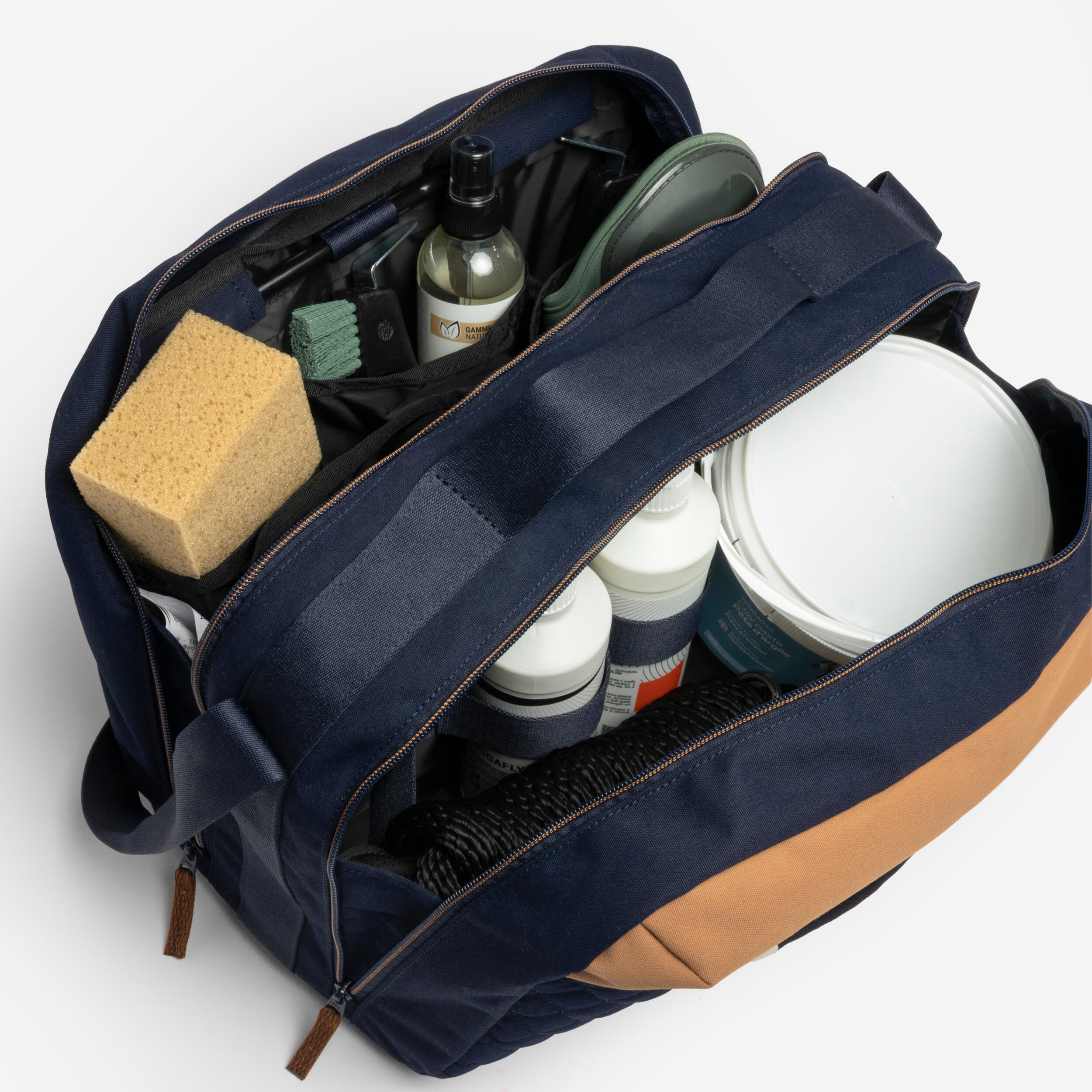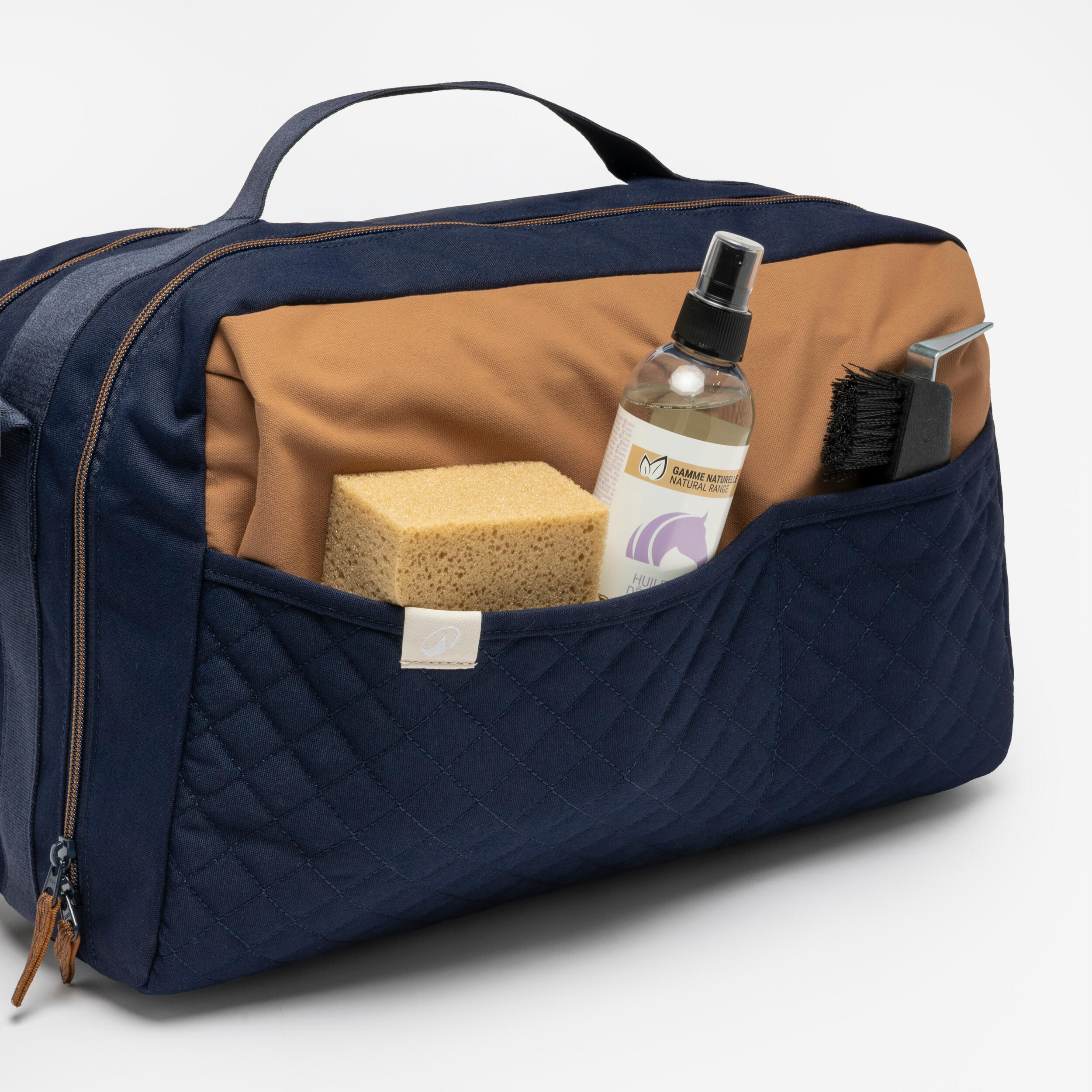 Torba je zasnovana za enostavno shranjevanje in prenašanje pripomočkov za nego konja.