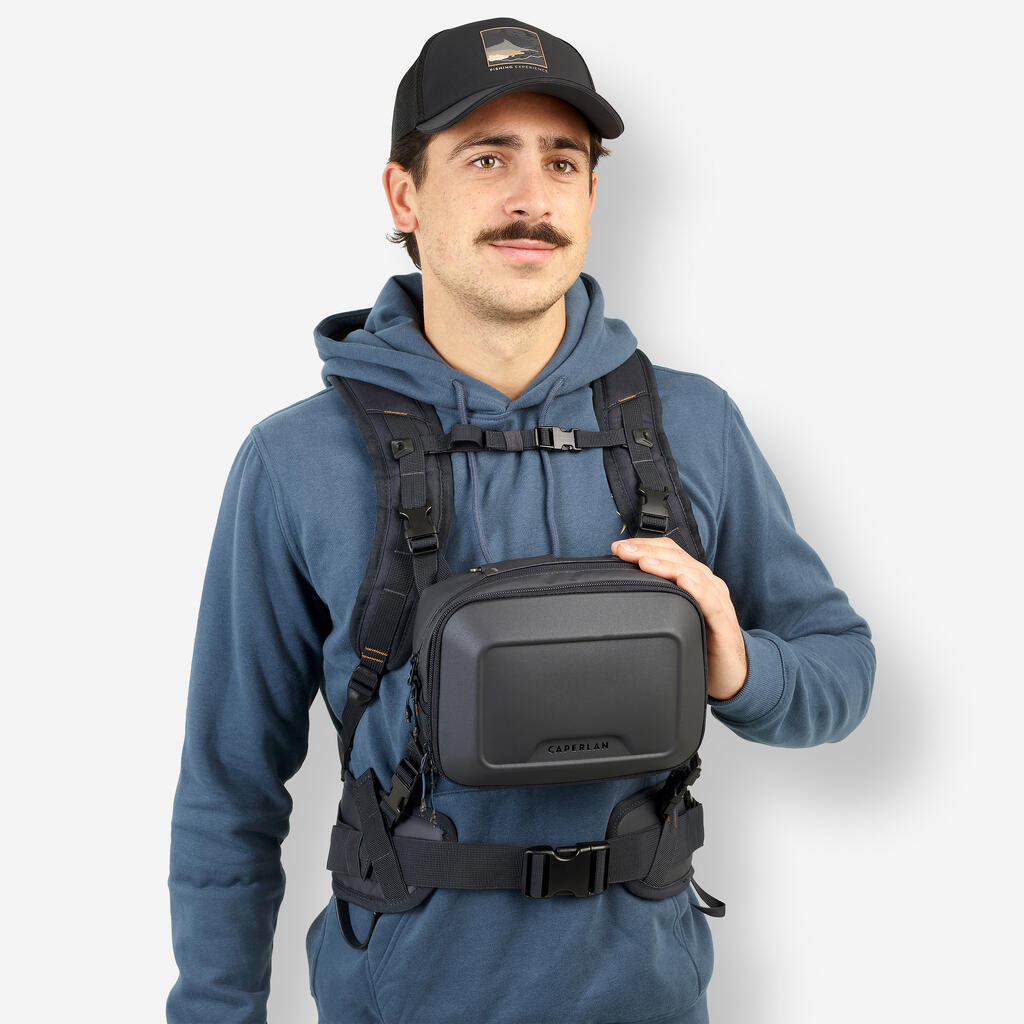 En termoformiran oblazinjen predal, ki se spremeni v montažno ploščo za hiter dostop do vaših vab in dodatkov. 1 mrežasti žep v tem predelku. 1 dodatni odprt žep v glavnem predelku.