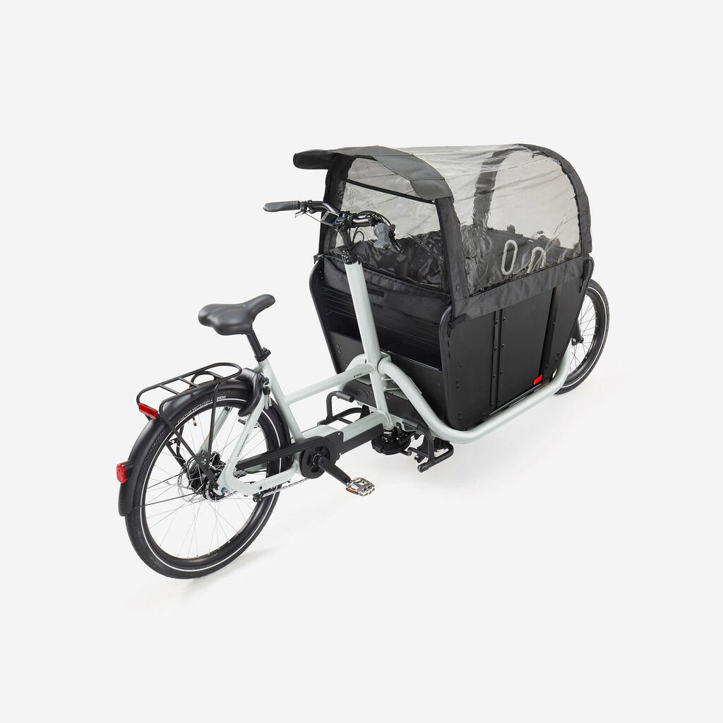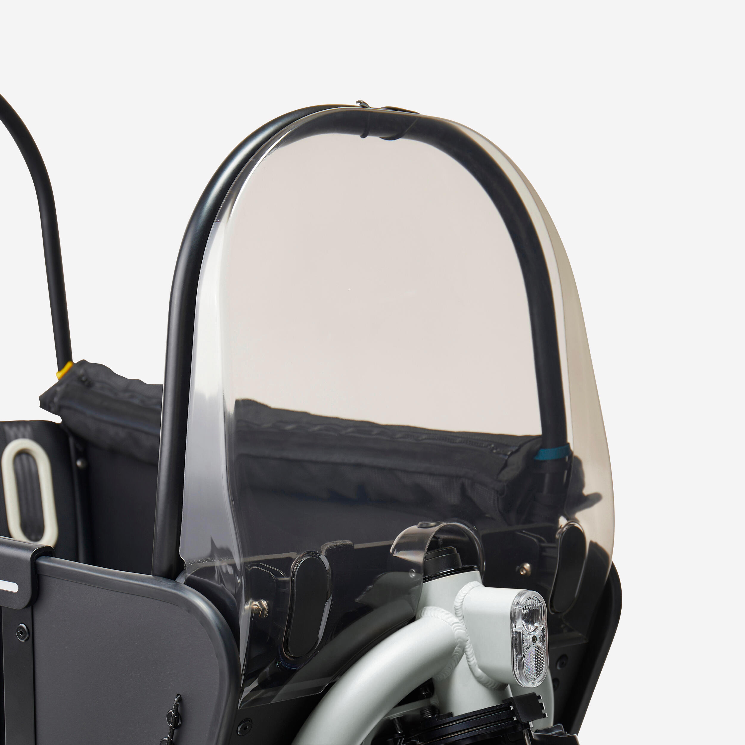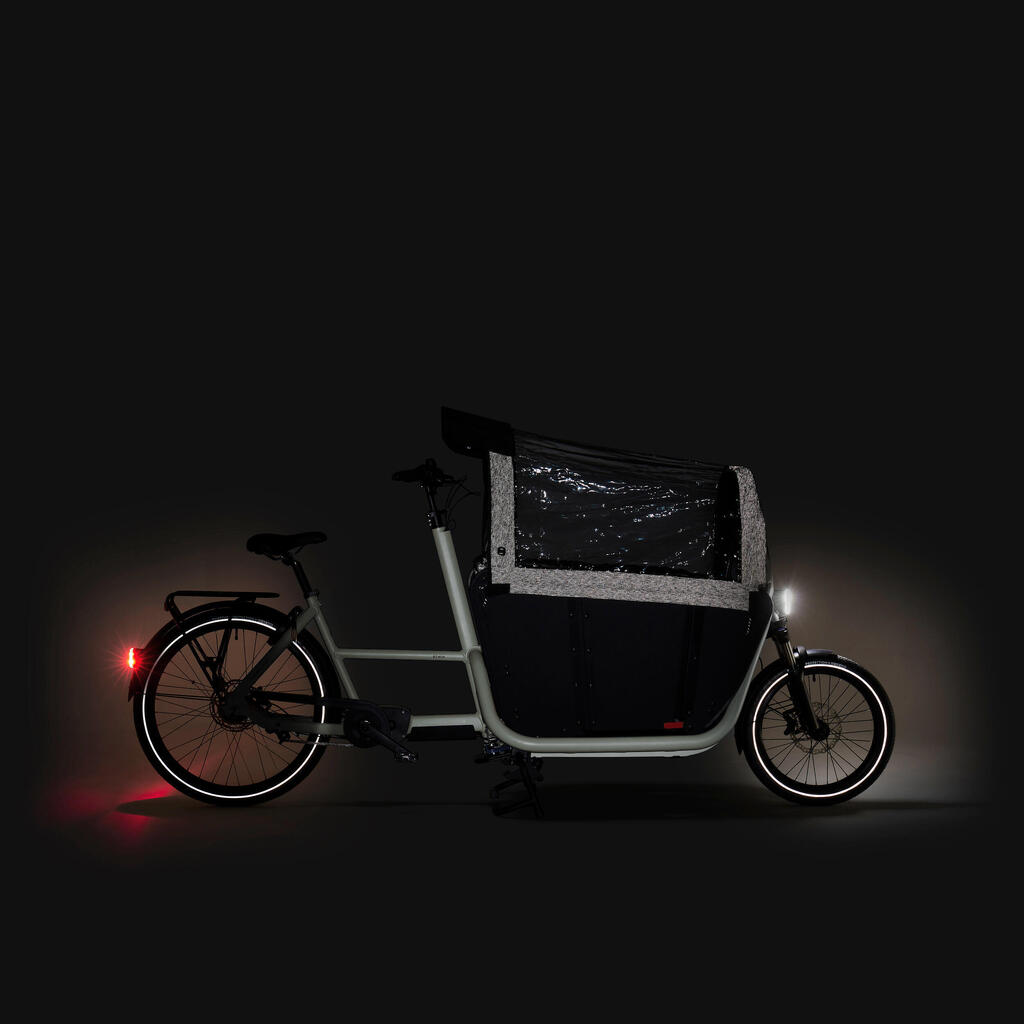 Za zaščito vaših otrok pred slabim vremenom smo zasnovali patentirano zaščito pred dežjem. Na kolesu je vedno na voljo. Drsni sistem omogoča zlaganje in razpiranje v nekaj sekundah. Za boljšo vidljivost ponoči je opremljeno z odsevniki in ima stranska držala za luči, kot je SL510 (referenca 8655159). Zaščita pred dežjem se podaljša nad vaše roke.