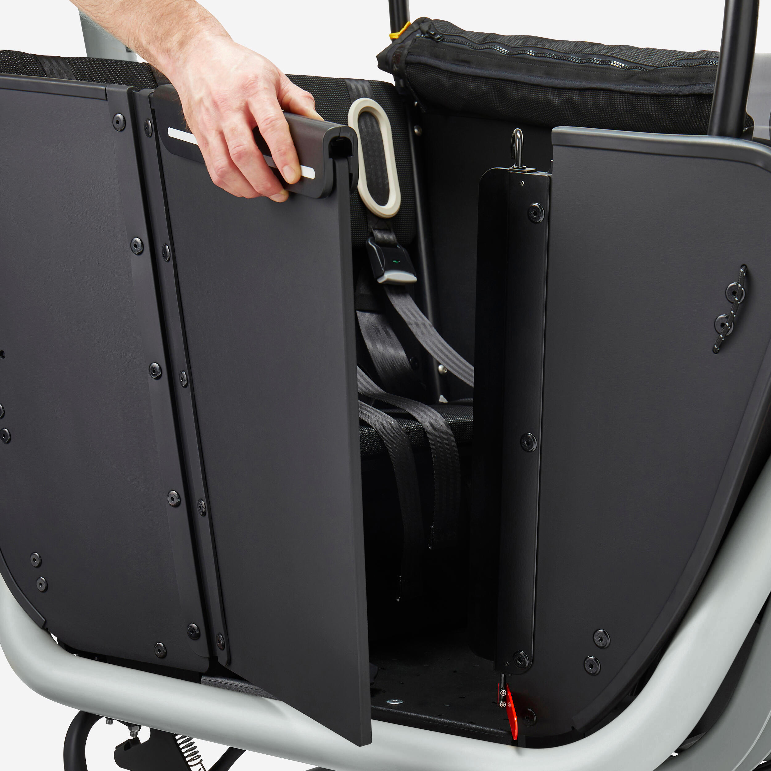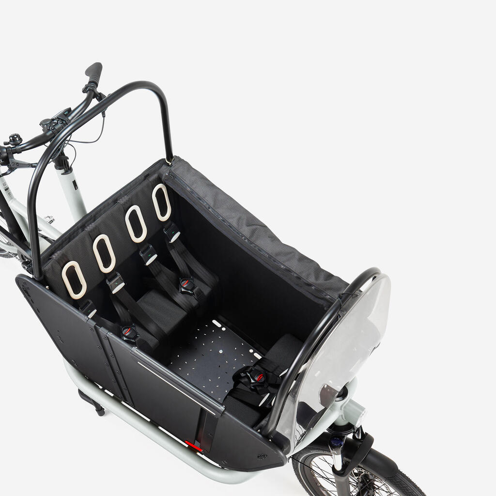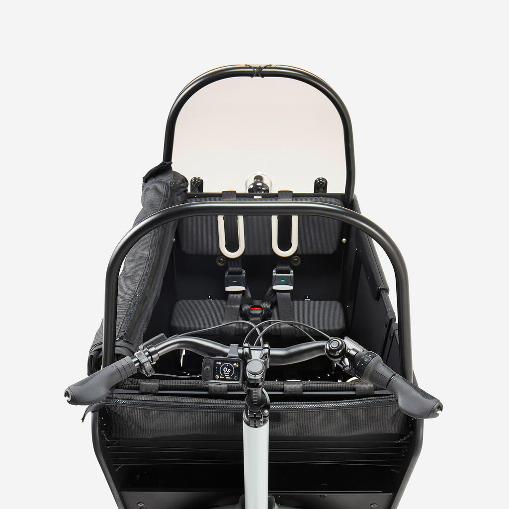 Za dobrodošlico vašim malim junakom smo posebno pozornost namenili sprednjemu delu za prevažanje, da lahko uživajo v dogodivščinah: klop za dve osebi z blazino in naslonom za hrbet, zložljiv sedež za eno osebo z blazino in naslonom za hrbet, trije 5-točkovni varnostni pasovi, varnostna vrata (vaši otroci lahko samostojno vstopijo), inovativna zaščita pred dežjem je vedno na voljo, vetrobransko steklo za udobje in zaščito pred vetrom, prednji del za prevažanje iz lesa Okoumé z zakovicami.