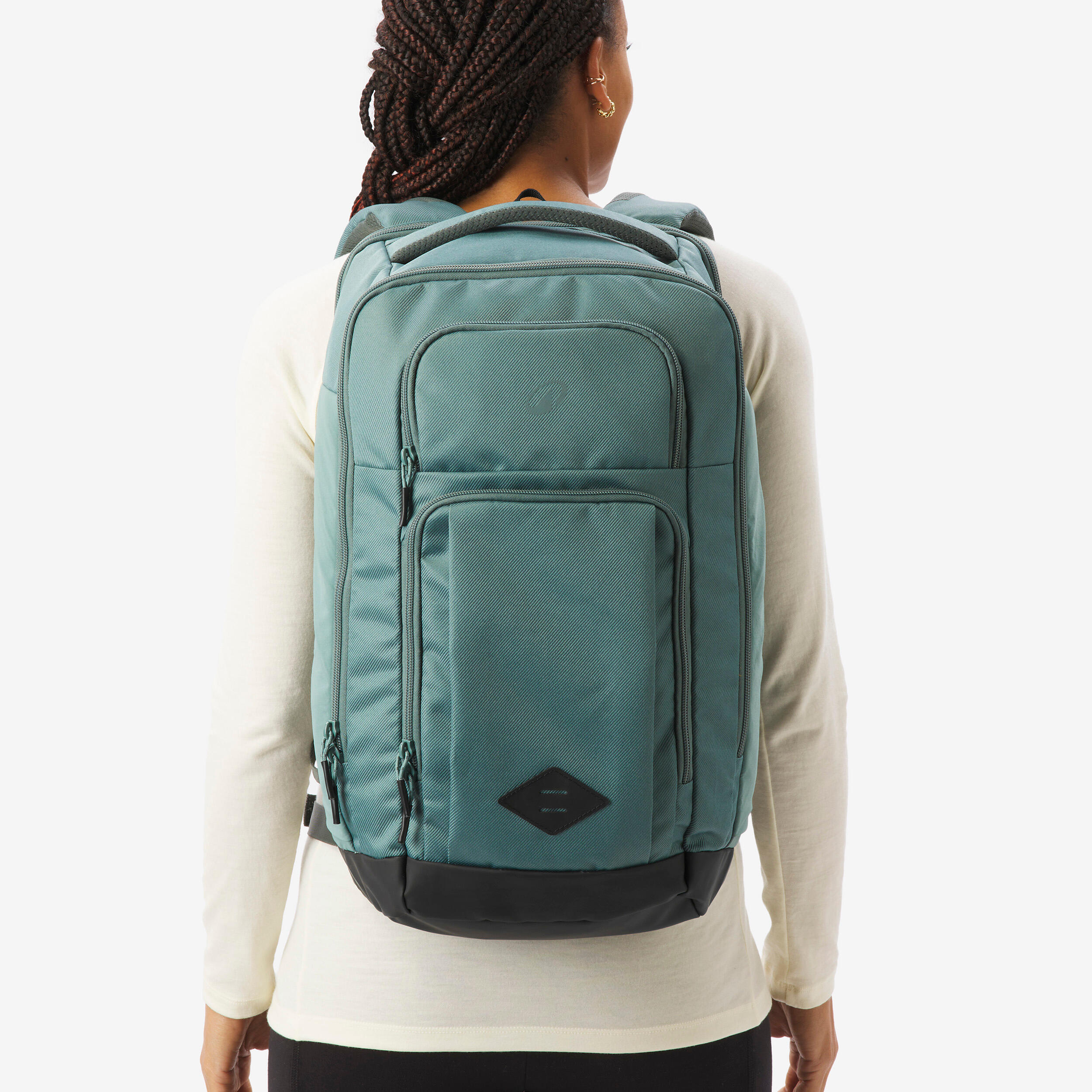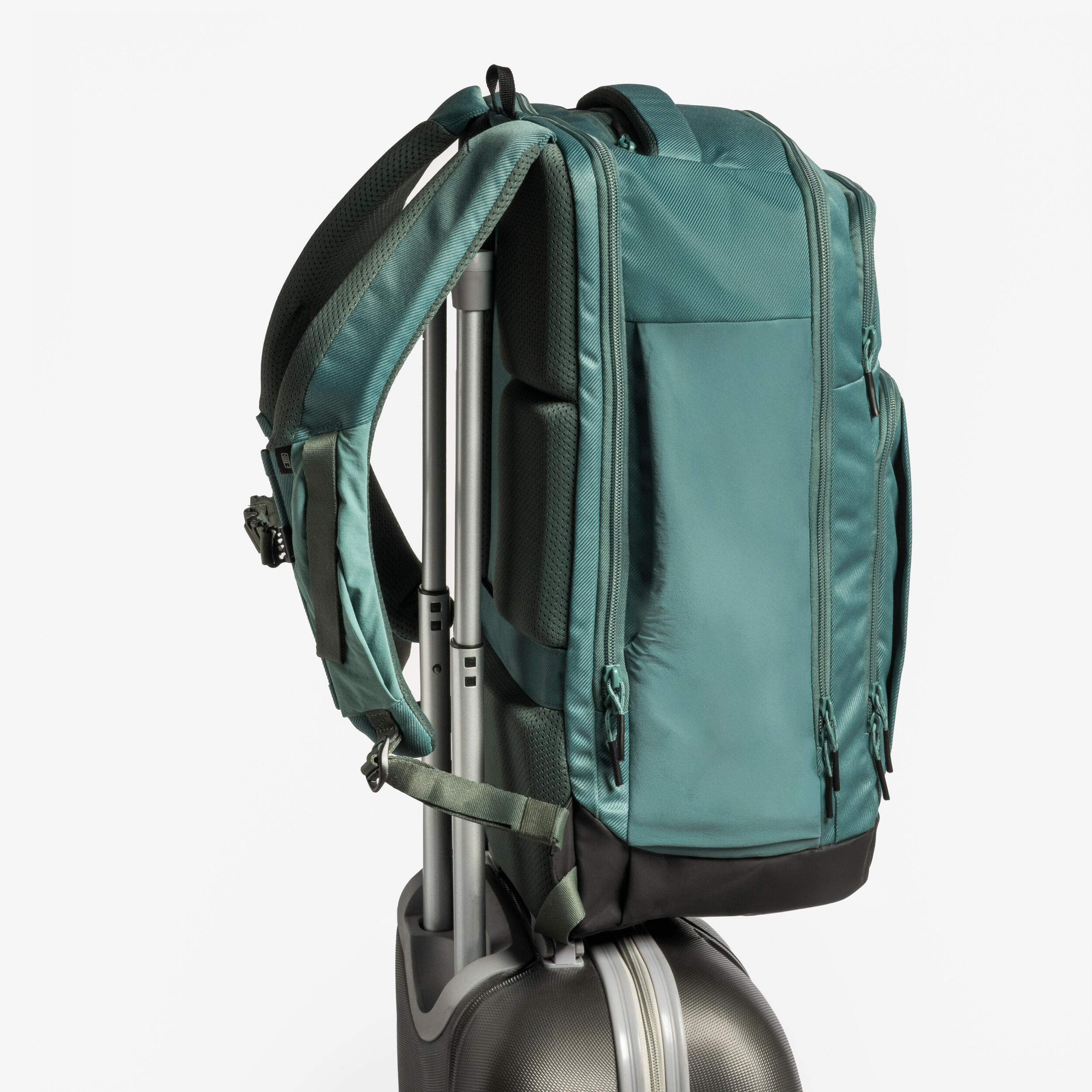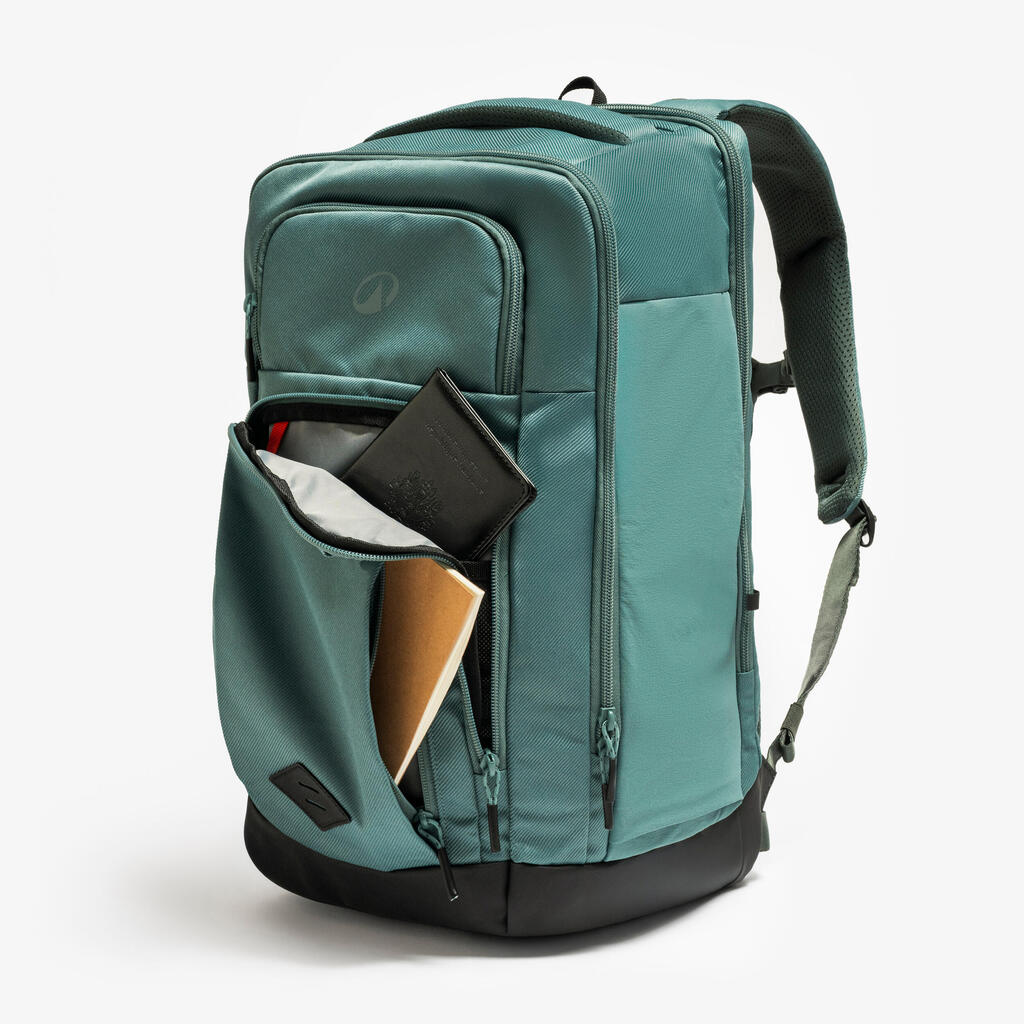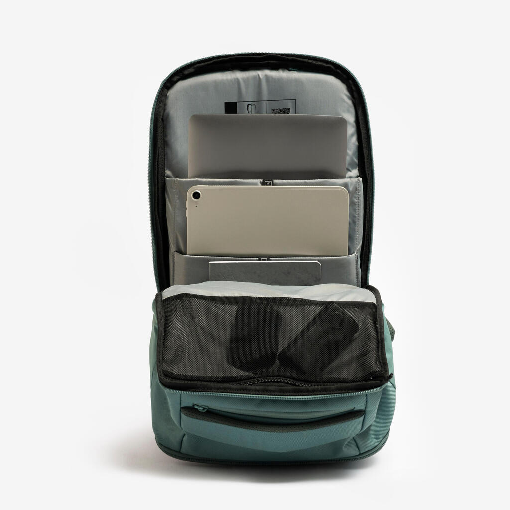 Trije predali in številni žepi (15) za ločeno in organizirano shranjevanje stvari. Predal z zadrgo. Ima dva žepa za 17-palčni prenosnik in 15-palčni tablični računalnik, ki sta dvignjena, da preprečite udarce. 7 žepov z zadrgo, 16,8-palčni žep za telefon (levi pas). Dva raztegljiva žepa za stekleničko. En organizator in en obroček za ključe. Eno držalo za svetilko. En trak za pritrjevanje na kovček.