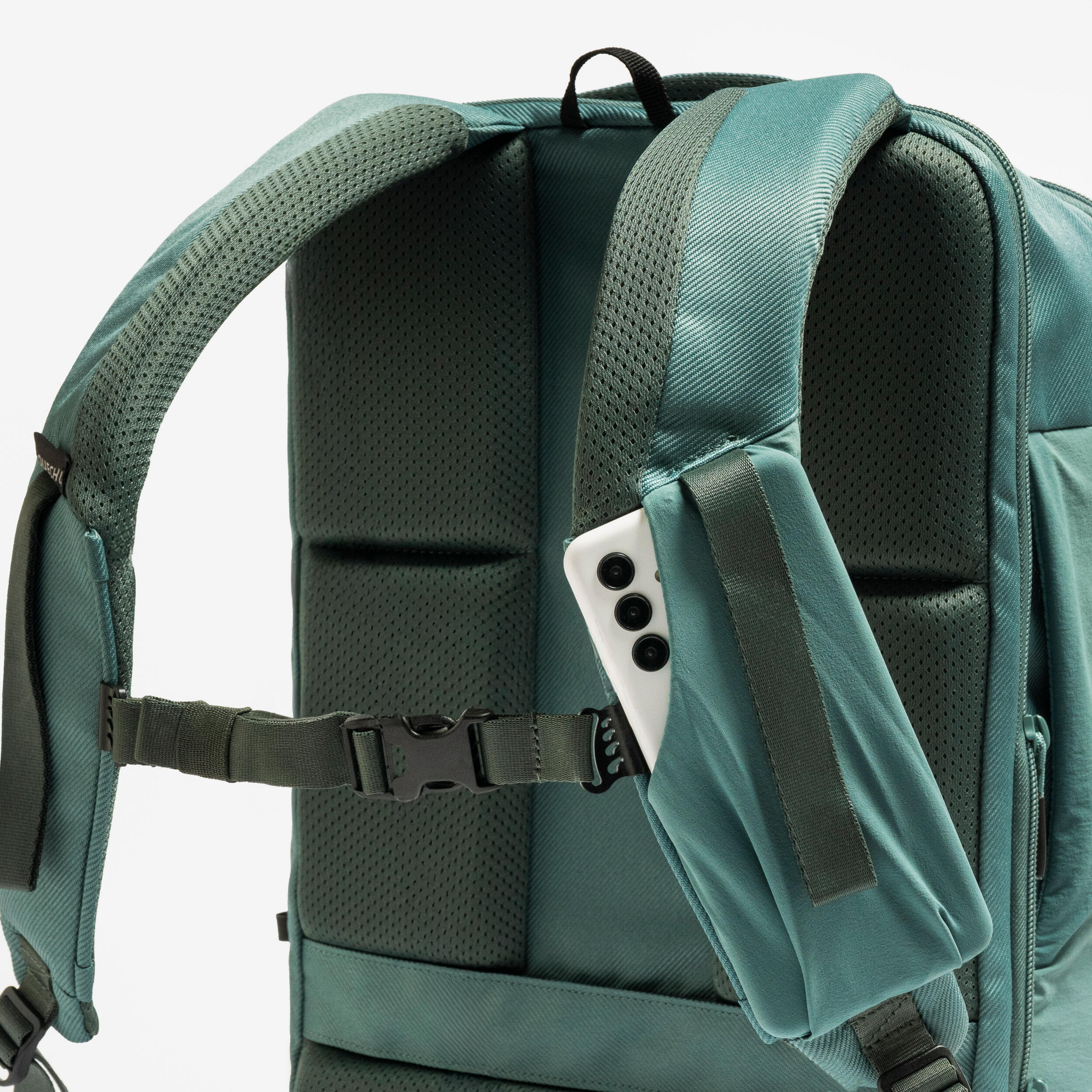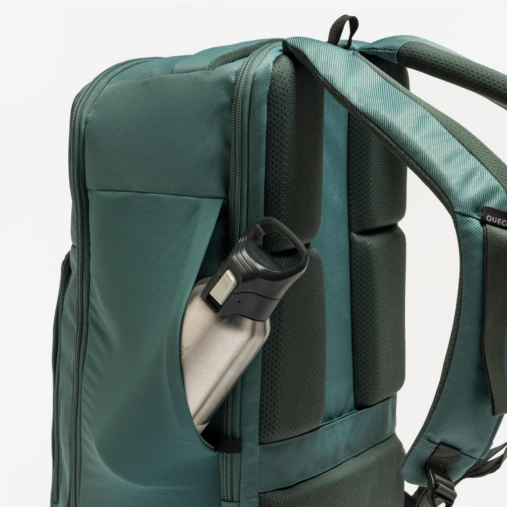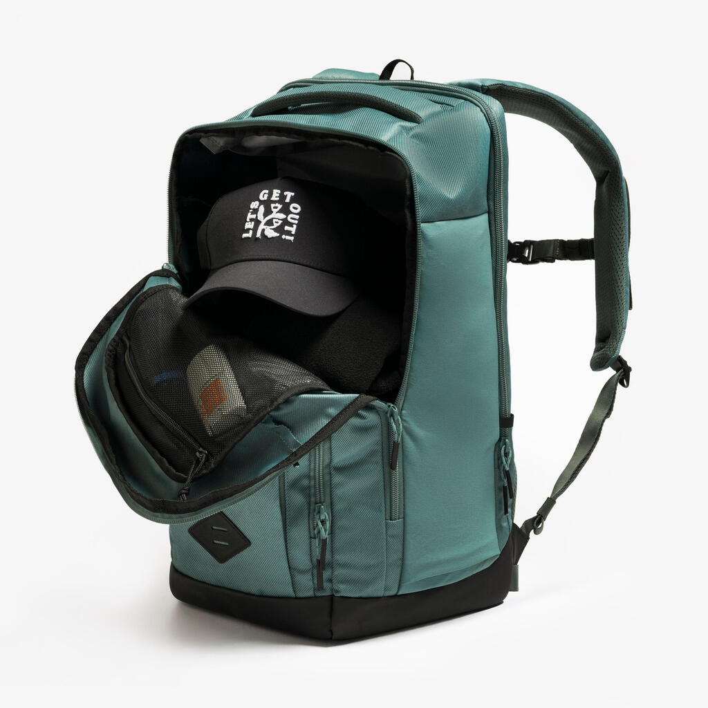 Materiali nahrbtnika so vodoodbojni, zato lahko začasno nadaljujete s hojo ali pohodom v rahlem dežju. Opozorilo: nahrbtnik ni vodoodporen in nima prevleke za dež. Če želite nadaljevati s hojo ali pohodom v dežju, stvari zaščitite z 20- do 40-litrsko prevleko za dež, ki jo na naši spletni strani najdete pod referenco 8734213.