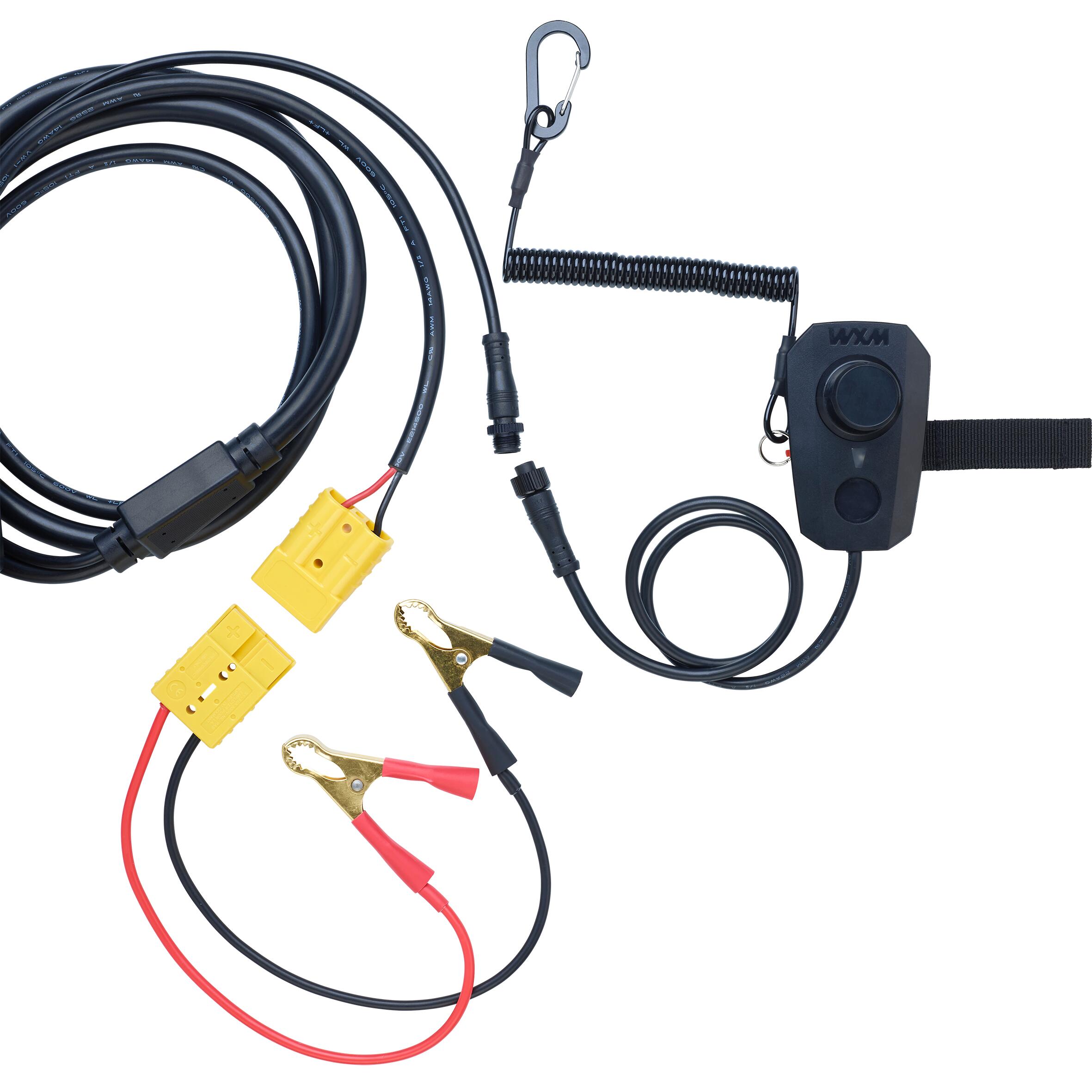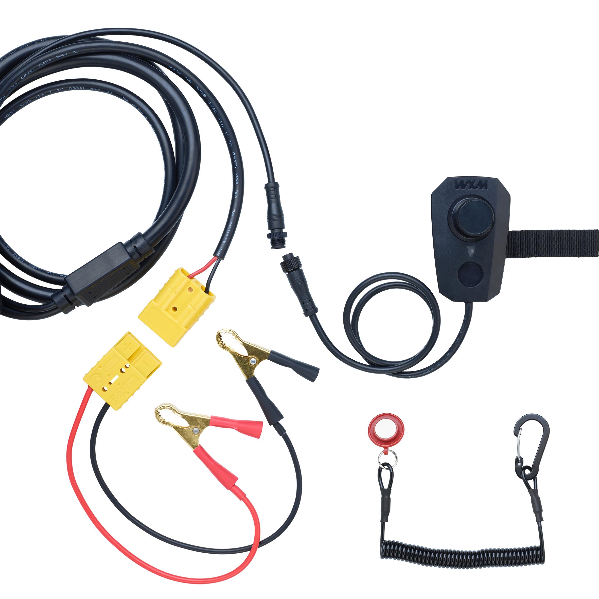 Motor je zasnovan za uporabo z 12 V baterijo. Odvisno od baterije teža znaša med 10,8 kg in 14,5 kg. Priporočamo, da uporabite zatesnjene litijeve baterije, ki so lažje in kompaktnejše. Konektor prilagodite glede na uporabljeno baterijo. Priloženi sta dve sponki za konektor. Rdeča žica mora biti povezana s pozitivnim polom, črna pa z negativnim.