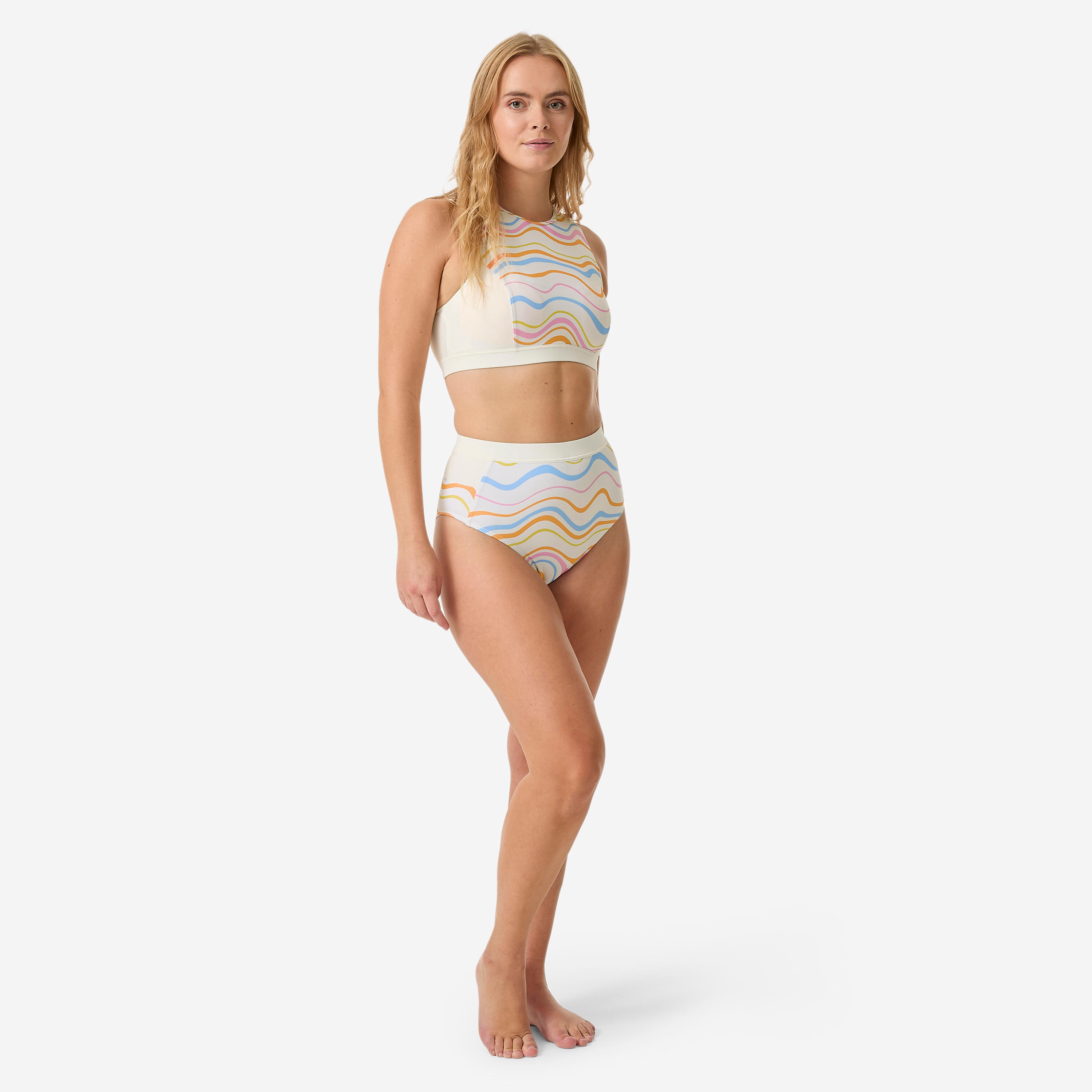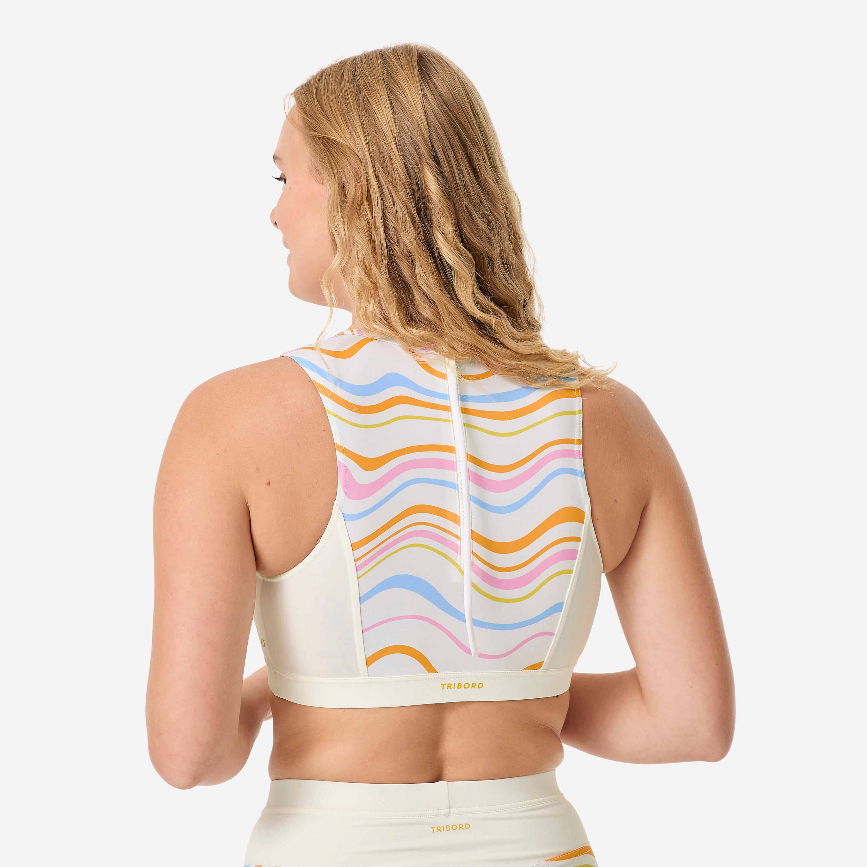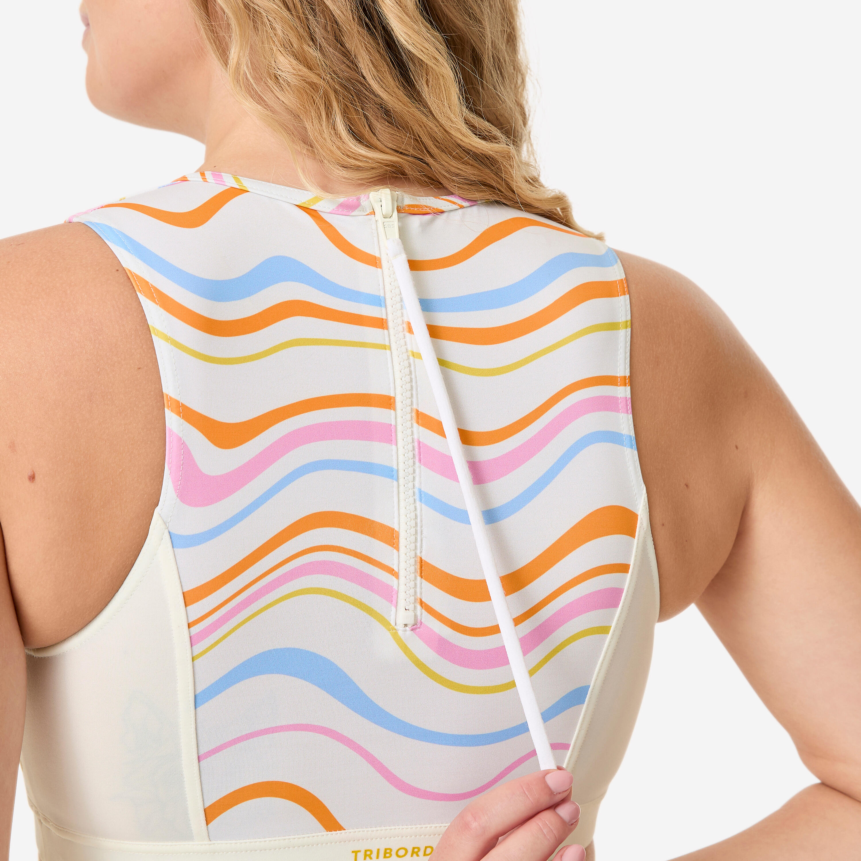 Zgornji del kopalk Carla v valovih ostane na svojem mestu. Ima odstranljive hidrofobne blazinice, ki ne zadržujejo vode, in širok elastični trak pod prsmi.
