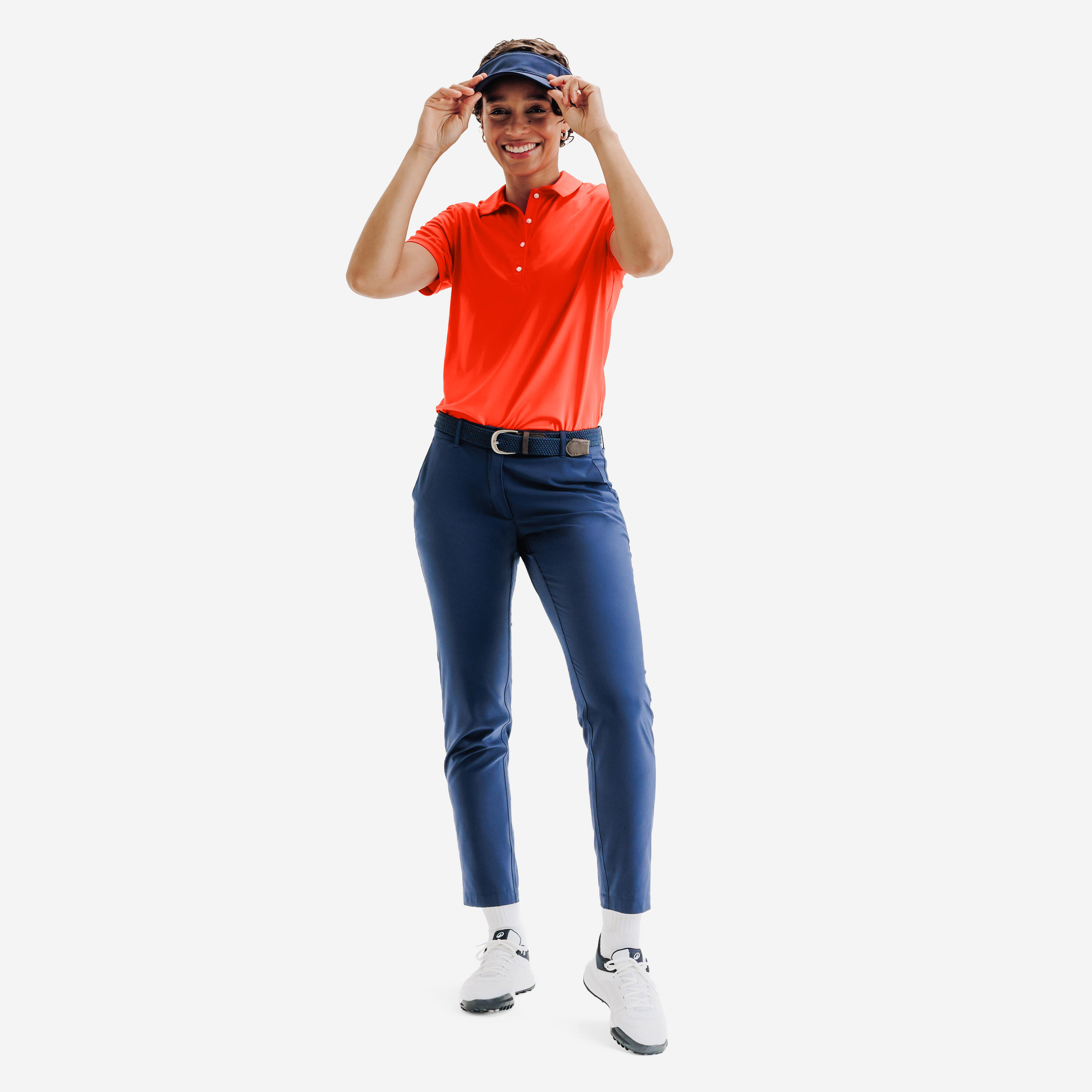 Manjši ovratnik kot pri tradicionalnih polo majicah za golf, štirje majhni gumbi v biserni barvi in rahlo zaobljen spodnji rob skrbijo, da je kroj manj strog in dodajo ženstveno privlačnost.