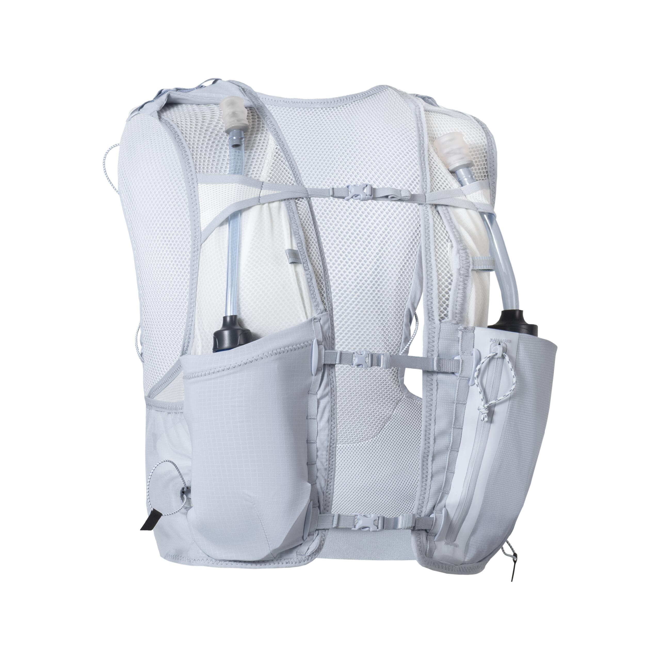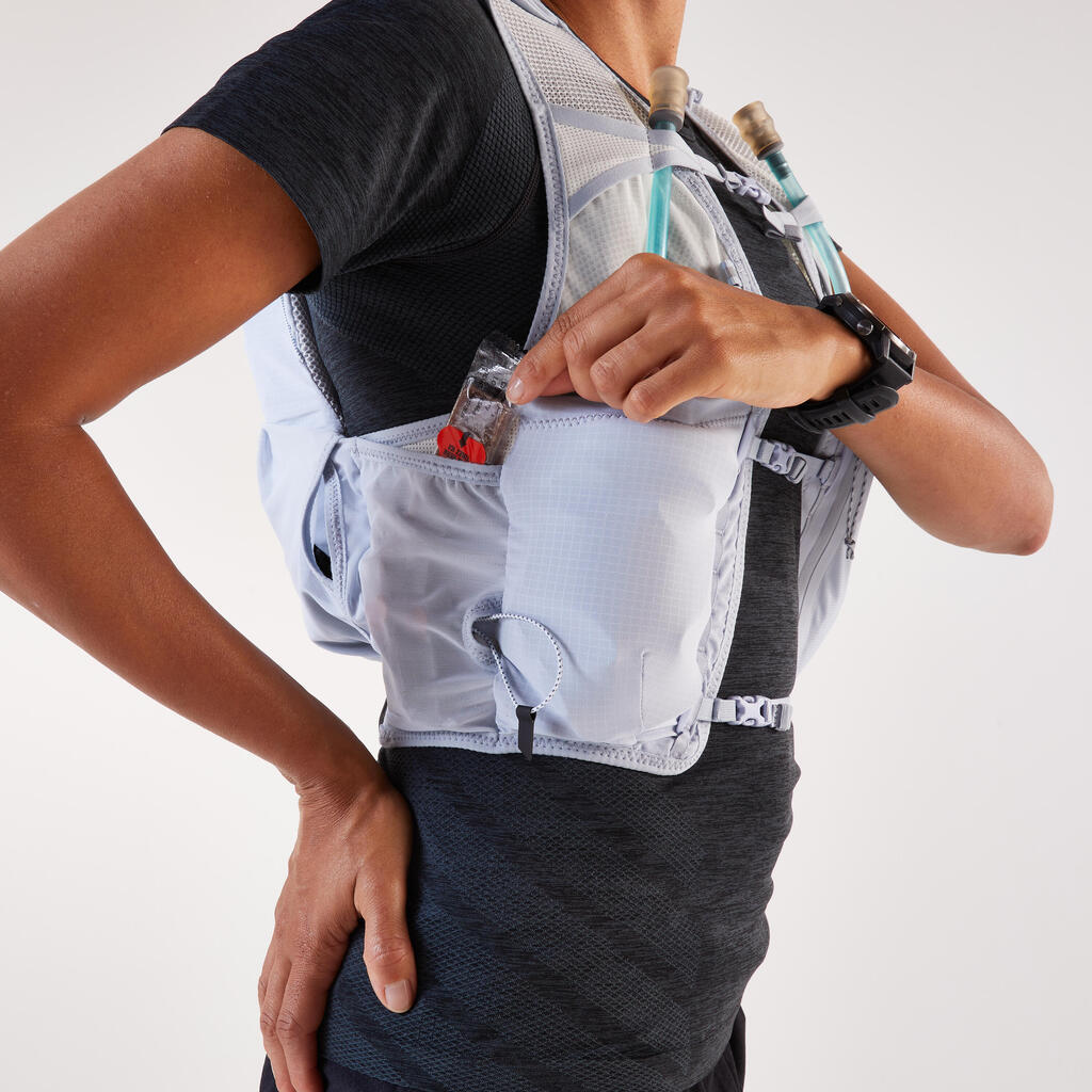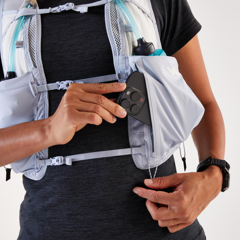 Na sprednji strani tega 8-litrskega nahrbtnika za tek po brezpotjih je 5 žepov: dva za 500-ml mehki plastenki (sta priloženi), patentiran vodoodporni žep za telefon, pa tudi dva žepa za gele ali energijske ploščice. Poleg tega smo nahrbtniku dodali 2 stranska žepa in 4 zadnje žepe: en patentiran kenguru žep, pa tudi velik predal s stransko zadrgo, ki vsebuje lasten žep z zadrgo, kot tudi velik žep, zasnovan za 1-litrski vodni meh (ni priložen).