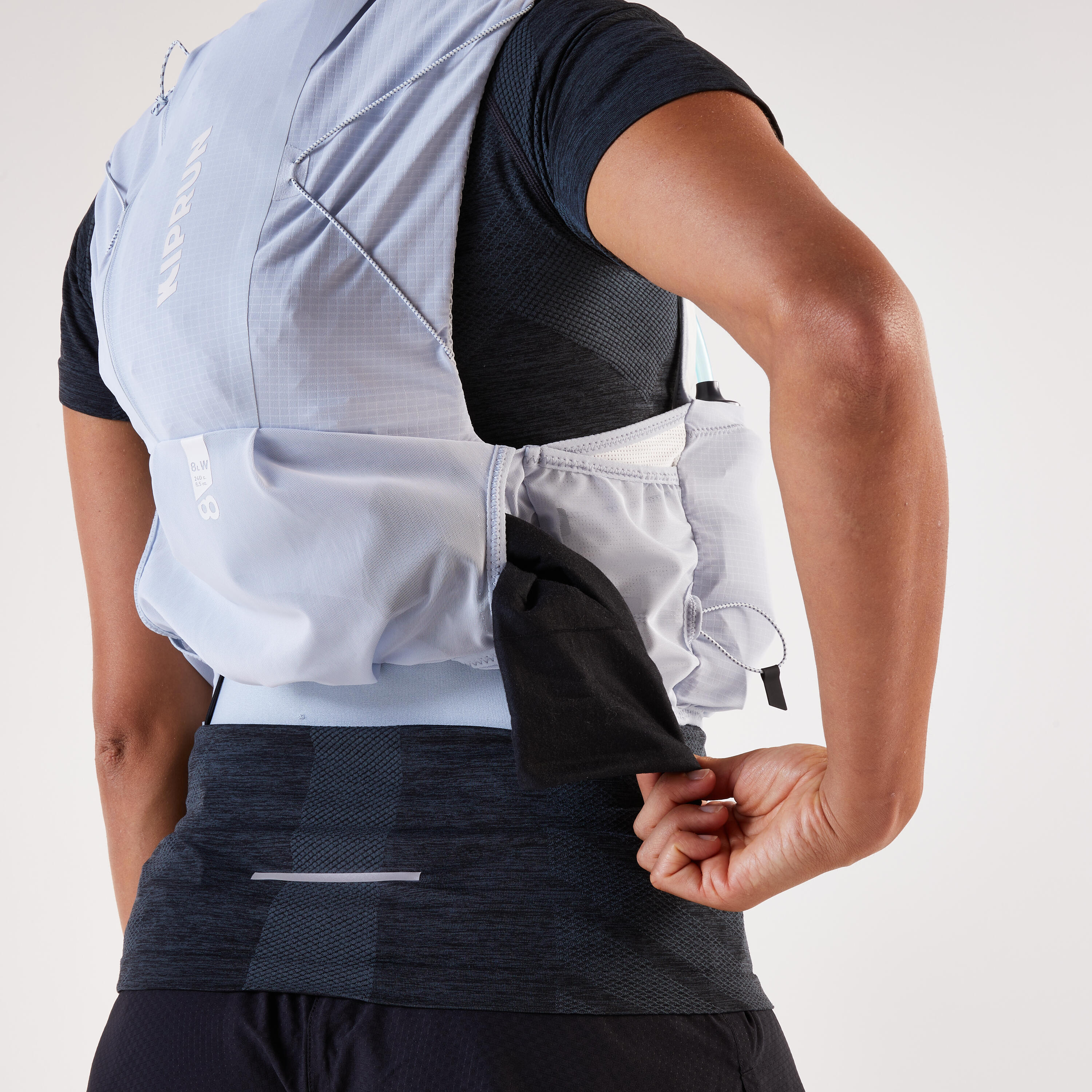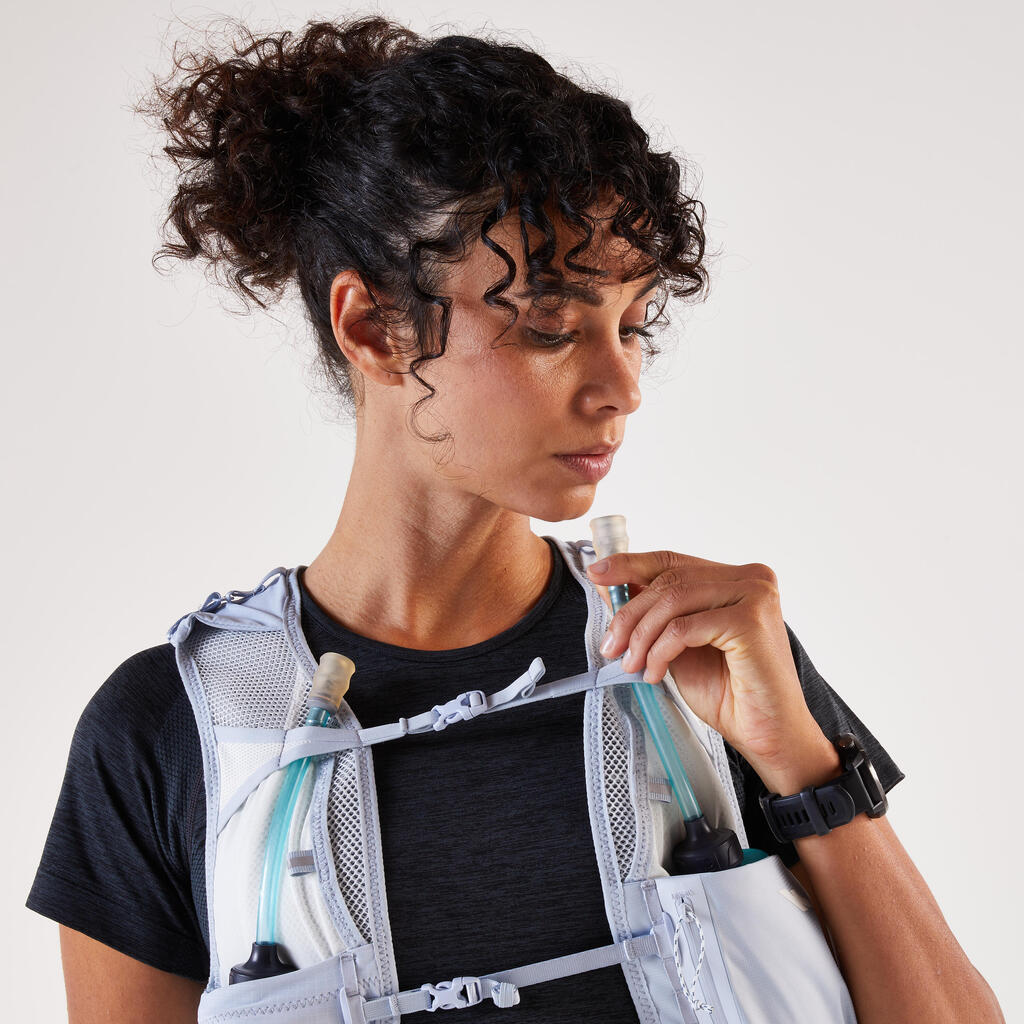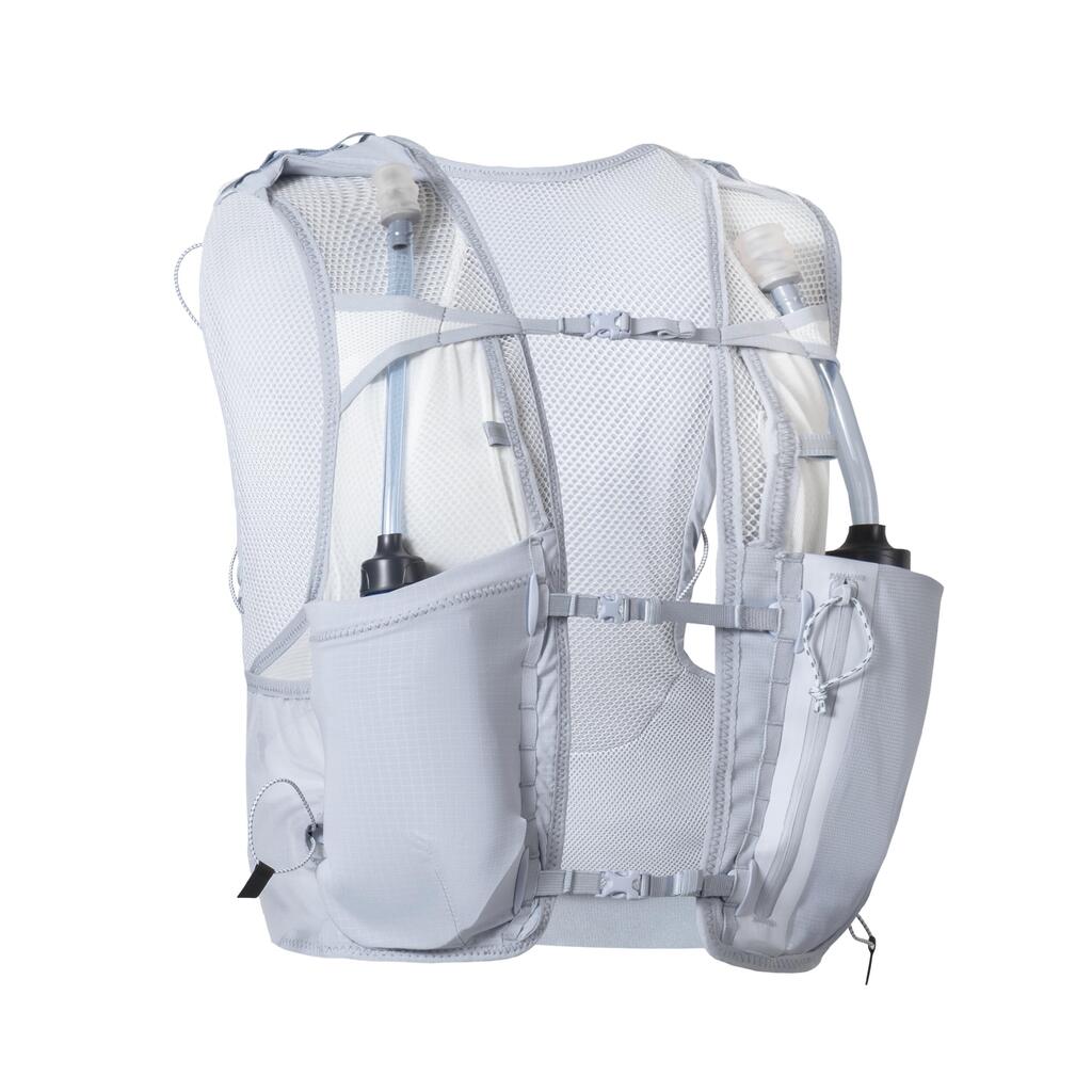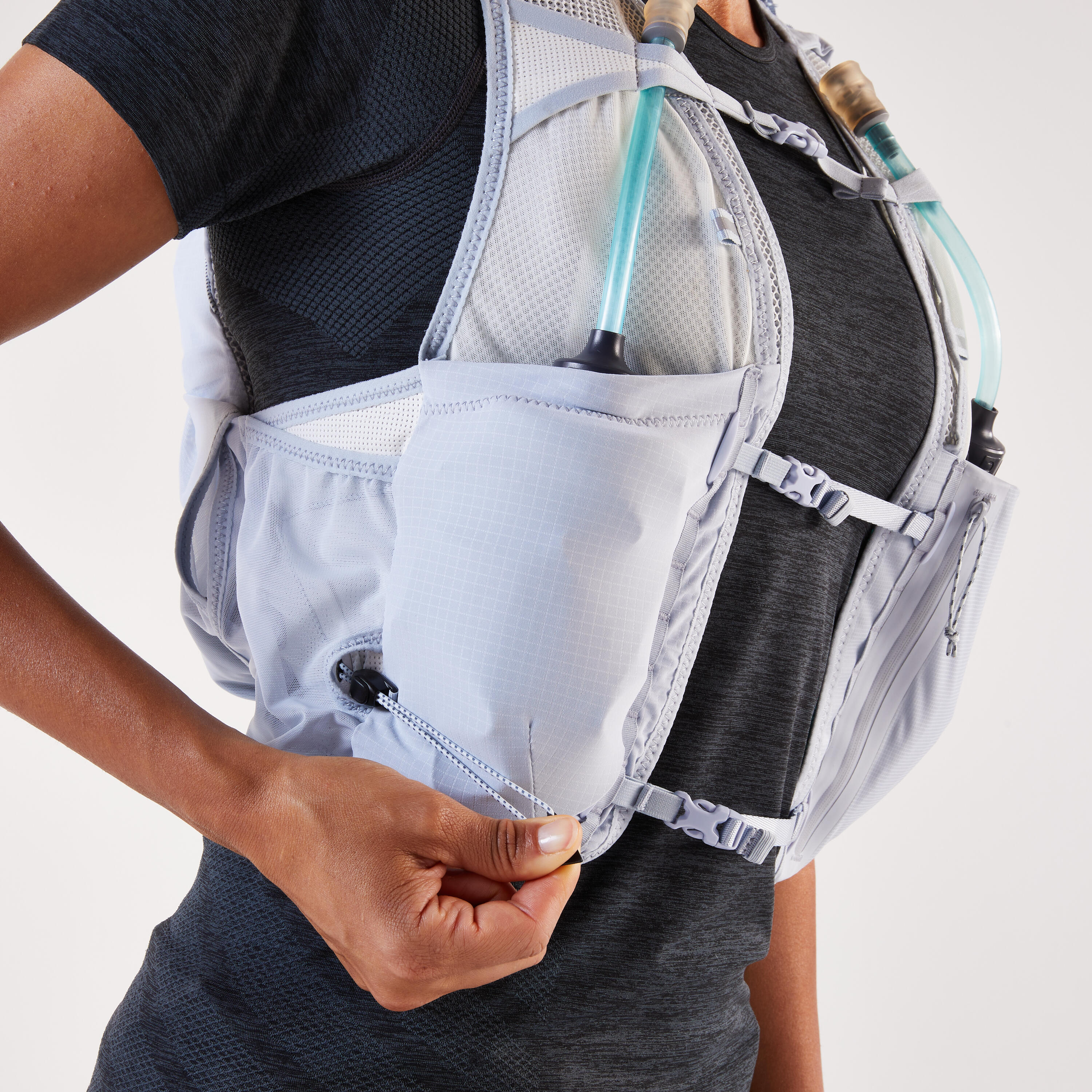 Na sprednji strani tega 8-litrskega nahrbtnika za tek po brezpotjih je 5 žepov: dva za 500-ml mehki plastenki (sta priloženi), patentiran vodoodporni žep za telefon, pa tudi dva žepa za gele ali energijske ploščice. Poleg tega smo nahrbtniku dodali 2 stranska žepa in 4 zadnje žepe: en patentiran kenguru žep, pa tudi velik predal s stransko zadrgo, ki vsebuje lasten žep z zadrgo, kot tudi velik žep, zasnovan za 1-litrski vodni meh (ni priložen).