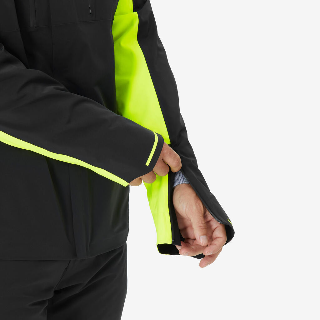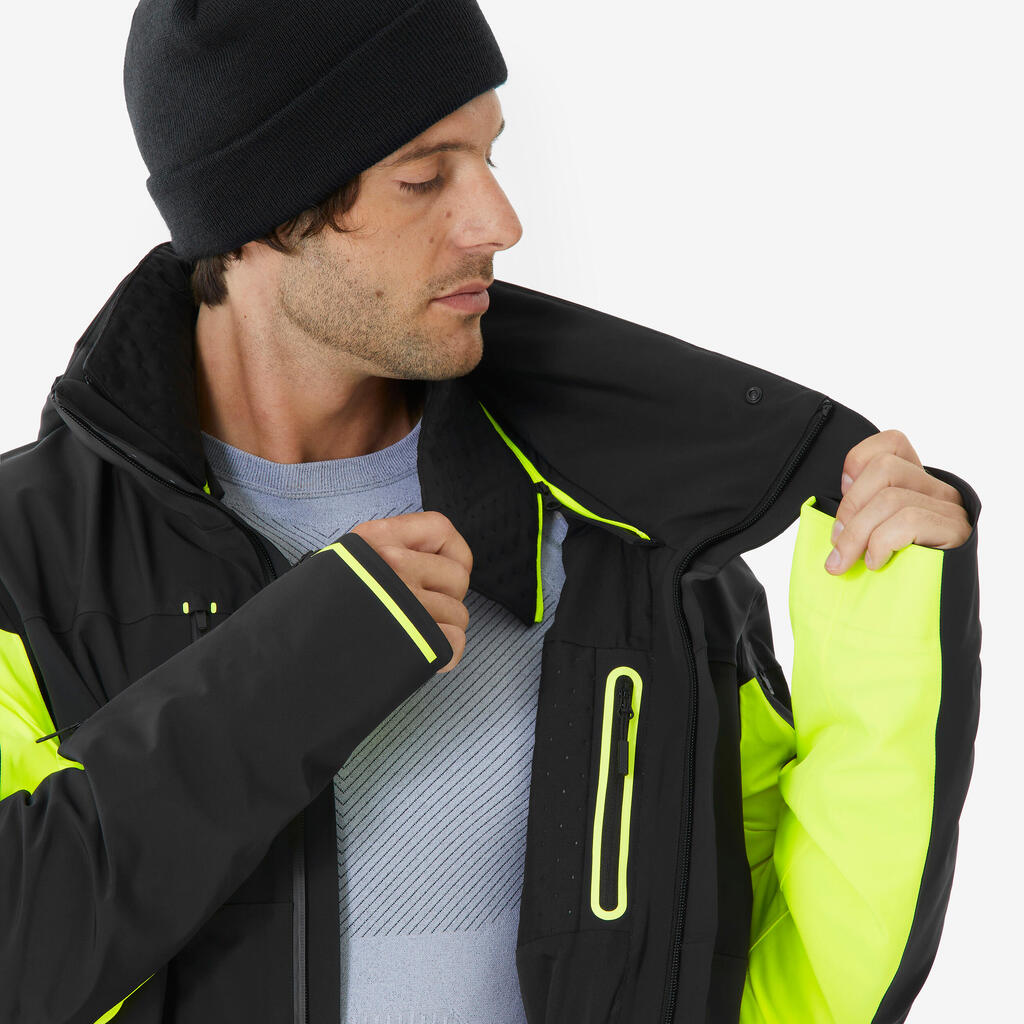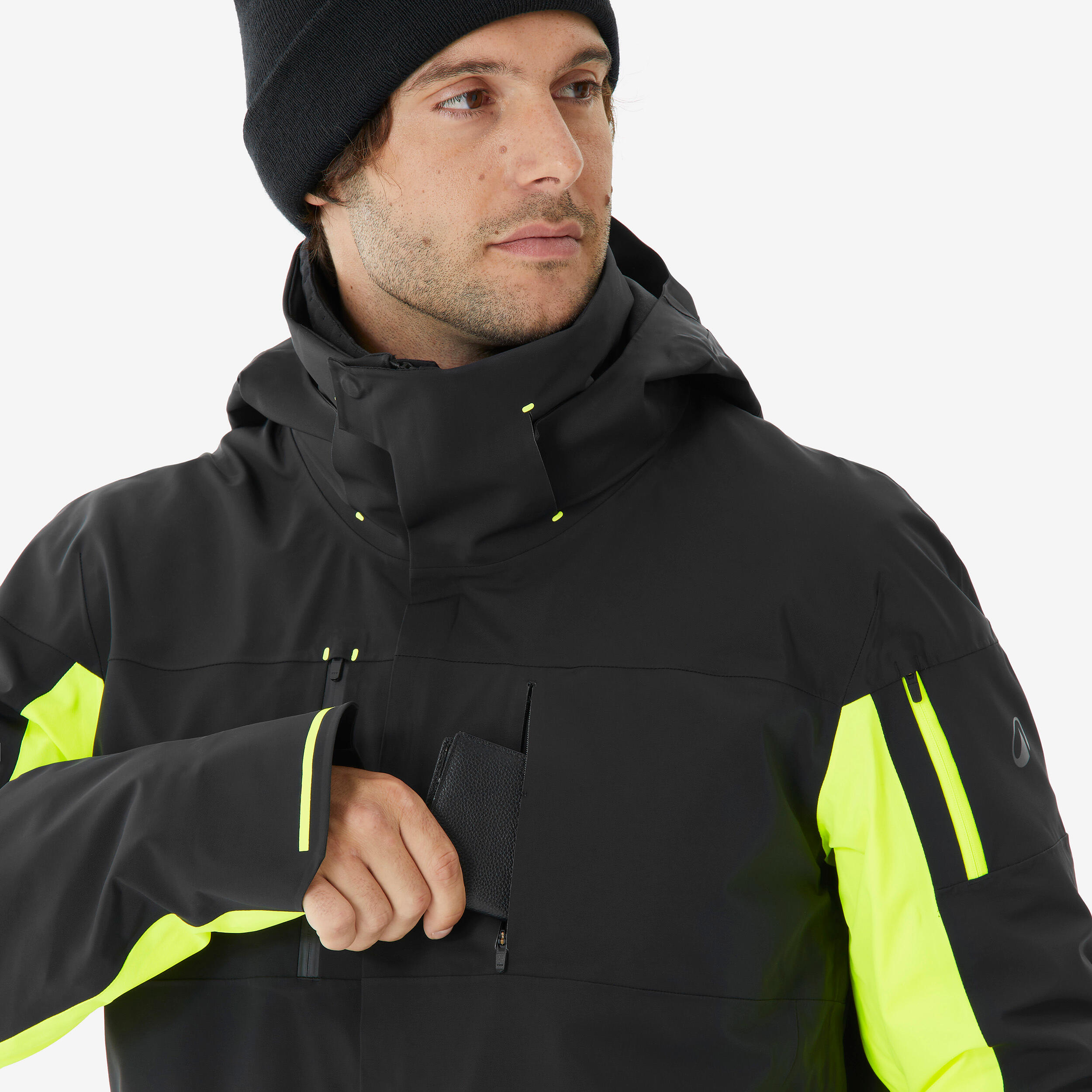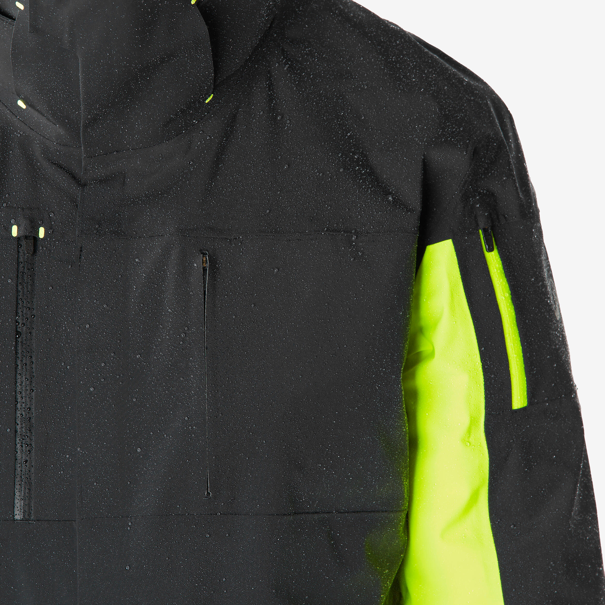 Vodoodporen material in zasnova preprečujeta vdor vode. Šivi in zadrge so vodoodporni in zaščiteni z zavihkom. Izdelek smo testirali pod posebno prho, ki poustvarja pogoje smučarskih središč. Izdelek smo prav tako testirali 7 dni v različnih vremenskih pogojih.