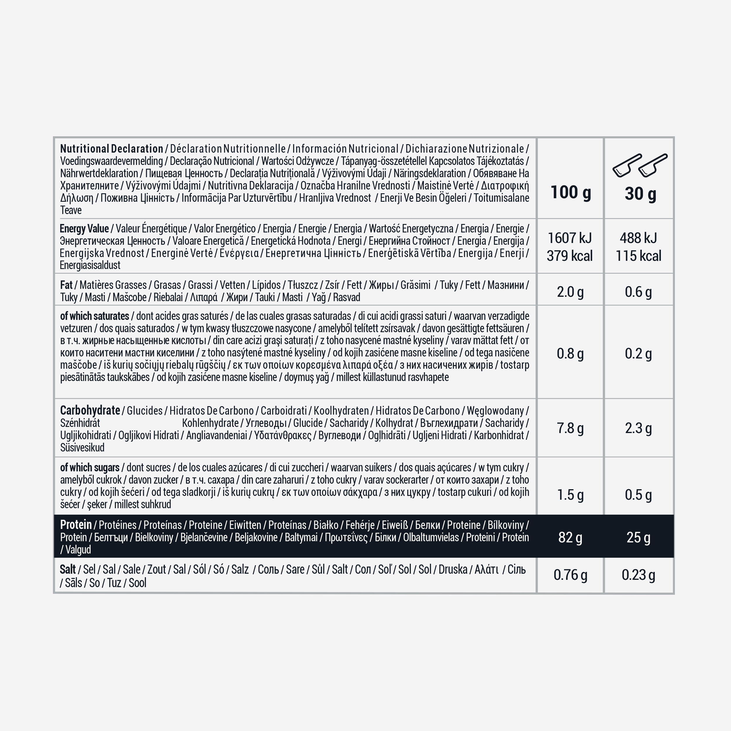 Naš 100-odstotni izolat sirotke je izdelan v Franciji. Beljakovine izvirajo iz Evropske unije (Nizozemska, Irska, Danska). Ne vsebuje aspartama ali sukraloz, teksturirnih sredstev in kalijevega acesulfama. Odločili smo se za naravni okus in stevio, močno sladilo, pridobljeno iz naravnih surovin.