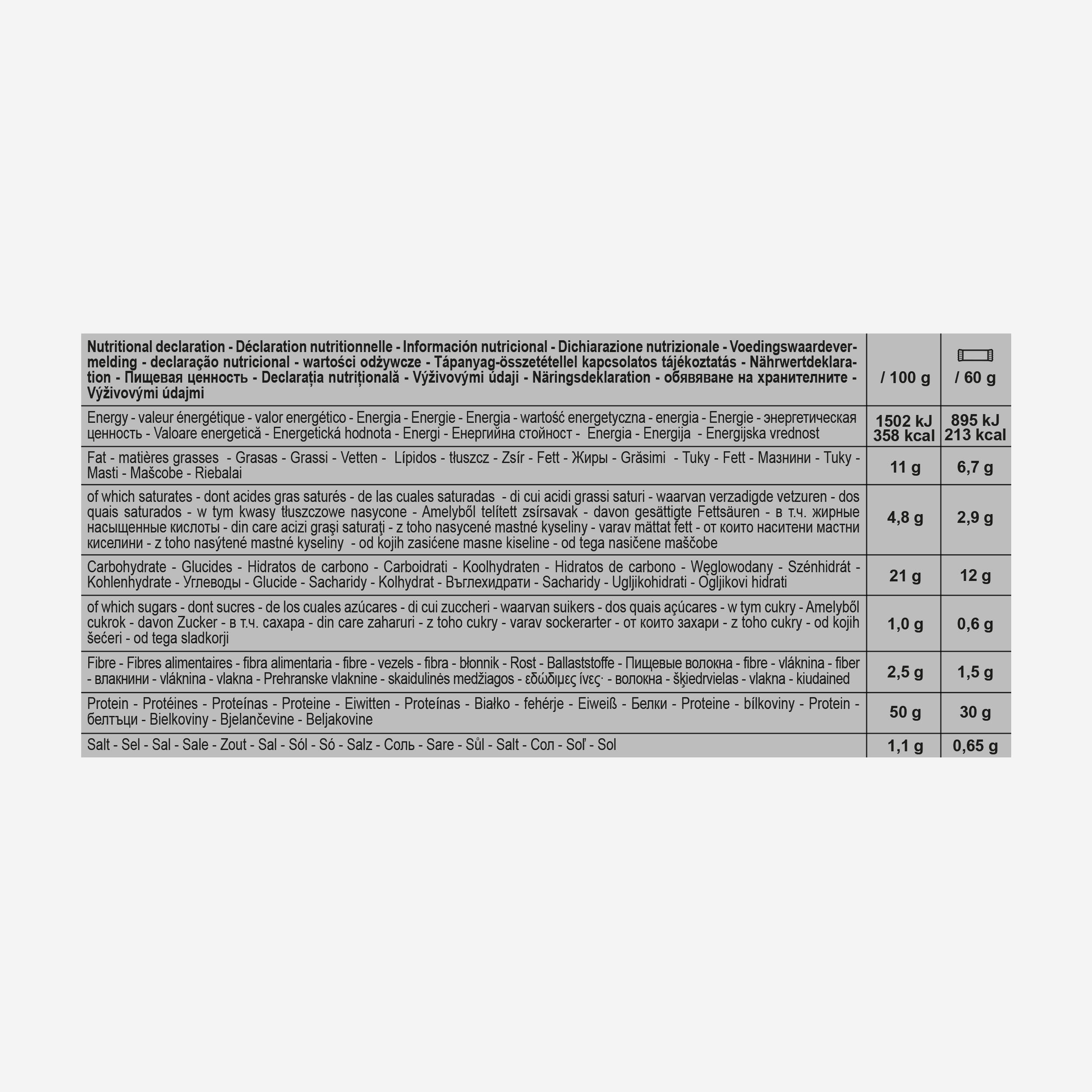 S čokolado oblita beljakovinska ploščica s sladili. Visoka vsebnost beljakovin.Sestavine: MLEČNE beljakovine, čokoladni obliv s sladilom (17 %) (kakavova masa, sladilo: maltitol, kakavovo maslo, emulgator: SOJIN lecitin, naravna aroma vanilije), želatina, sredstvo za ohranjanje vlage: glicerol, voda, z beljakovinami obogatena sirotka (MLEKO), rafinirano olje iz kopre, kakav v prahu z nizko vsebnostjo maščob, arome, sol, emulgator: steviol glikozidi iz stevije.Lahko vsebuje sledi: glutena, jajc, arašidov, oreškov, sulfitov. Beljakovine in mlečna čokolada ne izvirajo iz Francije. Izdelano v Franciji.