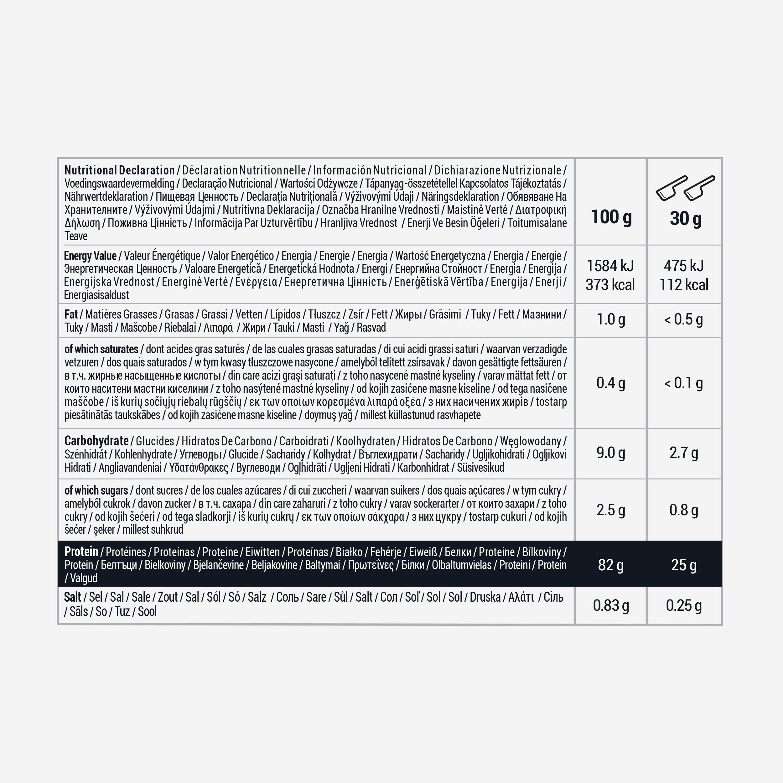 Naš 100-odstotni izolat sirotke je izdelan v Franciji. Beljakovine izvirajo iz Evropske unije (Nizozemska, Irska, Danska). Ne vsebuje aspartama ali sukraloz, teksturirnih sredstev in kalijevega acesulfama. Odločili smo se za naravni okus in stevio, močno sladilo, pridobljeno iz naravnih surovin.