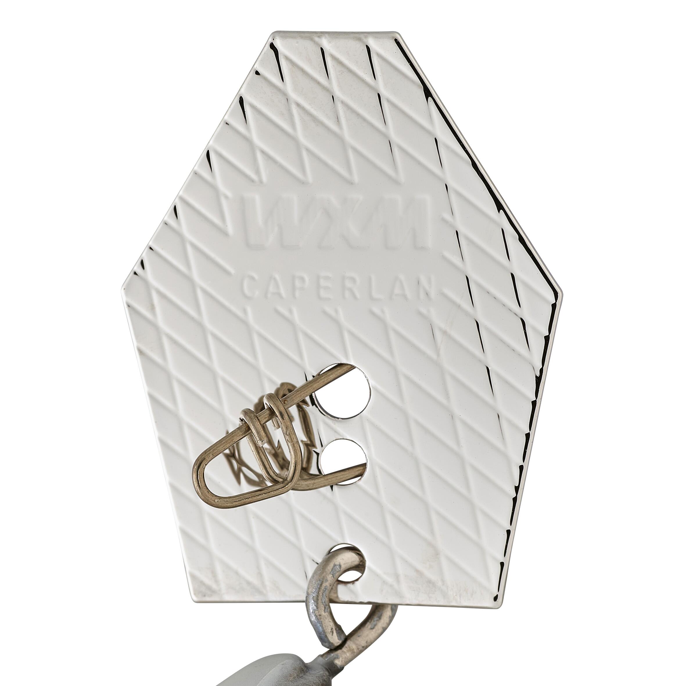 Teža neopremljene vabe: 10,5 g. Teža opremljene vabe s ploščicami in sponko: 13,5 g.