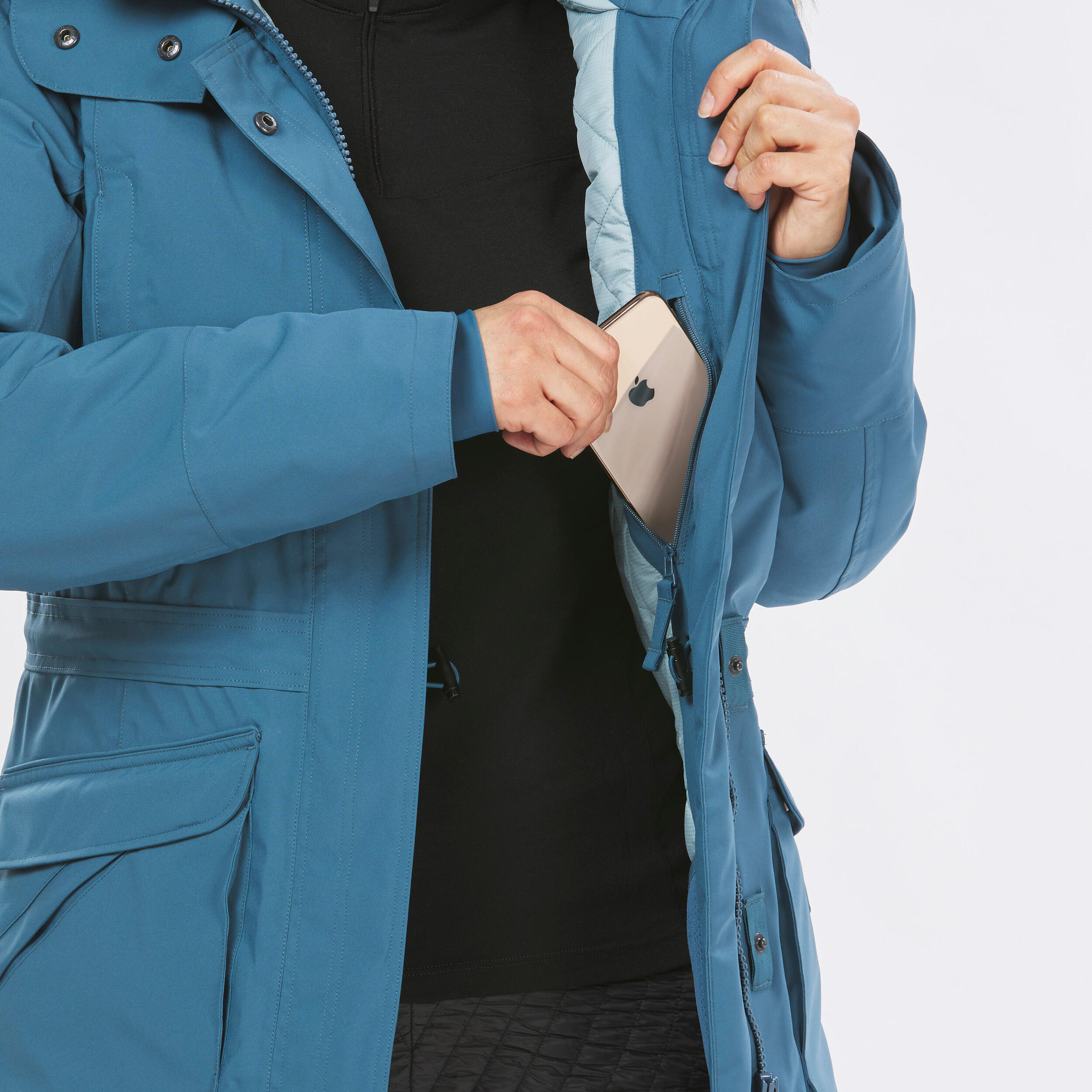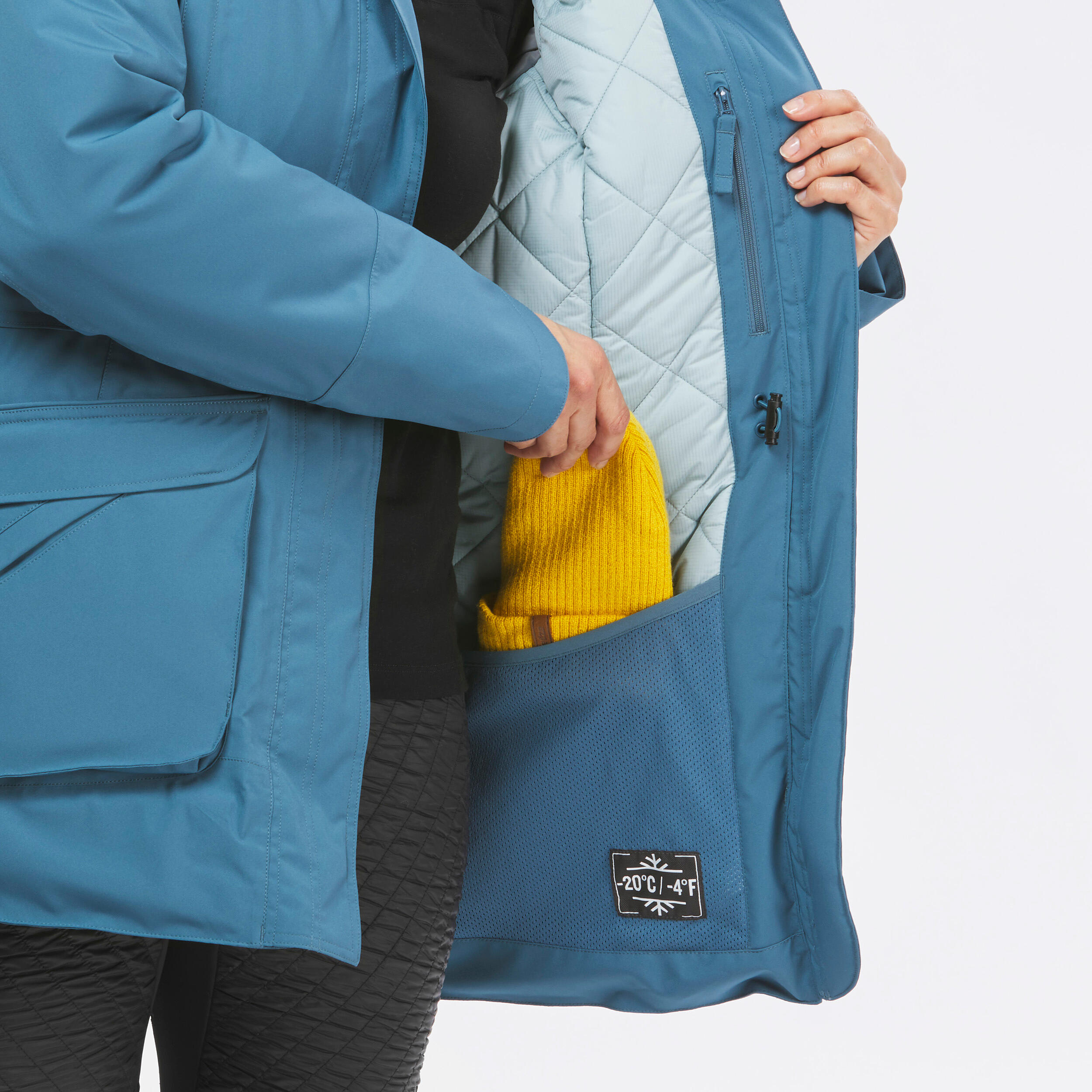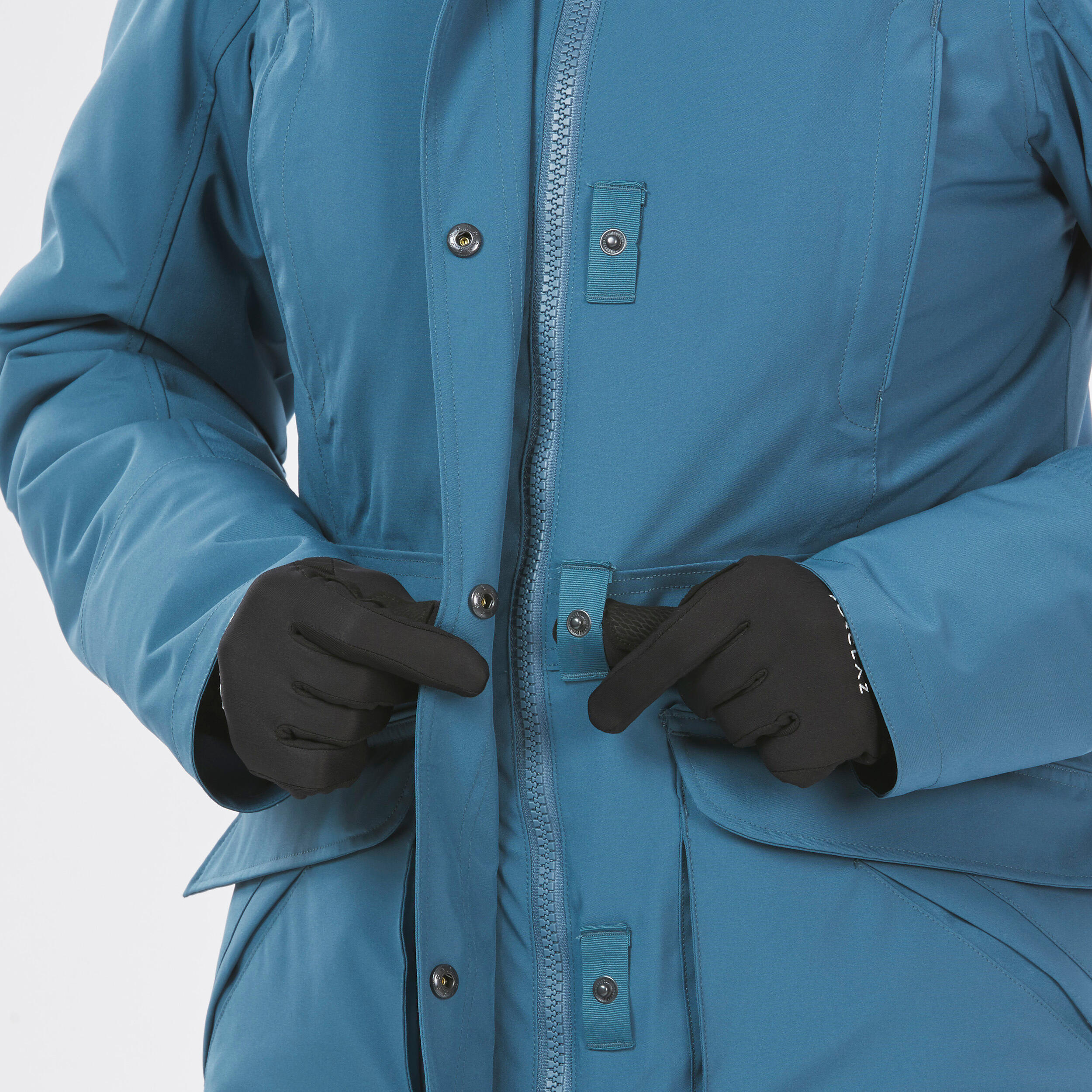 Praktični in pametni dodatki: dva topla žepa za roke, dva zunanja žepa z zavihkom, en zavarovan notranji žep, dva notranja mrežasta žepa za hiter dostop do stvari. Na glavni zadrgi je dolg trak, pritiskači in odprtina za palce, kar omogoča, da jakno enostavno odpnete ali zapnete tudi z rokavicami. Dve zadrgi na robu omogočata udobno sedenje in sklanjanje.
