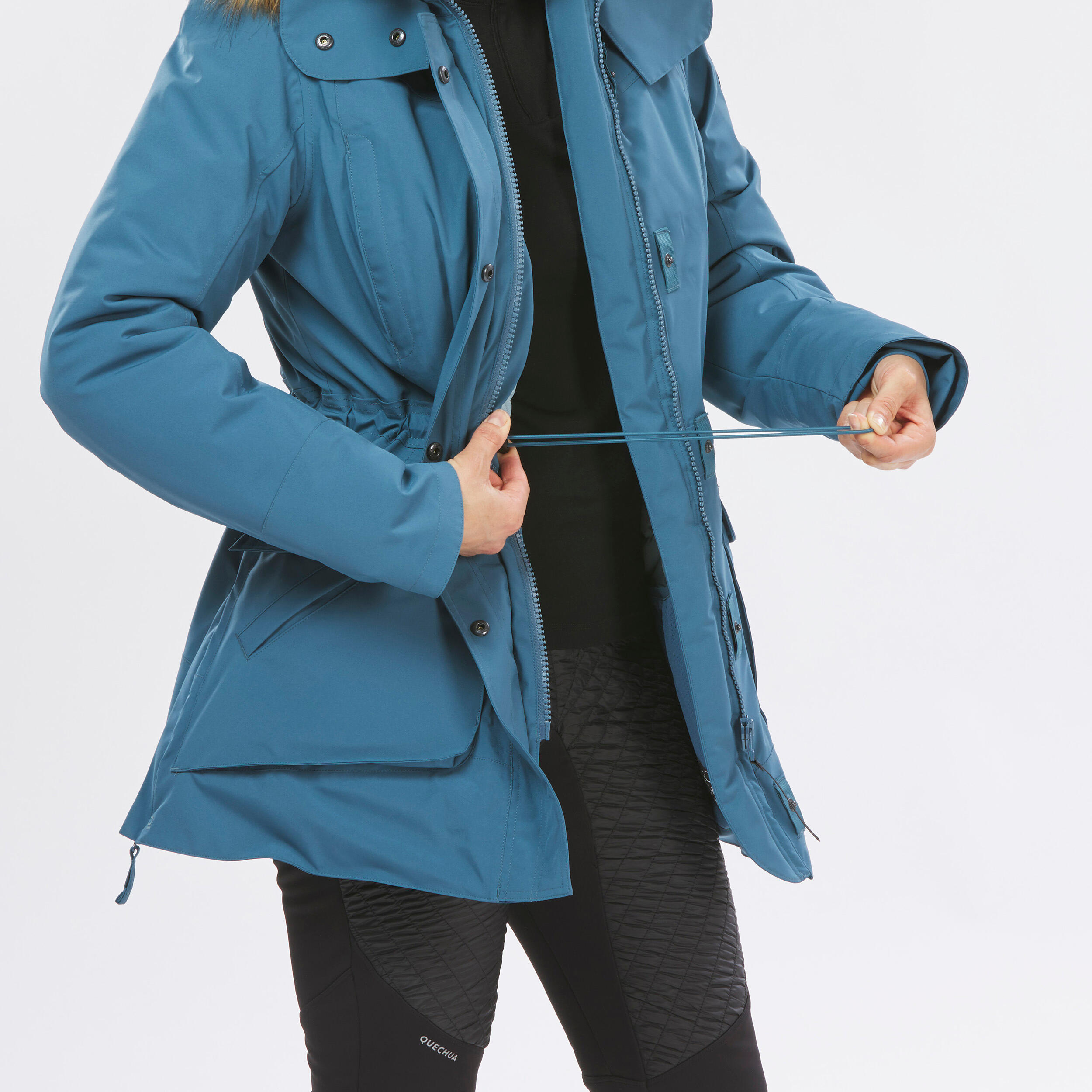 Vodoodporen zunanji material jakne prepreči vdor vode in vetra. Da bi vam bilo pozimi toplo, morate zaščititi tudi glavo, roke in noge. Kapuca z odstranljivo krzneno podlogo, patent na rokavih in visok ovratnik preprečijo vdor mraza. Visoka žepa iz flisa sta odlična za zaščito rok pred mrazom in skrbita, da so roke v udobnem položaju.