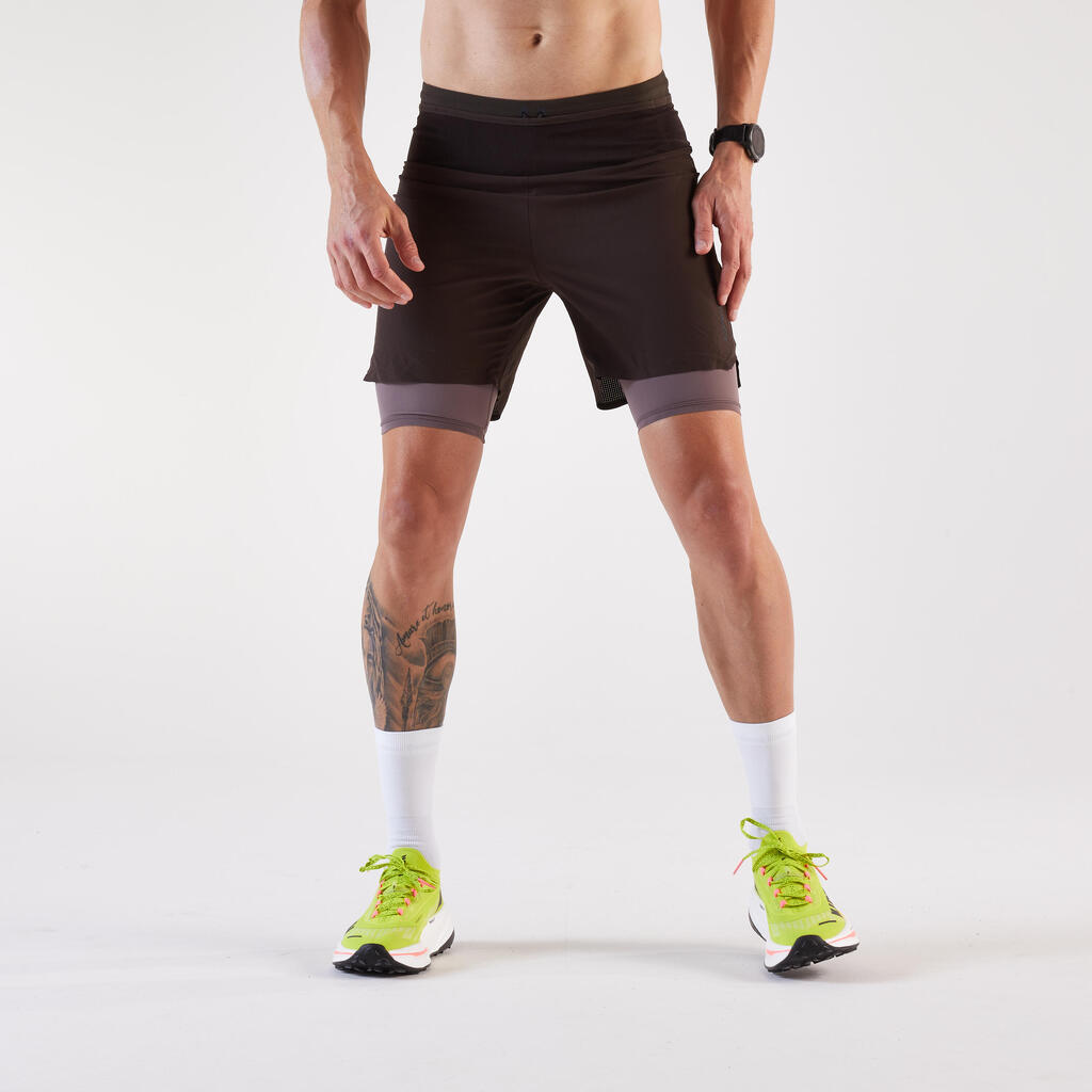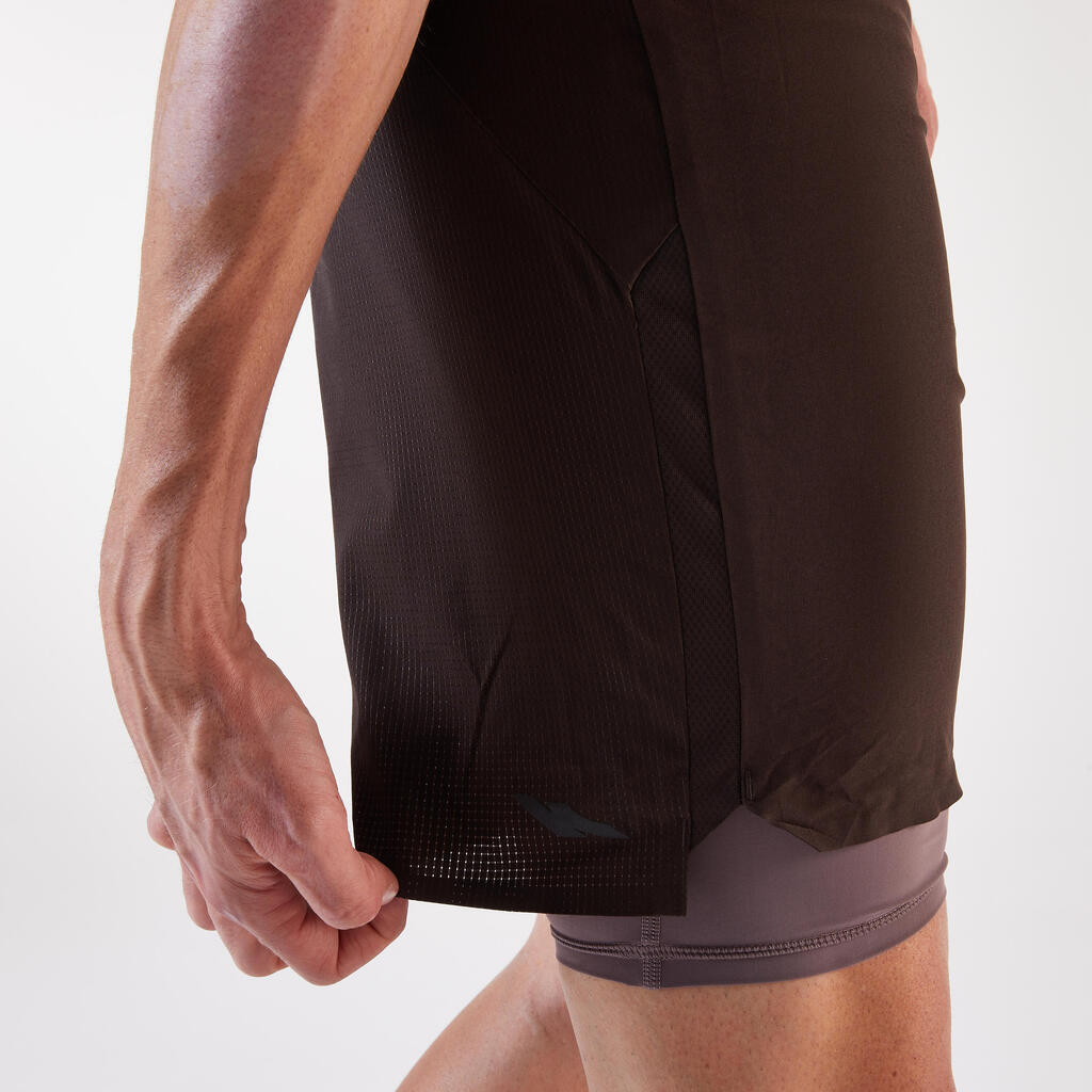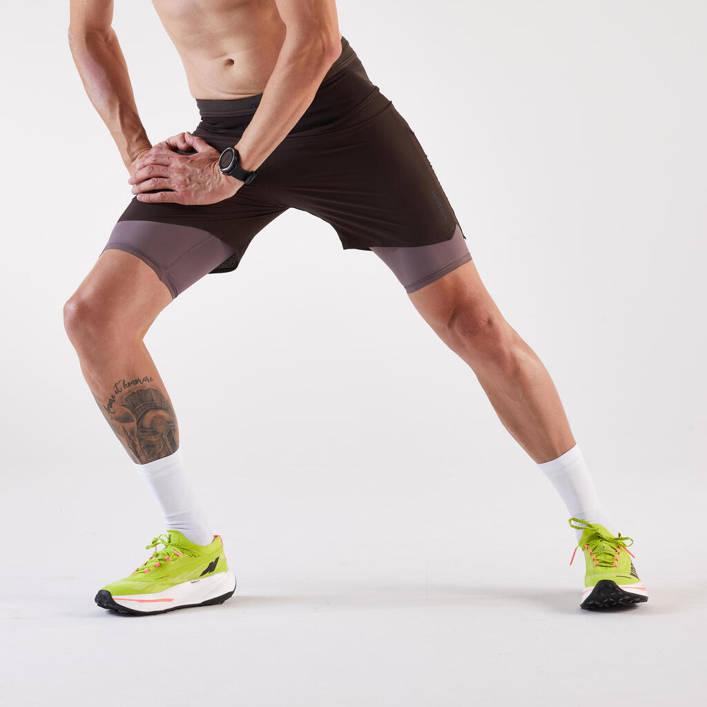 Te kratke hlače za tek ali tek po terenu 2 v 1 se odlikujejo po sestavnih delih, ki so del njihove zasnove in so različni spredaj in zadaj, da se optimizira odvajanje znoja. Različni materiali nudijo najboljšo kombinacijo svobode gibanja in obvladovanja potenja, tako da ne boste niti opazili, da ste pretekli kilometre.