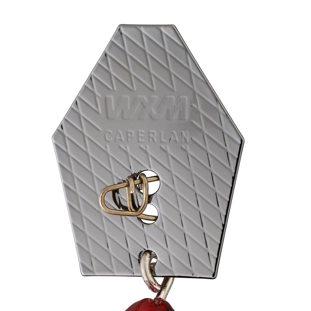 Teža neobtežene vabe: 14 g. Teža obtežene vabe s ploščico in sponko: 17 g.