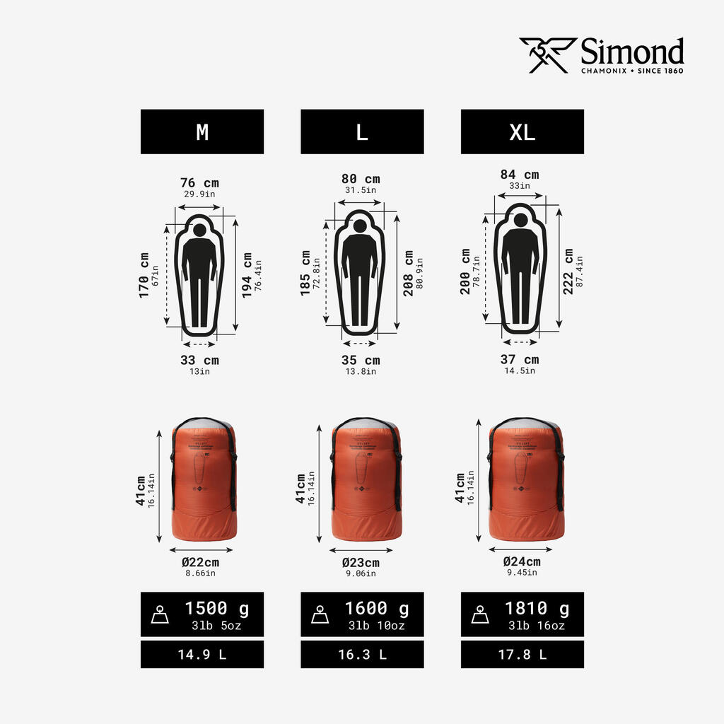 Velikost S: ni na voljo. Velikost M (za uporabnike med 1,60 m in 1,69 m): 1500 g. Zložene mere: dolžina 41 cm, Ø 22 cm. Prostornina: 15 l. Velikost L (za uporabnike med 1,70 in 1,84 m): 1650 g. Zložene mere: dolžina 41 cm, Ø 23 cm. Prostornina: 16 l. Velikost XL (za uporabnike med 1,85 in 2 m): 1810 g. Zložene mere: dolžina 41 cm, Ø 24 cm. Prostornina: 18 l. Teža, prostornina in velikost se lahko razlikujejo +/- 5 % glede na proizvodna odstopanja.