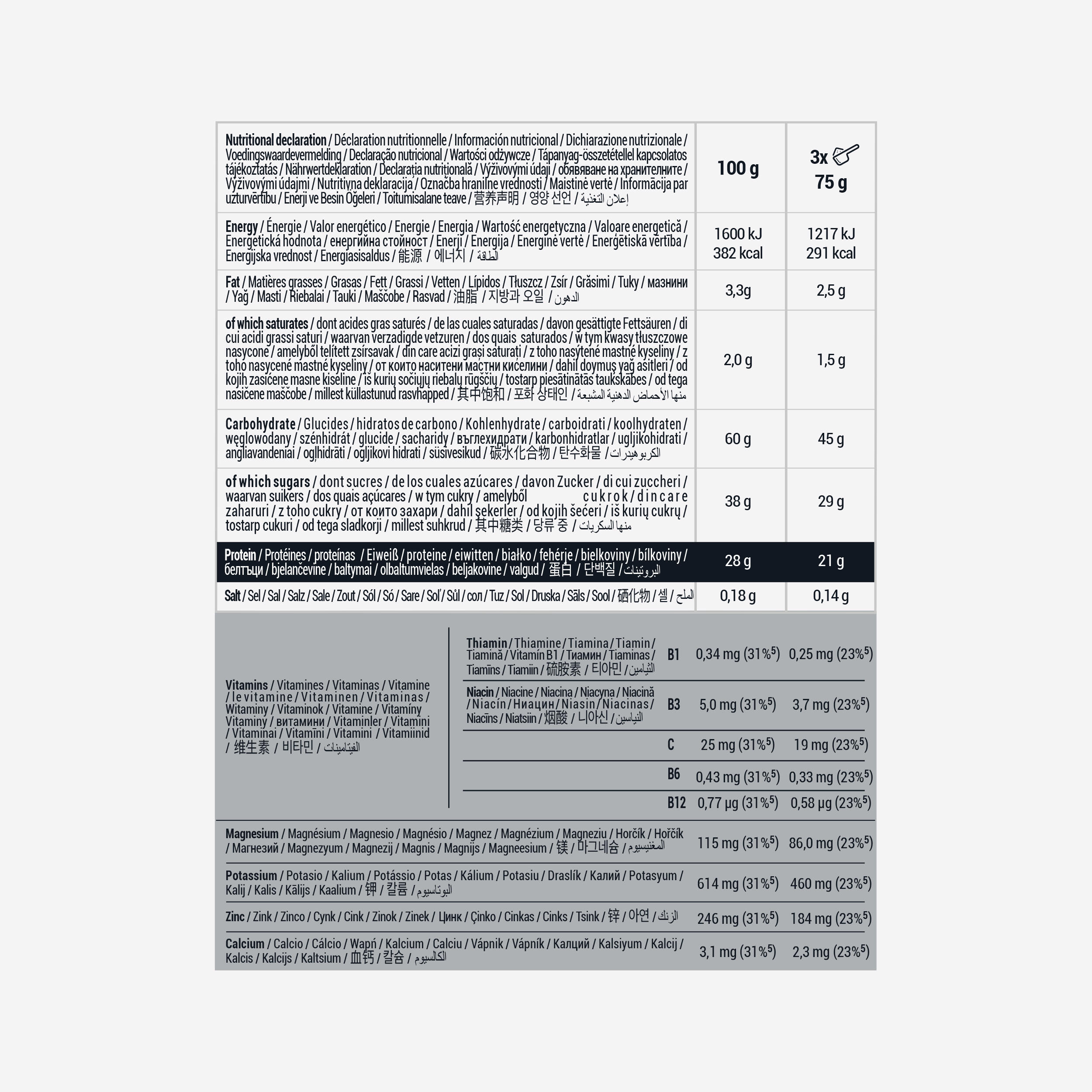Med intenzivnimi in dolgimi treningi vaše telo črpa iz svojih zalog ogljikovih hidratov*. S tem regeneracijskim napitkom, ki vsebuje 45 g ogljikovih hidratov in 21 g beljakovin**, lahko dopolnite svoje makro hranilne snovi: vitamin C, B6 in B12, cink in magnezij.