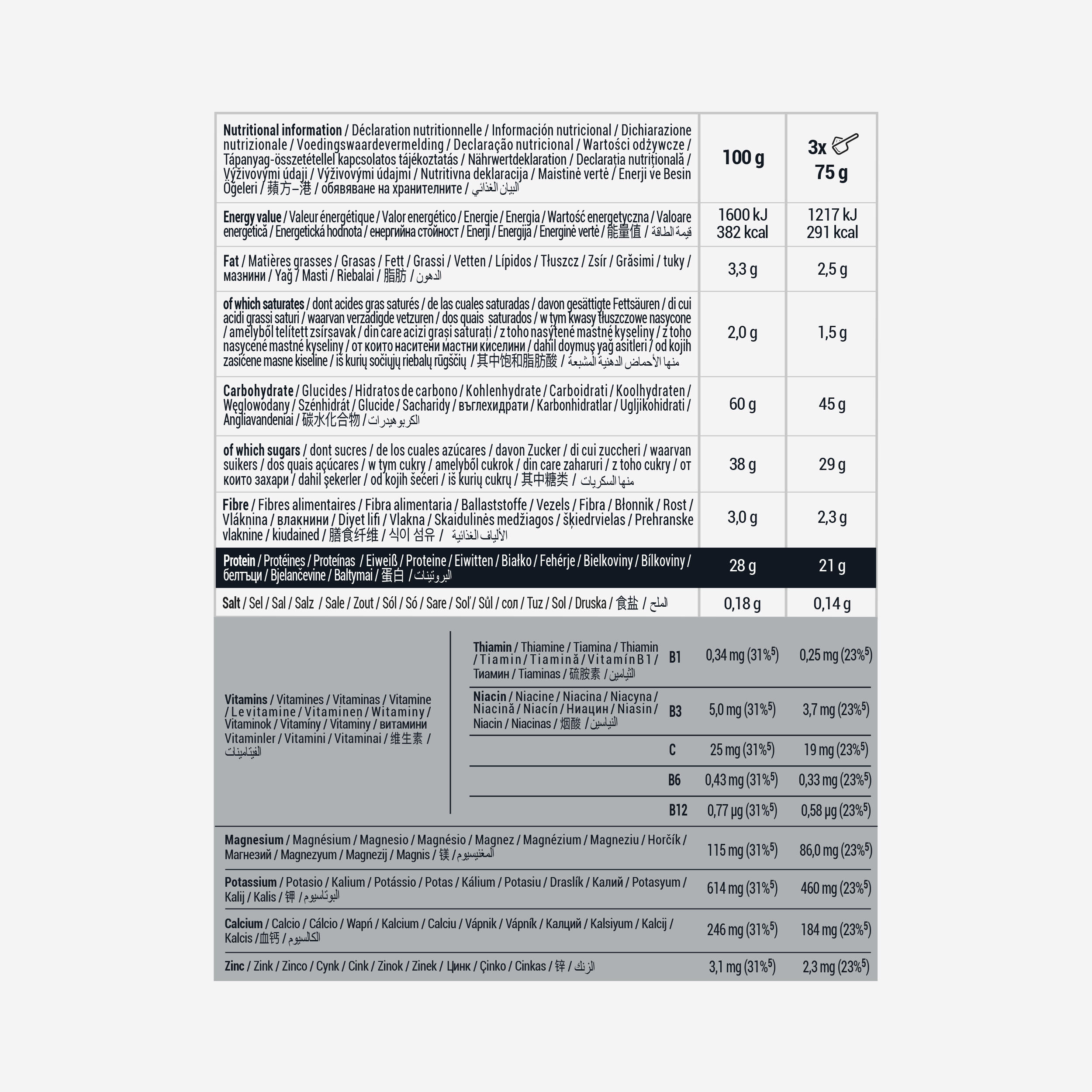 Med intenzivnimi in dolgimi treningi vaše telo črpa iz svojih zalog ogljikovih hidratov*. S tem regeneracijskim napitkom, ki vsebuje 45 g ogljikovih hidratov in 21 g beljakovin**, lahko dopolnite svoje makro hranilne snovi: vitamin C, B6 in B12, cink in magnezij.