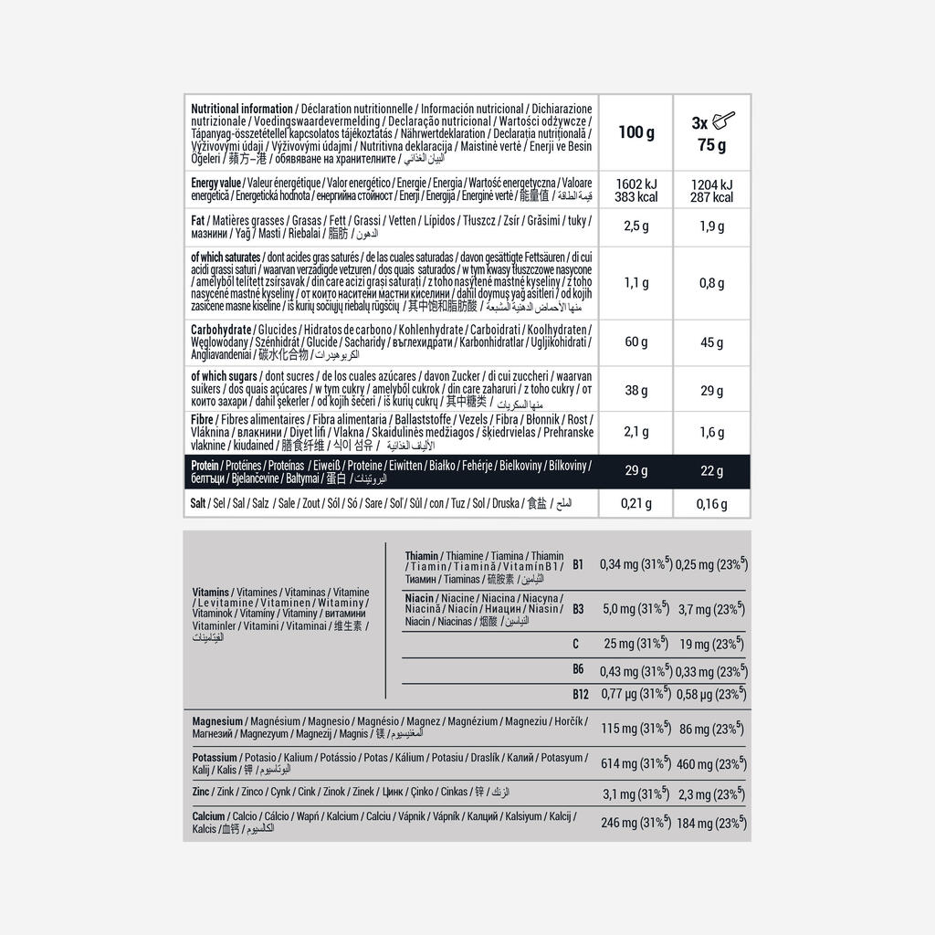 Shaker vsebuje 21 g beljakovin in 45 g ogljikovih hidratov za optimalno regeneracijo ter vitamine B6 in B12 ter magnezij za zmanjšanje utrujenosti. S tem paketom lahko naredite 8 mešalnikov.