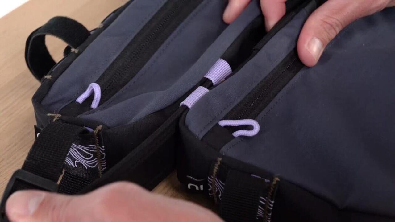 Torba za na okvir je stabilna in trpežna (ni vodoodporna). Je zelo praktična, saj ima dva žepa na zadrgo ter mrežaste žepe na notranji in zunanji strani.