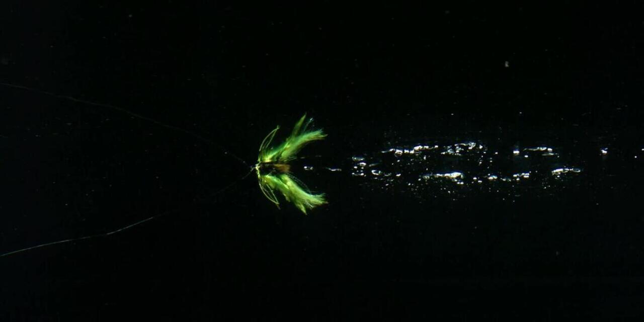 Cilj je posnemati žabo, ki plava po robovih, skozi trstičje in lokvanje. Z vsakim potegom bo voda pritisnila na vrat muhe, da se bo potopila navzdol in za seboj pustila sled mehurčkov. Počakajte, da se muha vrne na površje, da jo znova potegnete. Če muharite med vegetacijo, naredite premor, ko je muha na površini in tako pritegnite bolj premetene ribe. Zaščita trnka proti travi omogoča tudi prehod skozi dokaj gosto rastje.