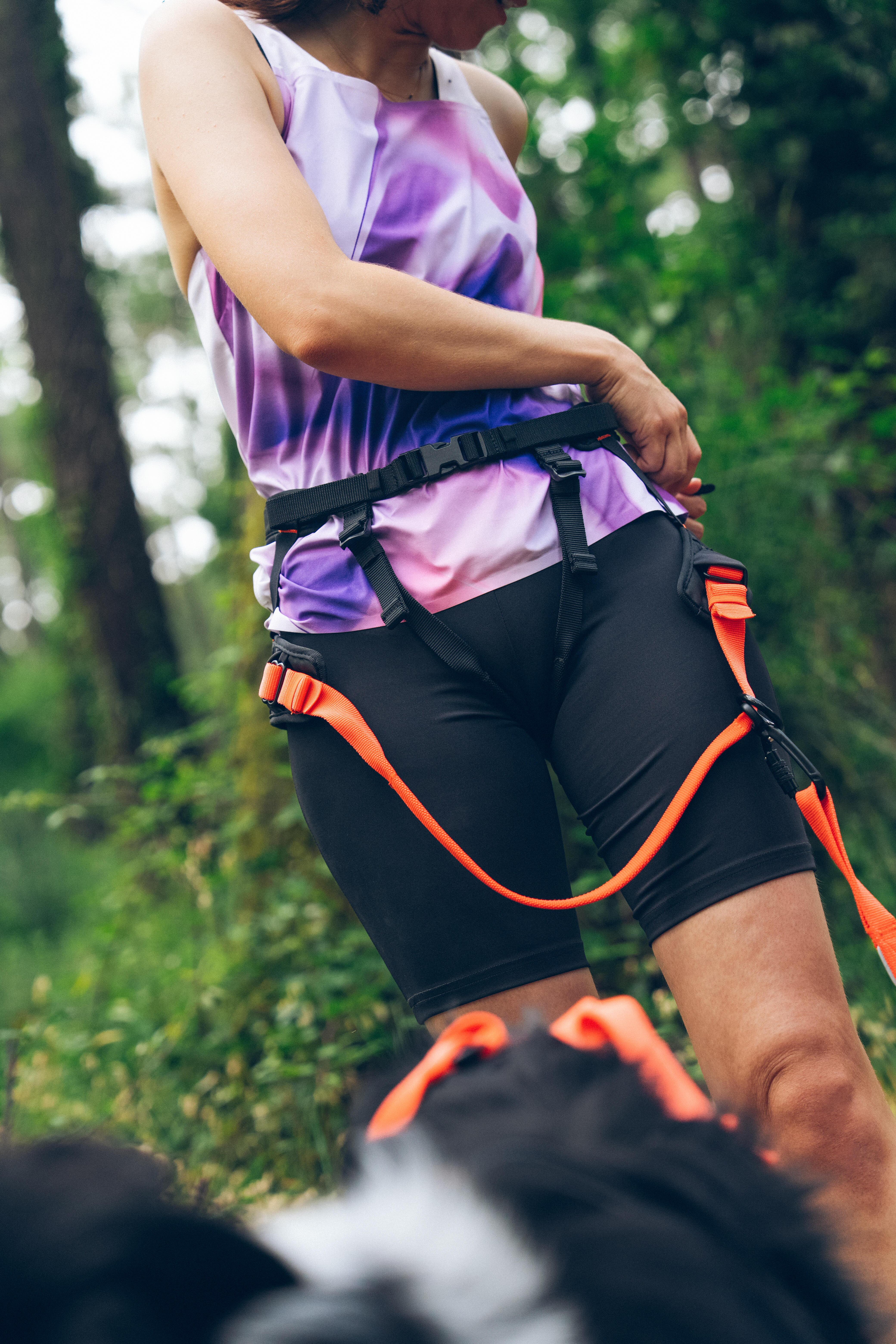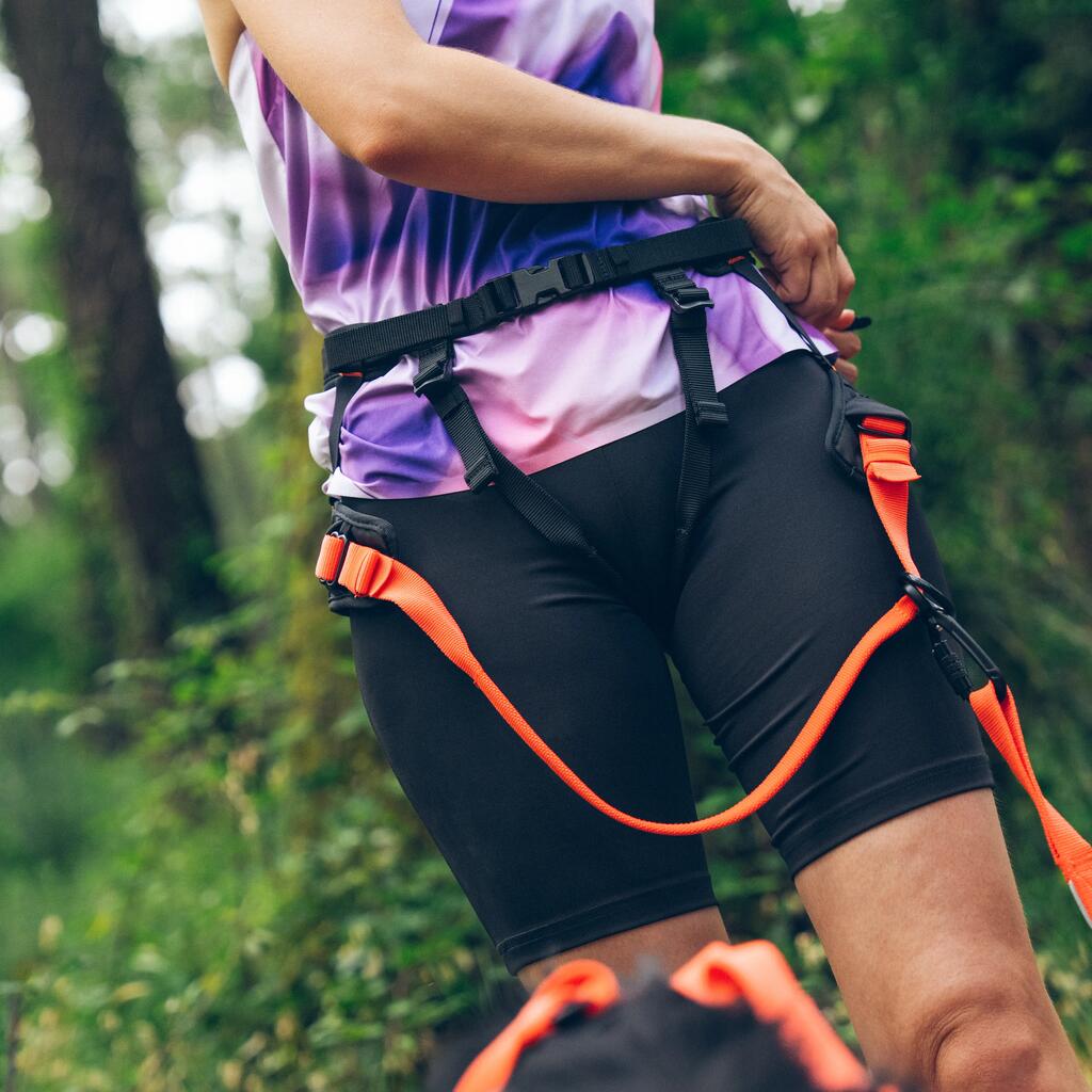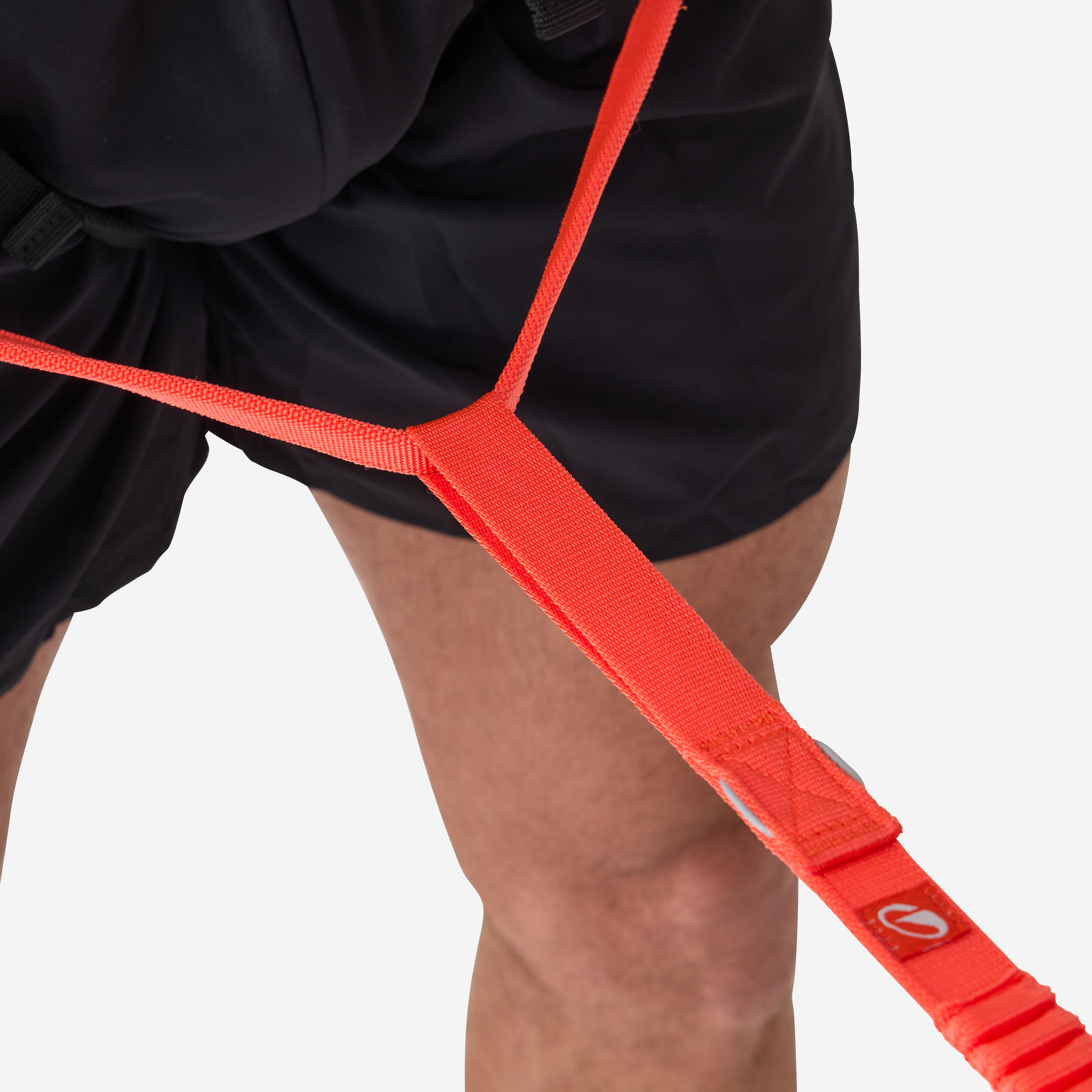 Eno nogo vtaknite skozi vsako zanko, pri čemer naj bo oranžni trak spredaj.