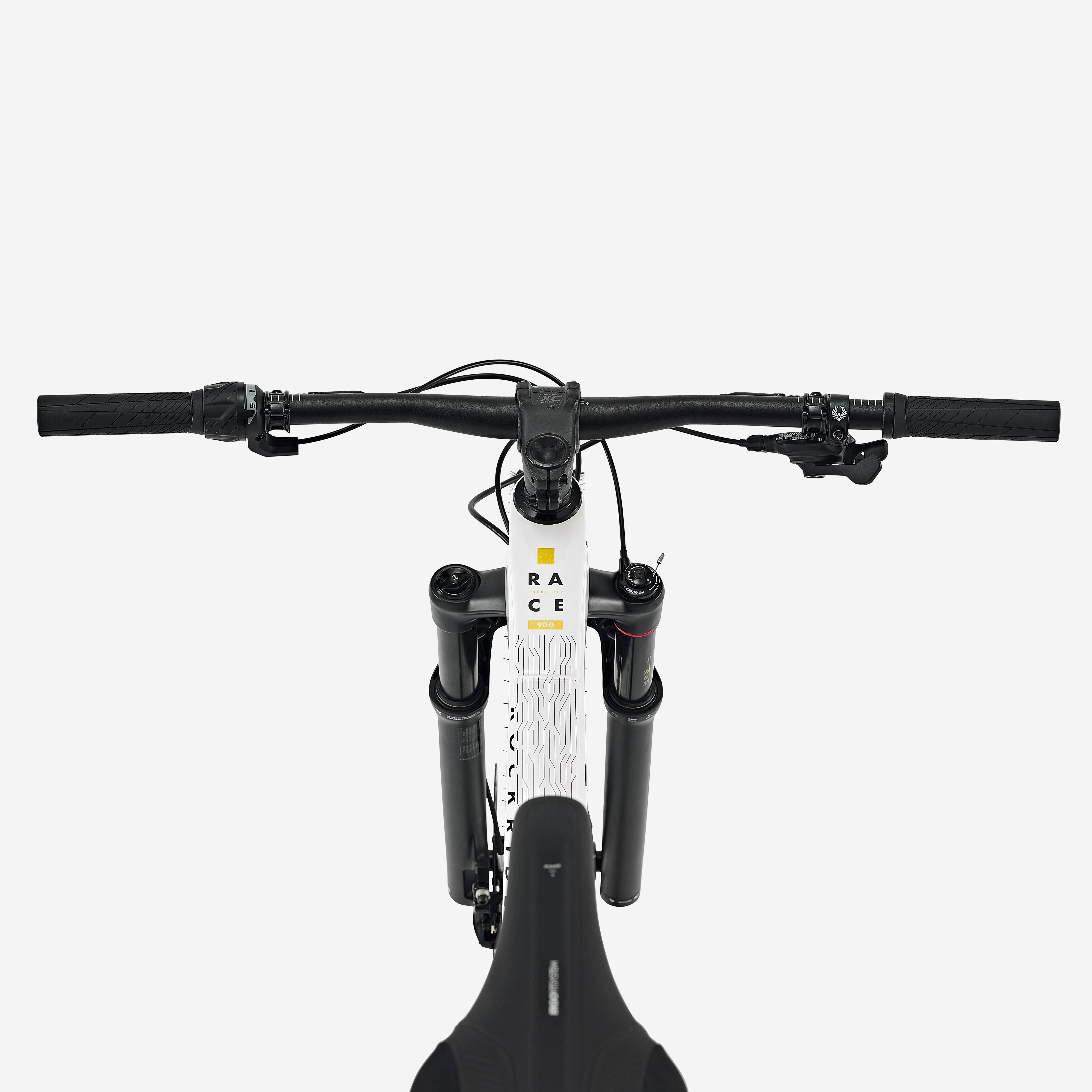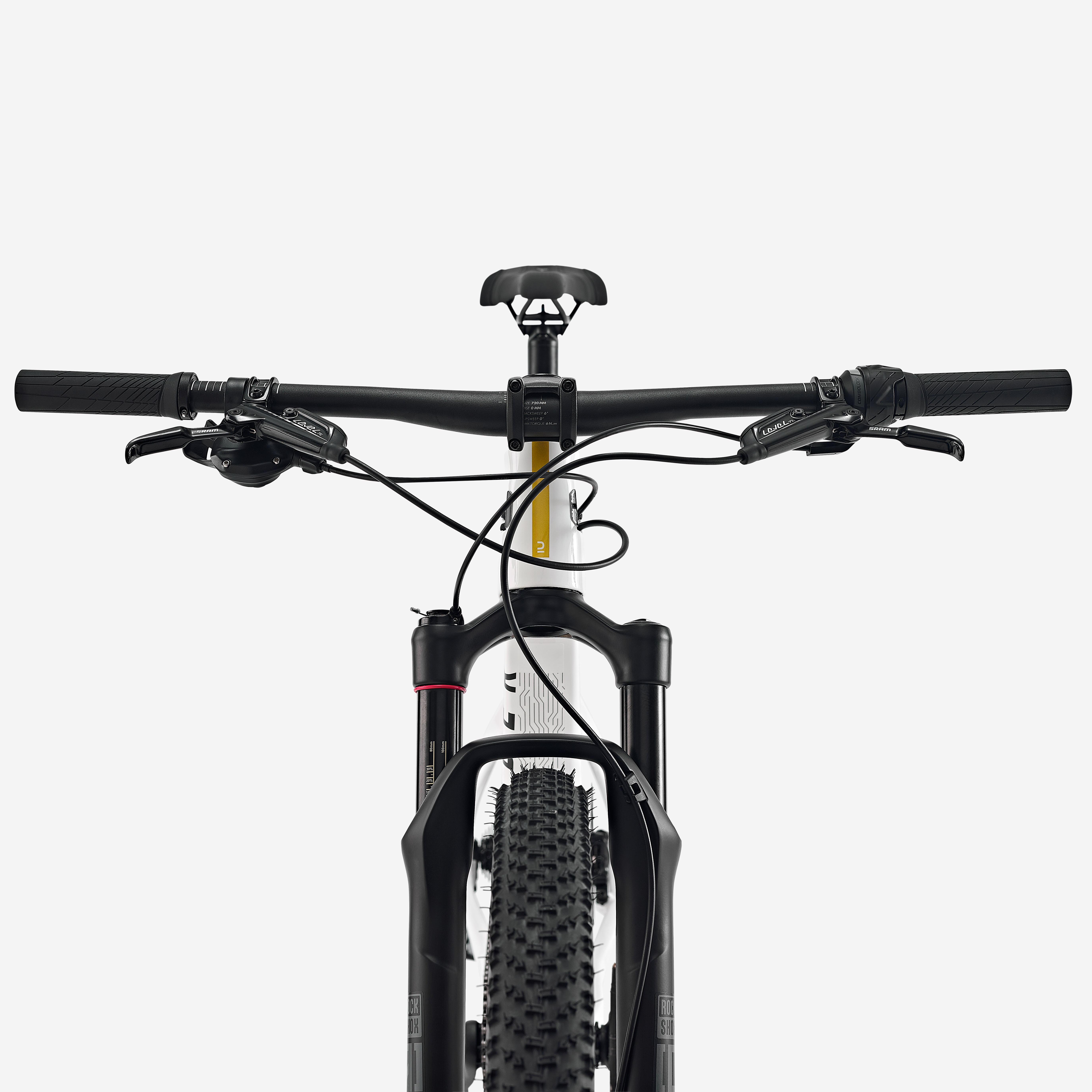 Rockrider nosilec iz aluminija: kot: -20°; 60 mm velikost S, 70 mm velikost M, 80 mm velikost L, 90 mm velikost XL. Ravno Rockrider iz aluminija, širina: 720 mm, naklon: 6,5°, 256 g. Rockrider 900 Lock On.
