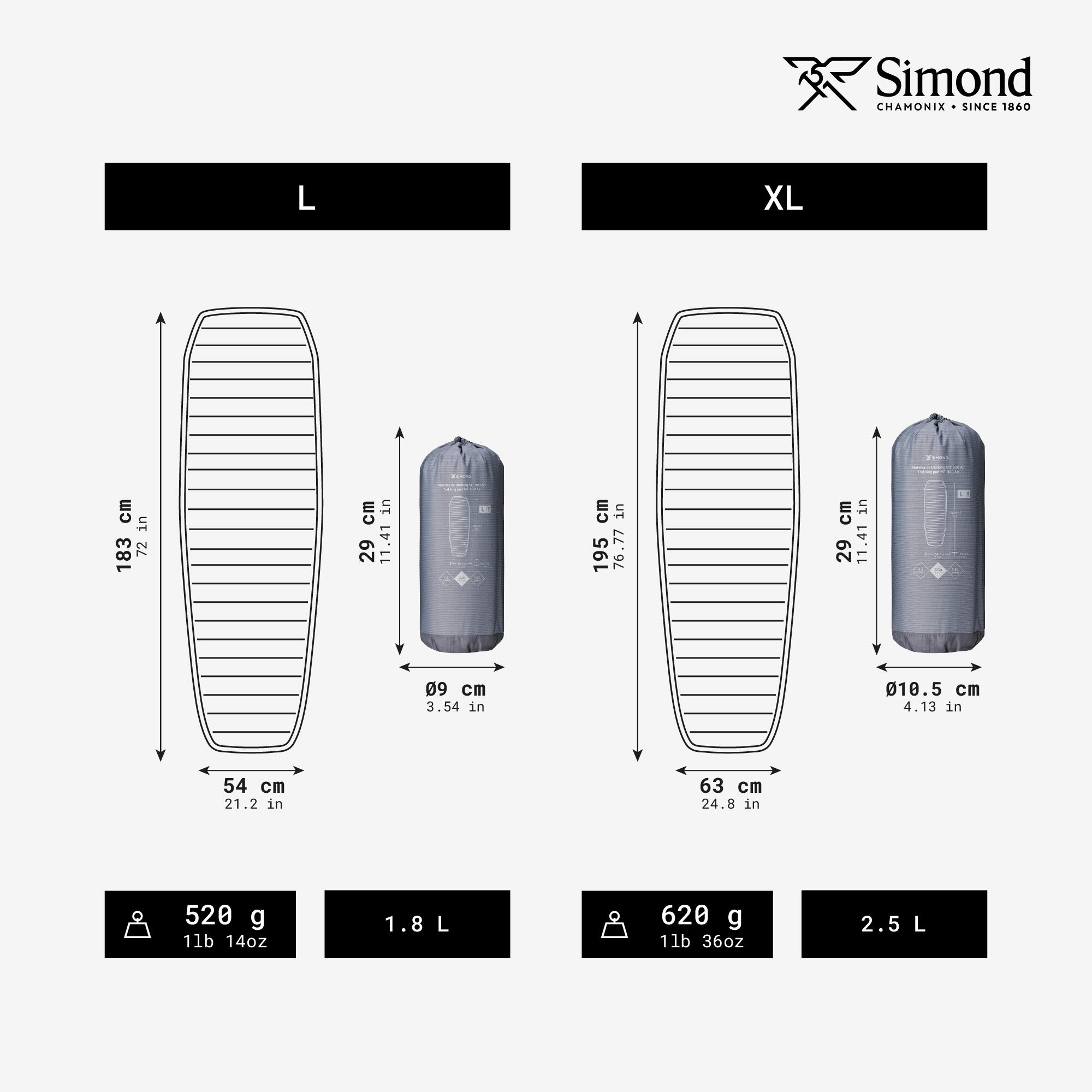 Velikost L meri 183 x 54 cm, velikost XL pa 195 x 63 cm.