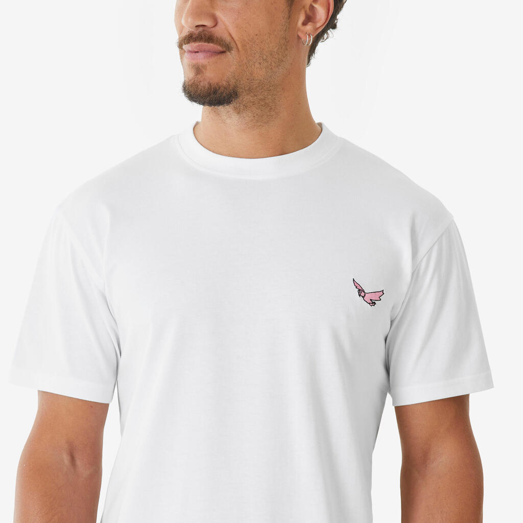 Ta majica s kratkimi rokavi učinkovito odvaja znoj zahvaljujoč mešanici bombaža in poliestra, hkrati pa ostaja lahka in trpežna.