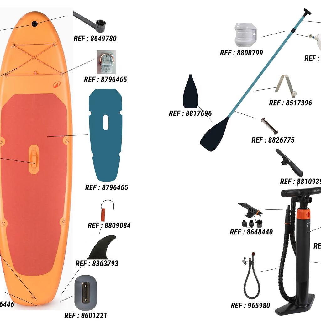 Deska SUP 10’6 ,nastavljivo veslo, smernik, vrvica, priročnik. Krpa za popravilo (lepilo ni vključeno). Ključ za ventil (za uporabo, ko je SUP prazen), nahrbtnik, ročna tlačilka.