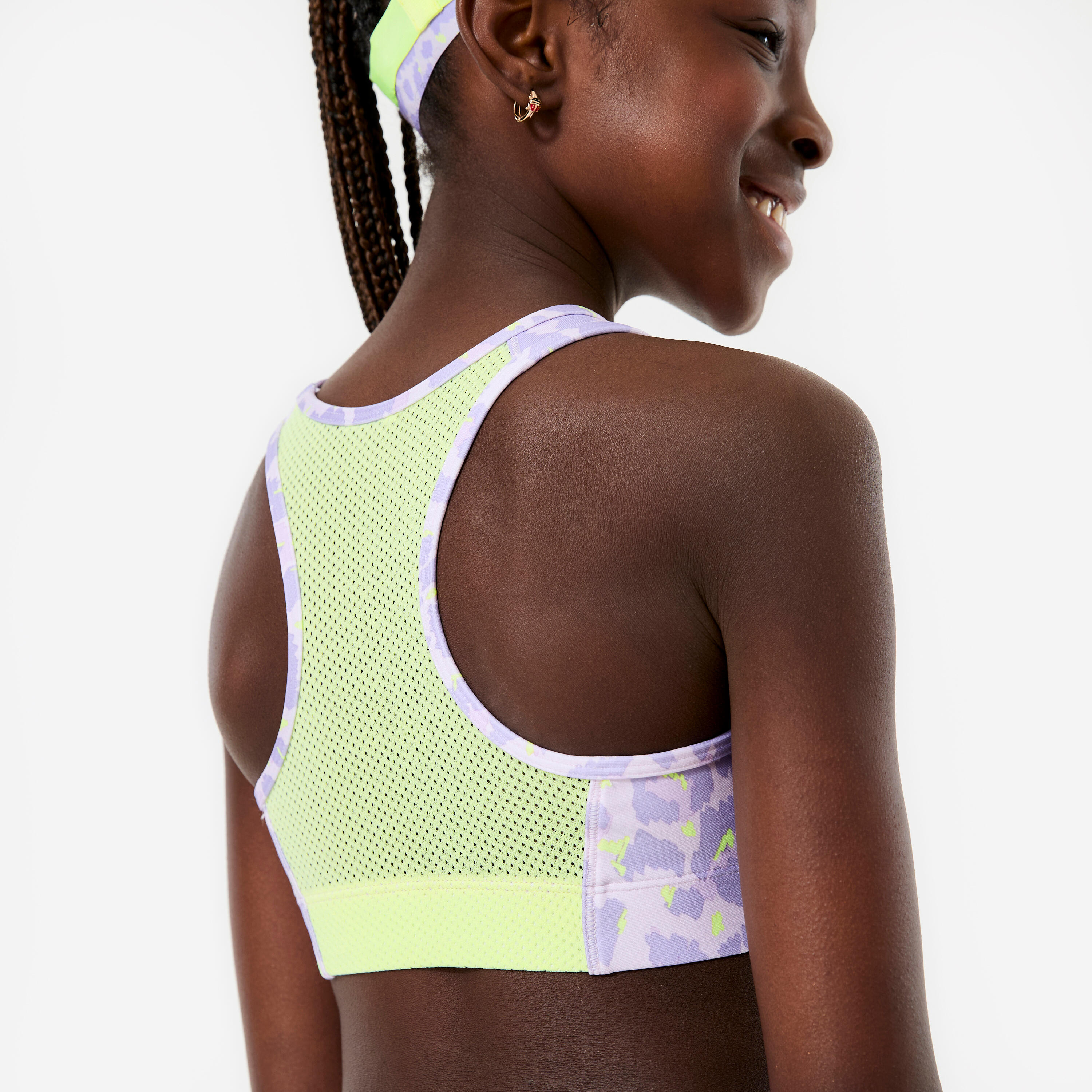 Naš cilj:nudimo dekletom vse kar potrebujejo, da lahko samozavestno vadijo.Razlika je v podrobnostih:- Kroj: okrogel izrez spredaj, brez vidnega oprsja, ko se sklonite, in izrez na hrbtu, da so vaša ramena prosta in se lažje gibate. - Prilagojena dolžina omogoča, da nedrček vedno ostane pod prsmi, tudi ko imate dvignjene roke. - Podloga na sprednji strani za boljšo pokritost. - Zračen material v predelu hrbta.