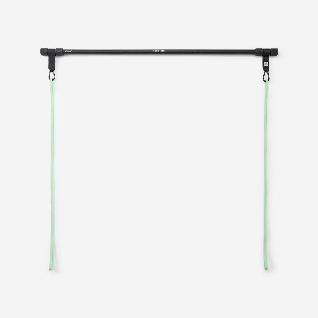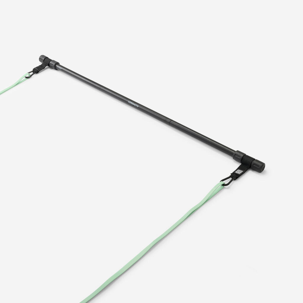 Kombinacija palice in trakov nežno razvija vašo moč in zmogljivost, ne da bi preveč obremenjevala vaše sklepe. Prilagodite dolžino palice svojim vajam in zamenjajte 10-kilogramske trakove z močnejšimi trakovi (do 35 kg), ko postanete močnejši. Skenirajte QR kodo za dostop do celotnih vadb. Zaradi 3-delne zasnove je ta komplet resnično kompakten. Spravite ga v svojo športno torbo in trenirajte, kjer koli želite!