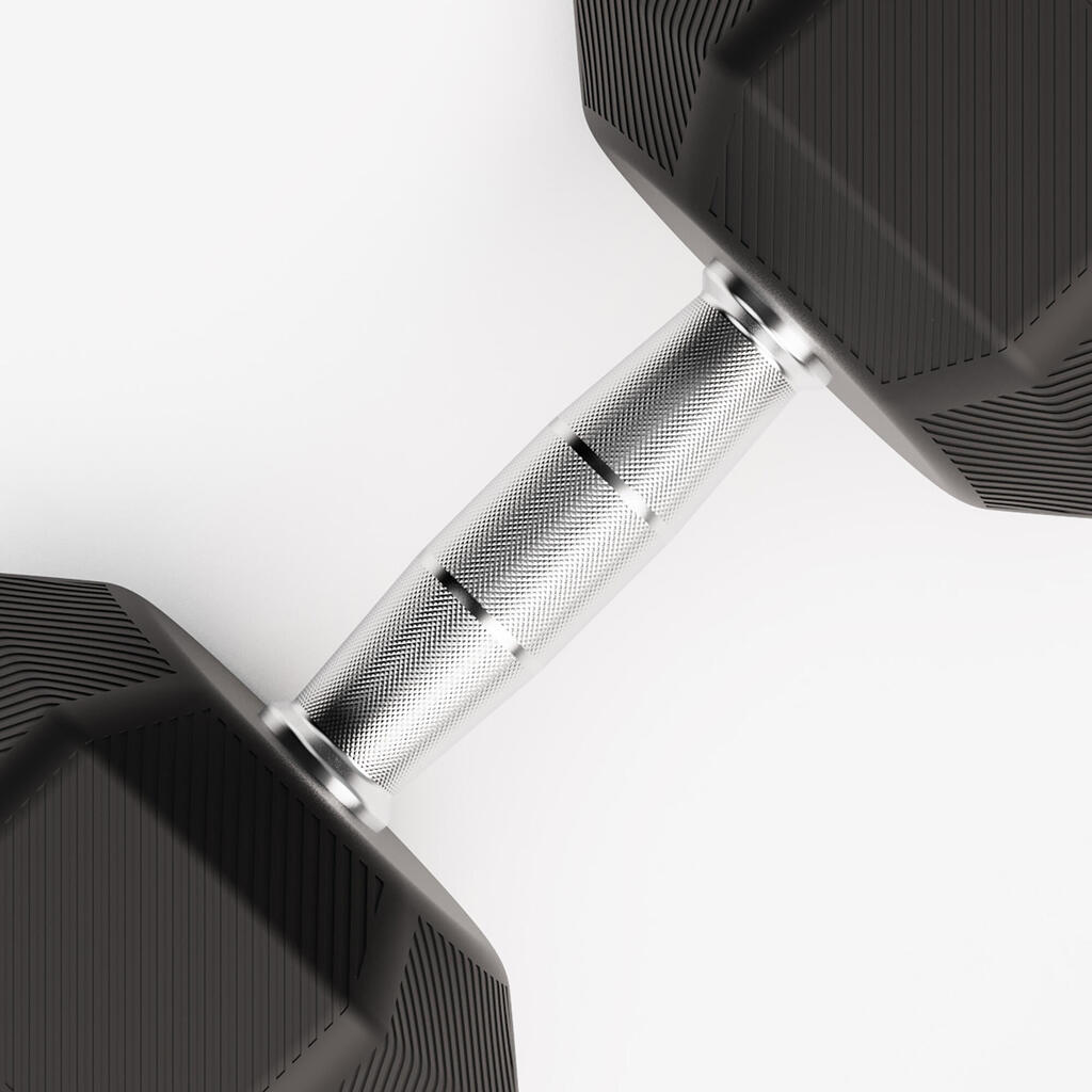 Šest stranic za popolno stabilnost:Pozabite na uteži, ki se po padcu odkotalijo.Kar zadeva gumo, ta absorbira udarce, ščiti vaša tla in opremo, hkrati pa znatno zmanjša hrup.Ta tehnična zlitina zagotavlja gladke vadbe, ki ne bodo poškodovale vašega vadbenega območja.