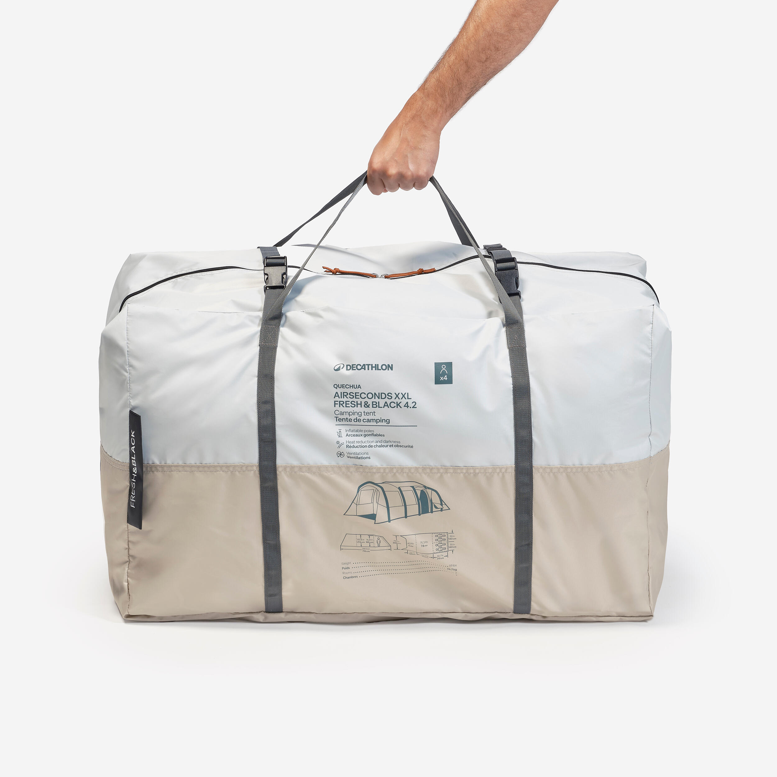 Temnejši in hladnejši šotor za boljši spanec. Tehnologija Fresh & Black, ki jo je patentiral Decathlon, omogoča odbijanje sončnih žarkov in nudi izolacijo pred svetlobo. Da bi kar najbolje izkoristili to tehnologijo, šotor ponoči prezračite.