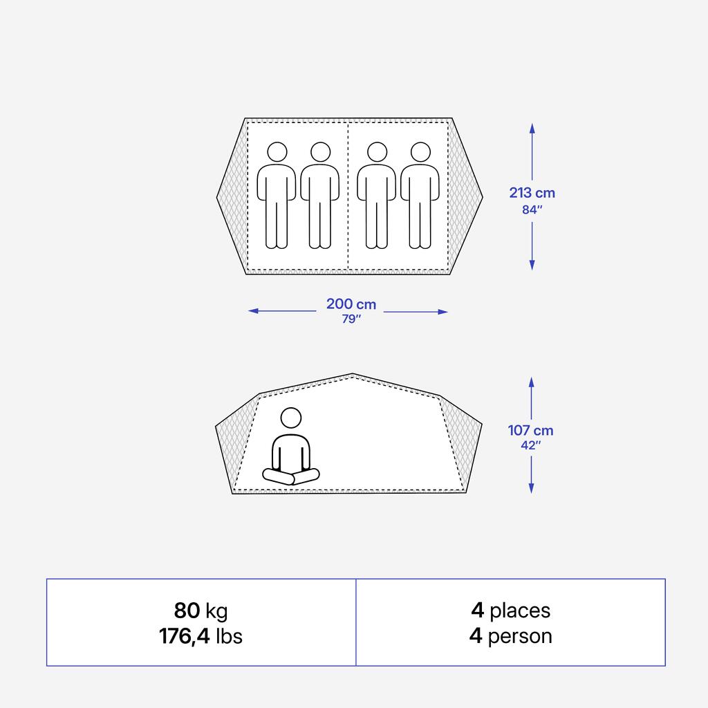 Mere odprte spalnice: dolžina 200 in širina 213 cm. Višina notranjega šotora je 110 cm na sredini in 87 cm ob straneh. Blazina je debela 6 cm za optimalno udobje. Mere zaprtega šotora: 210 x 115 x 30 cm.